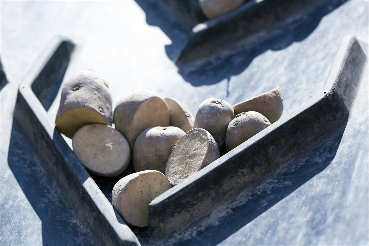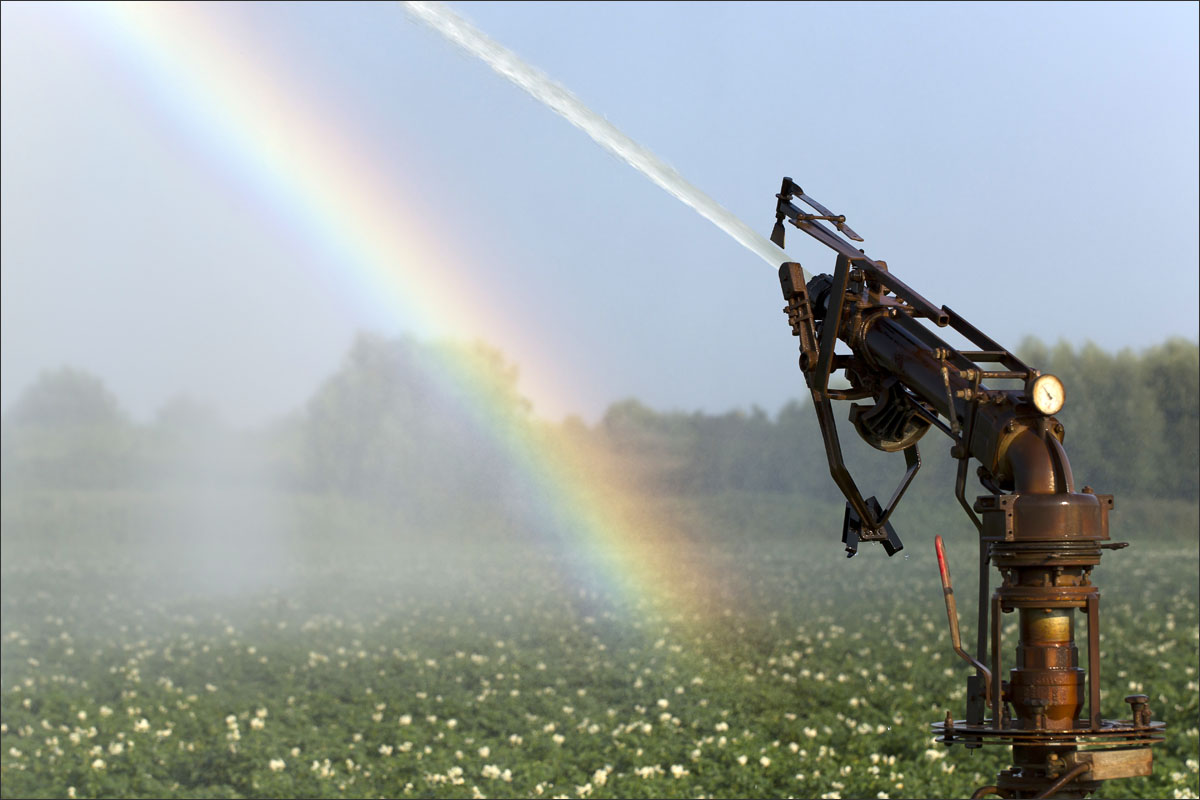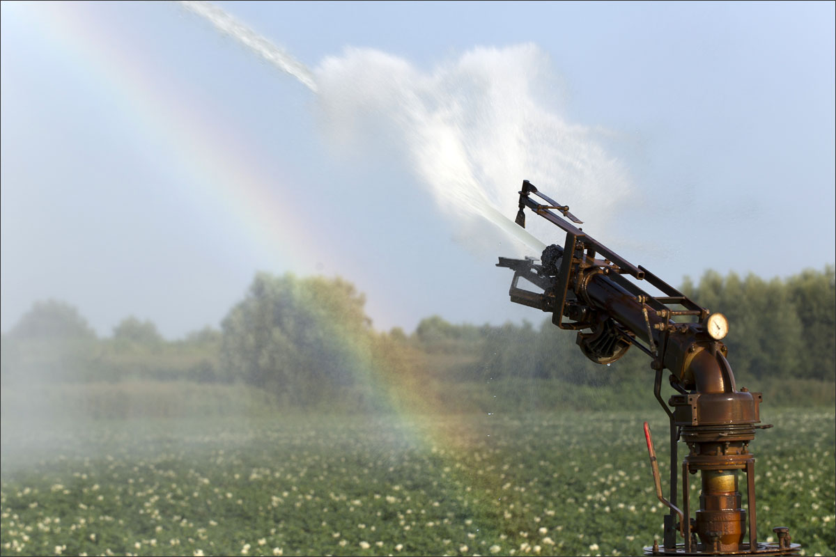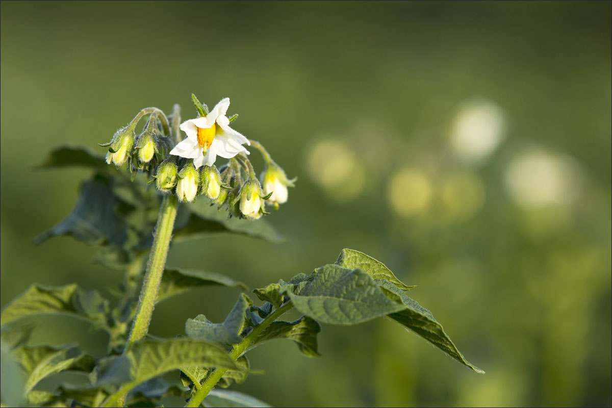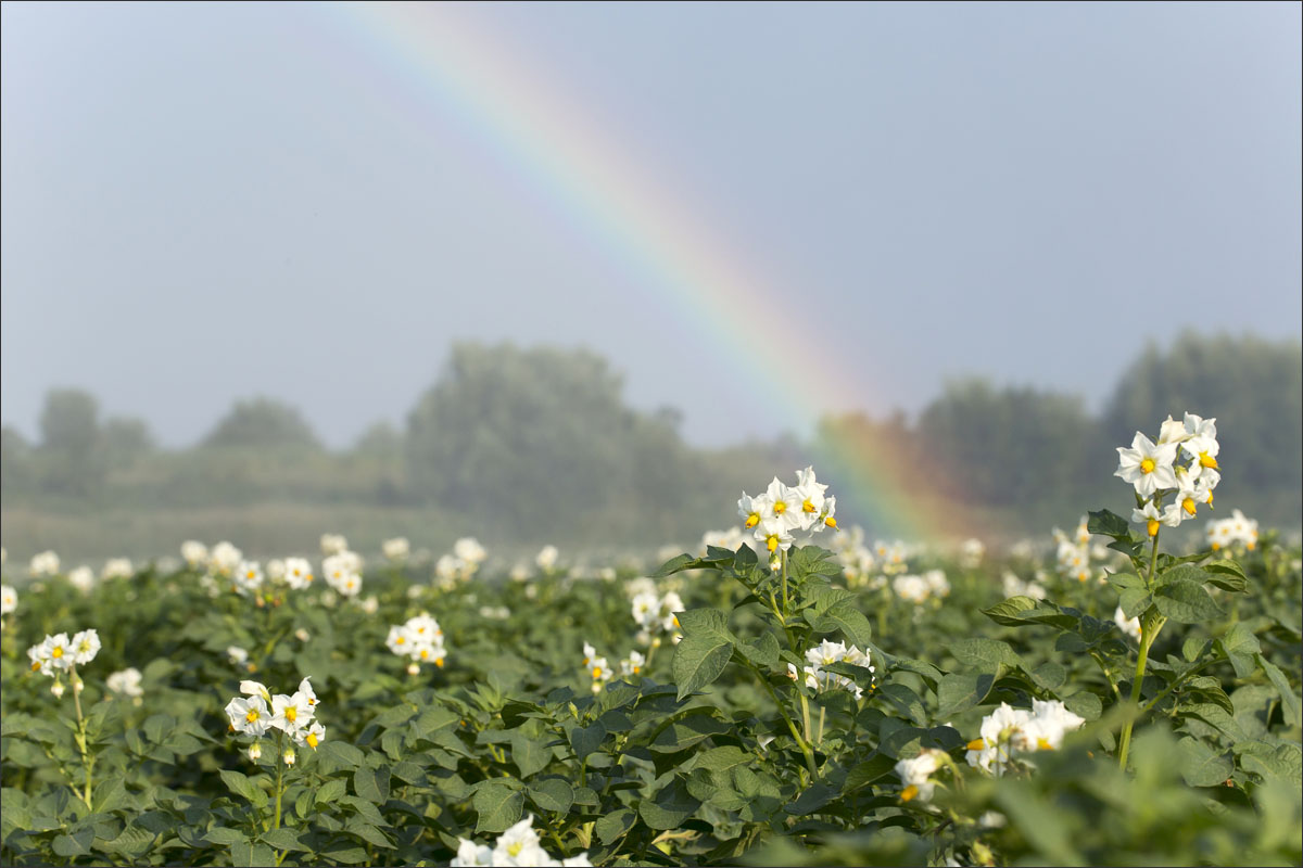 Foto’s van o.a. het poten van gesneden pootgoed, jonge aardappelplanten, aardappelbloesem, het schoffelen en losmaken van de aarde tussen de aardappelruggen en het beregenen van de aardappelakker.