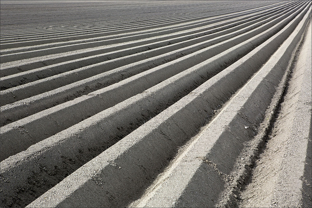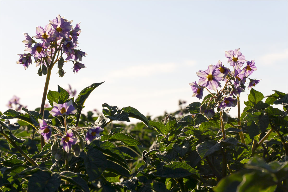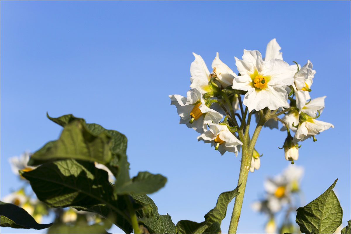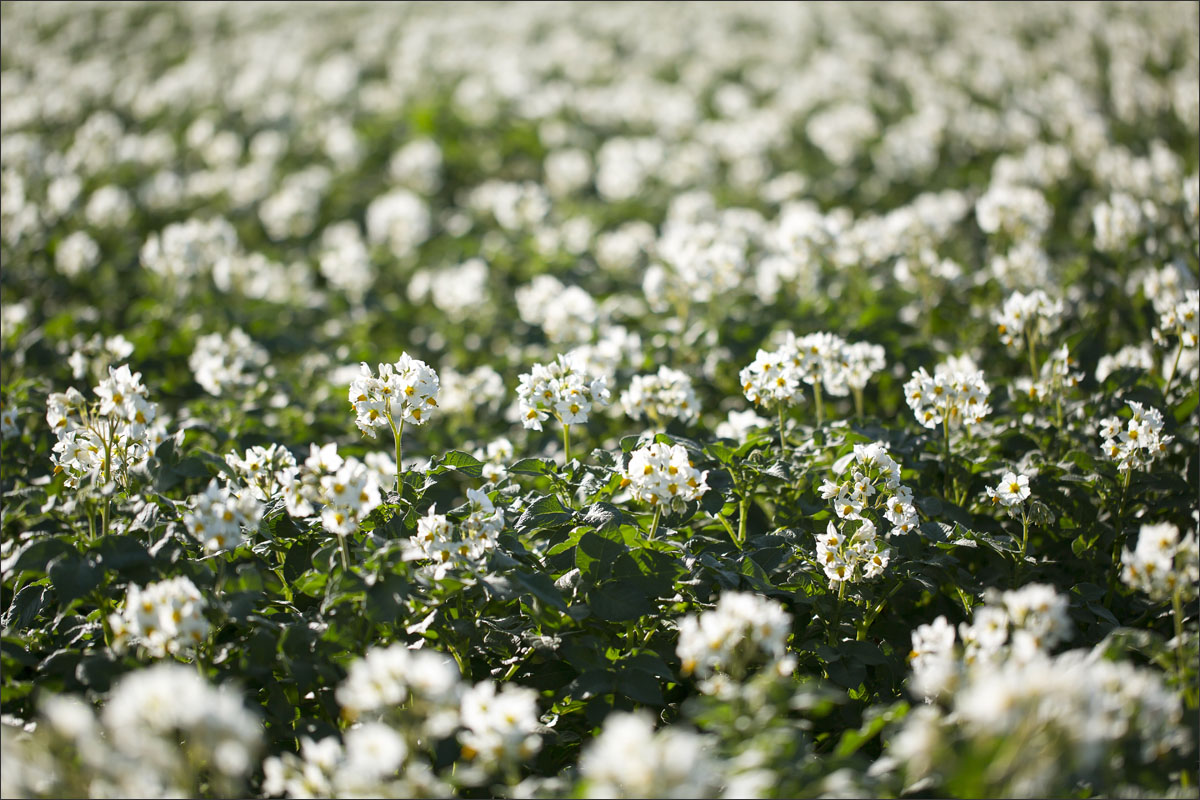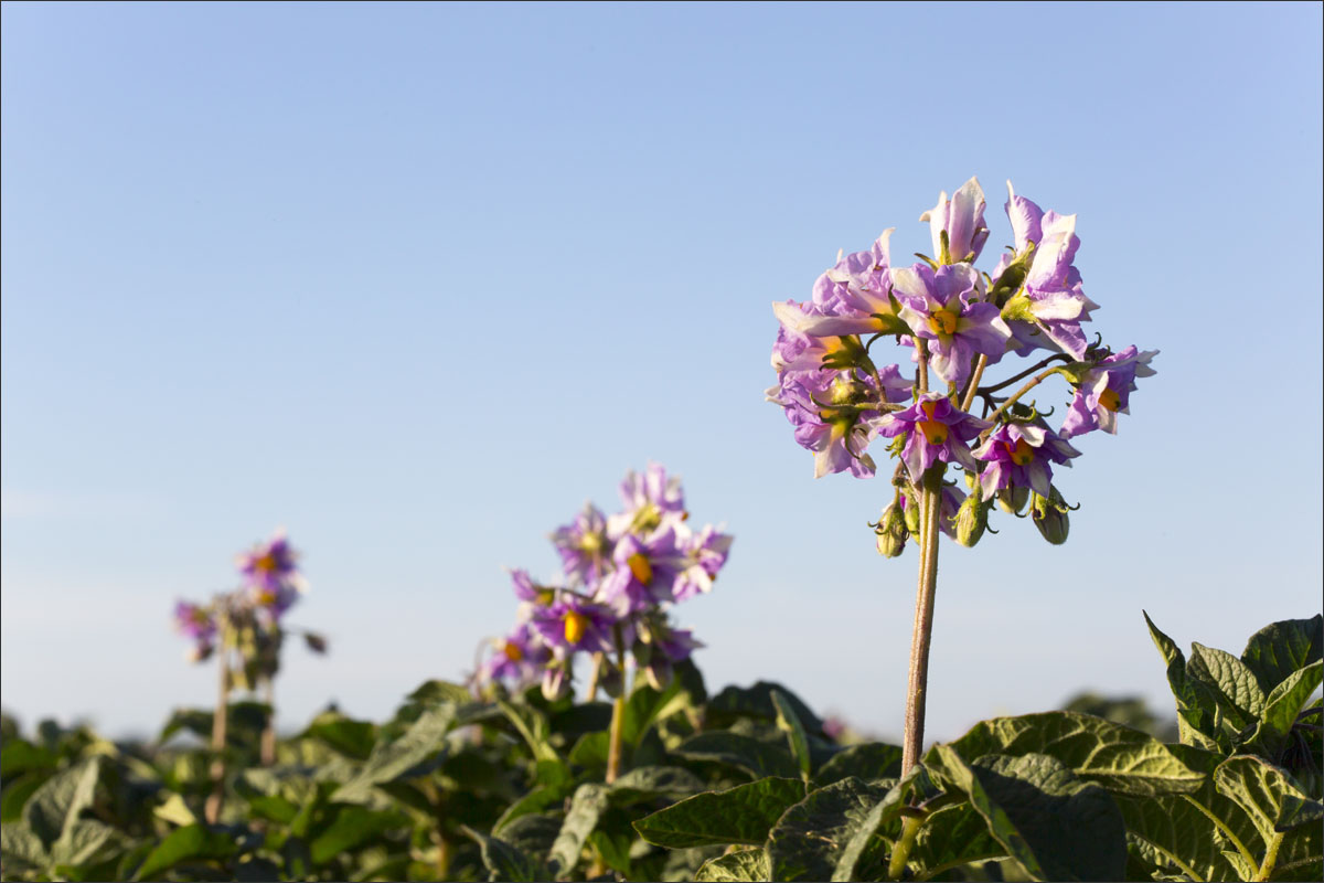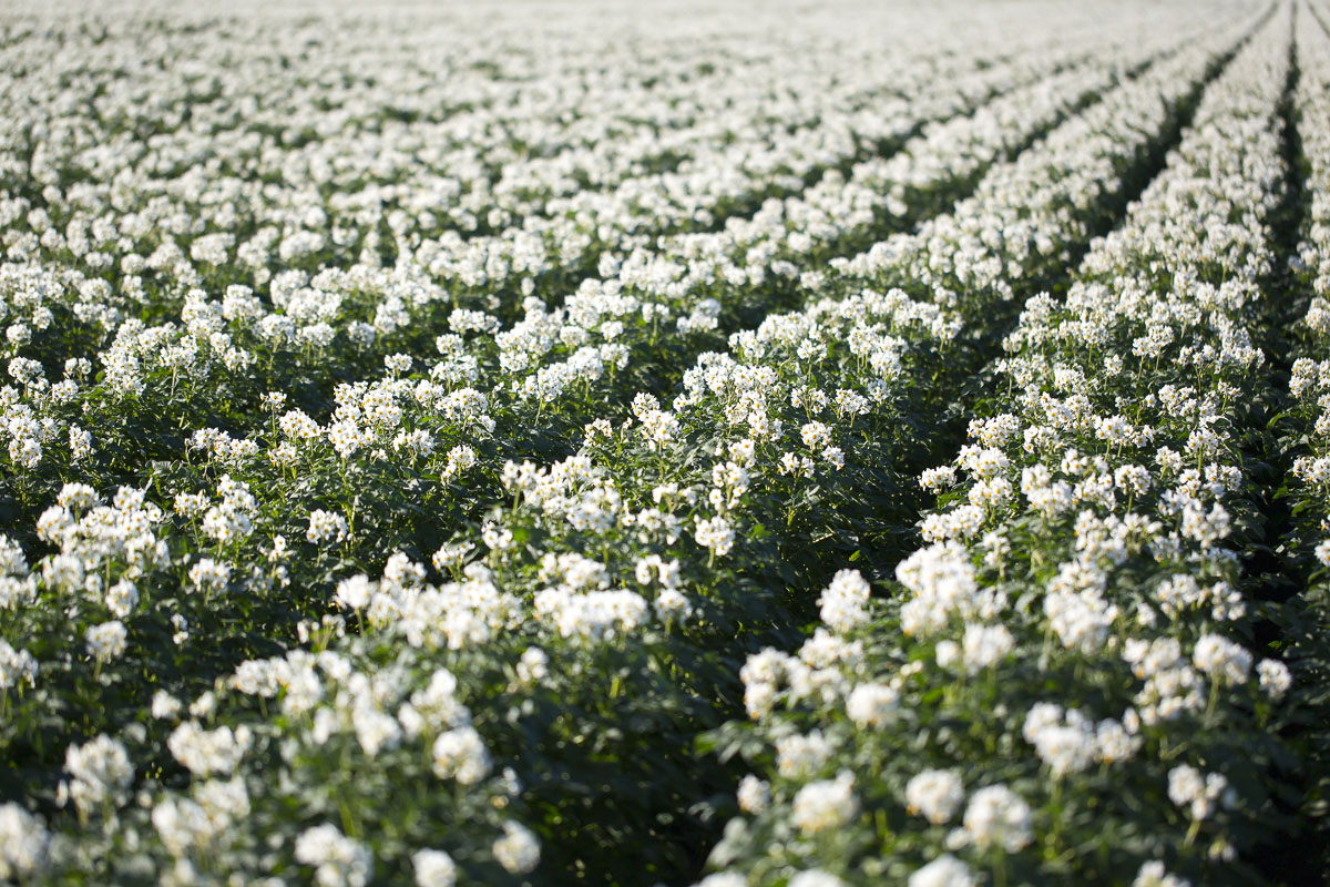 Foto’s van het poten van de aardappelen, de groei van de planten op de ruggen en de akker vol met bloesem.
