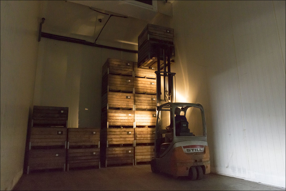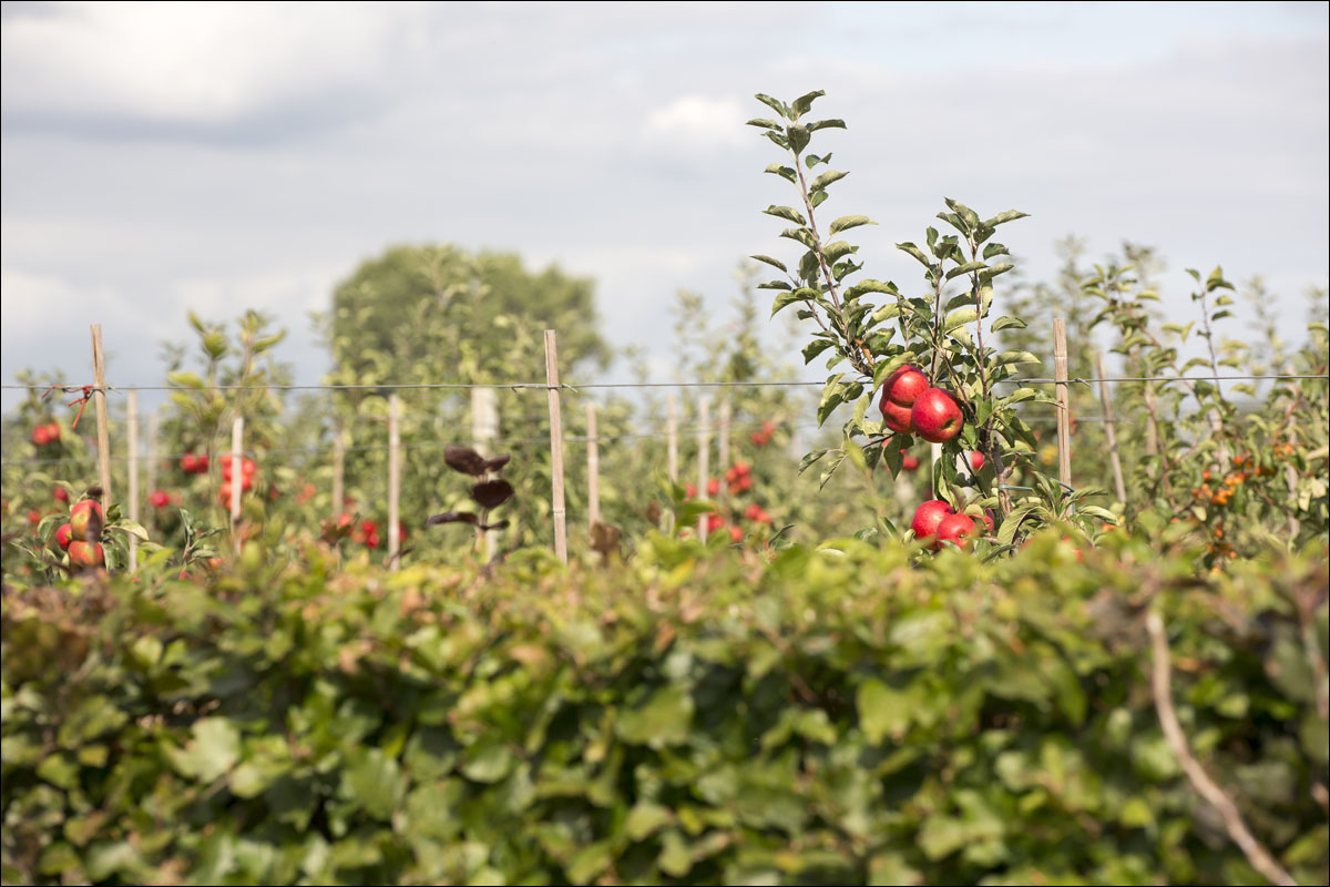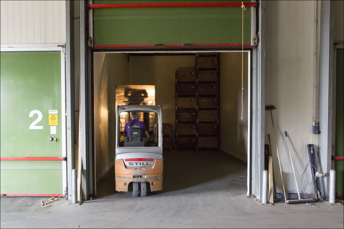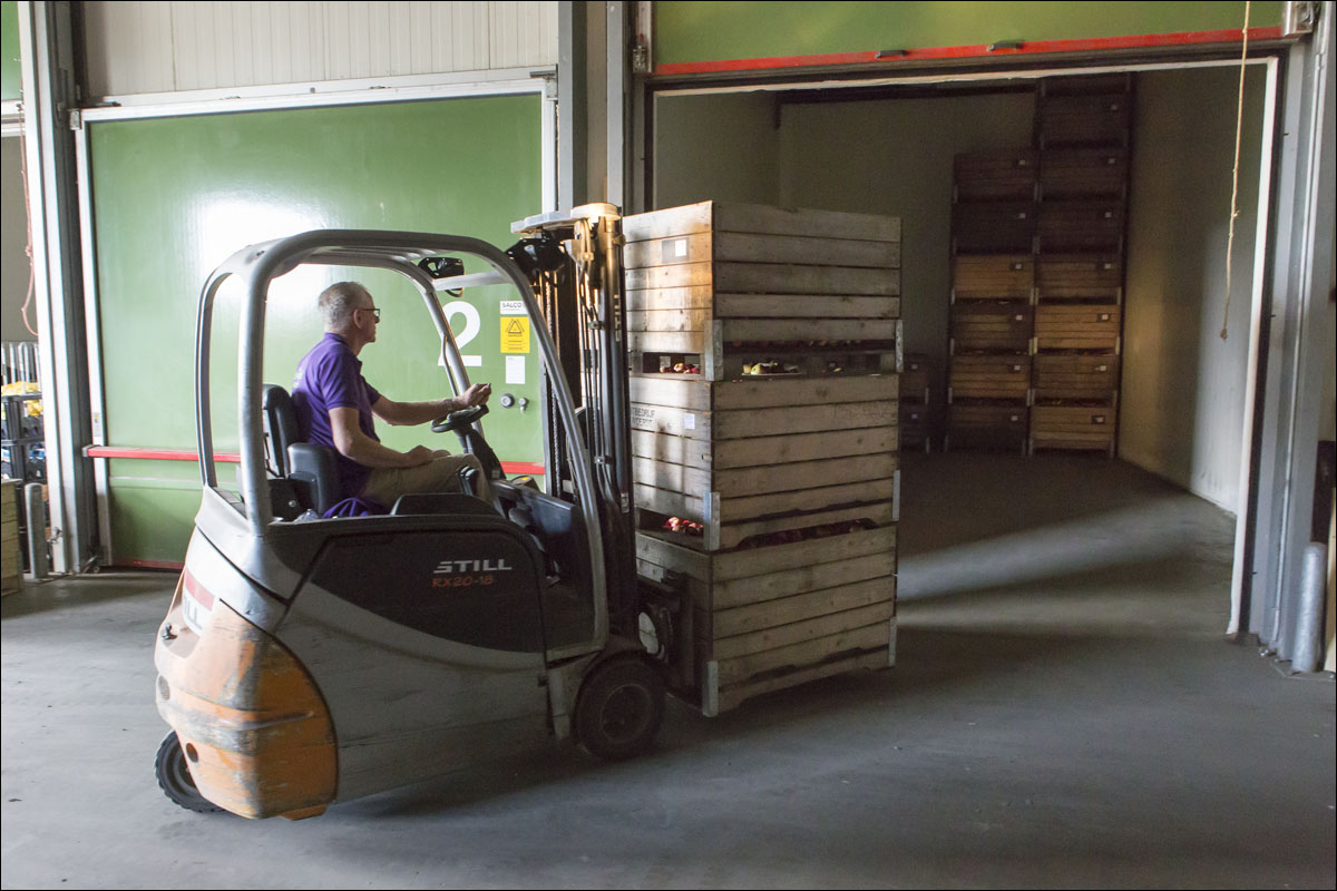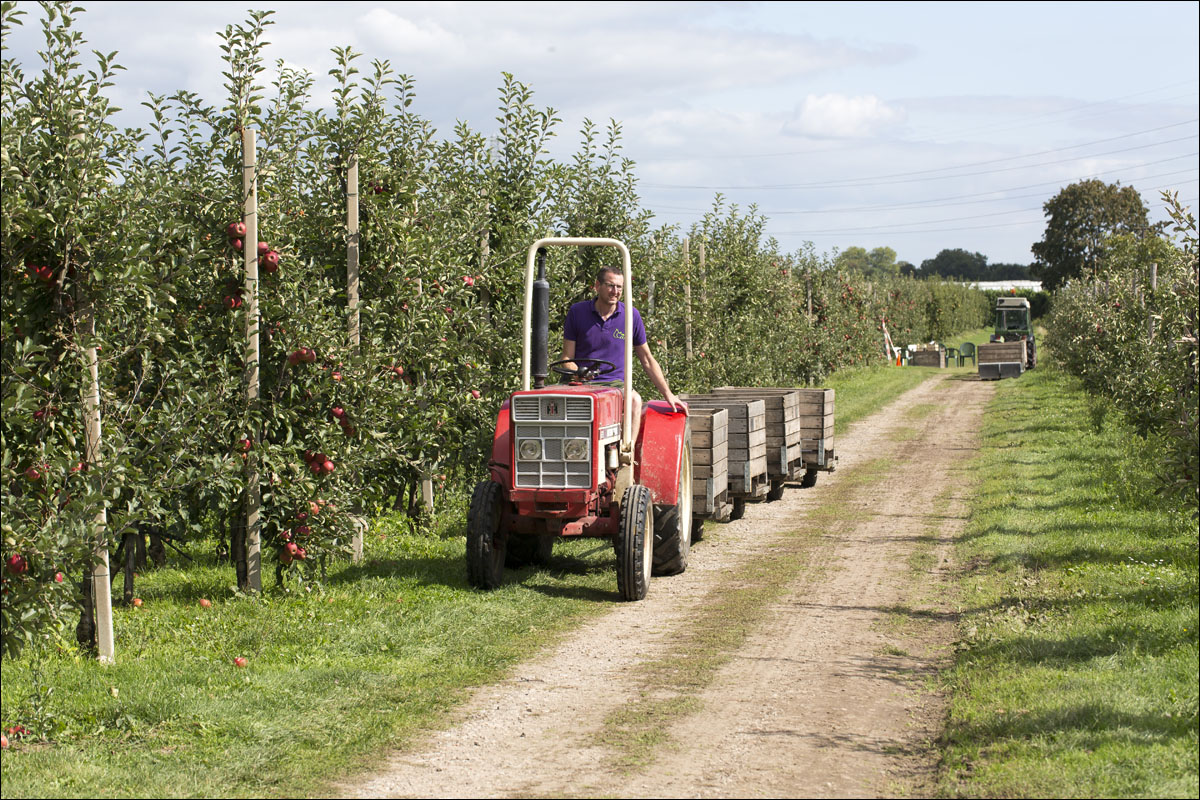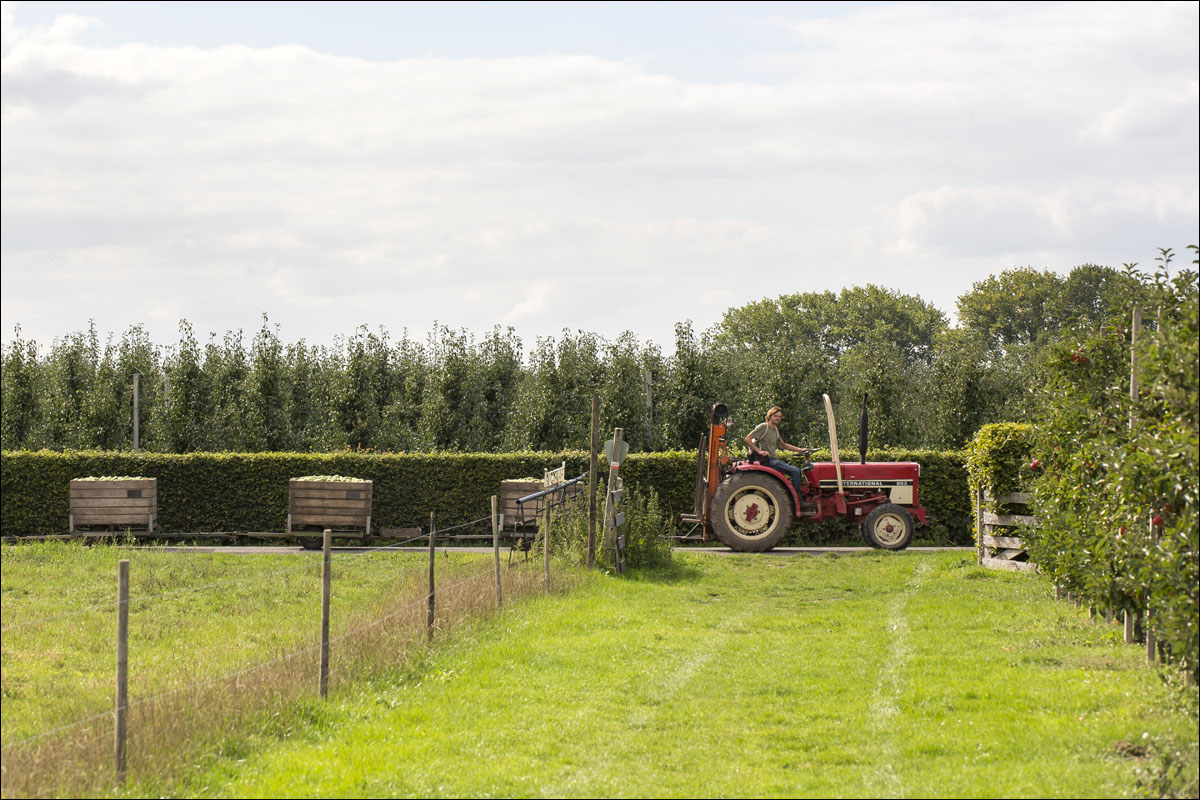 Foto’s van het appels plukken, de appelboomgaard en de opslag van het fruit in de koelcel.