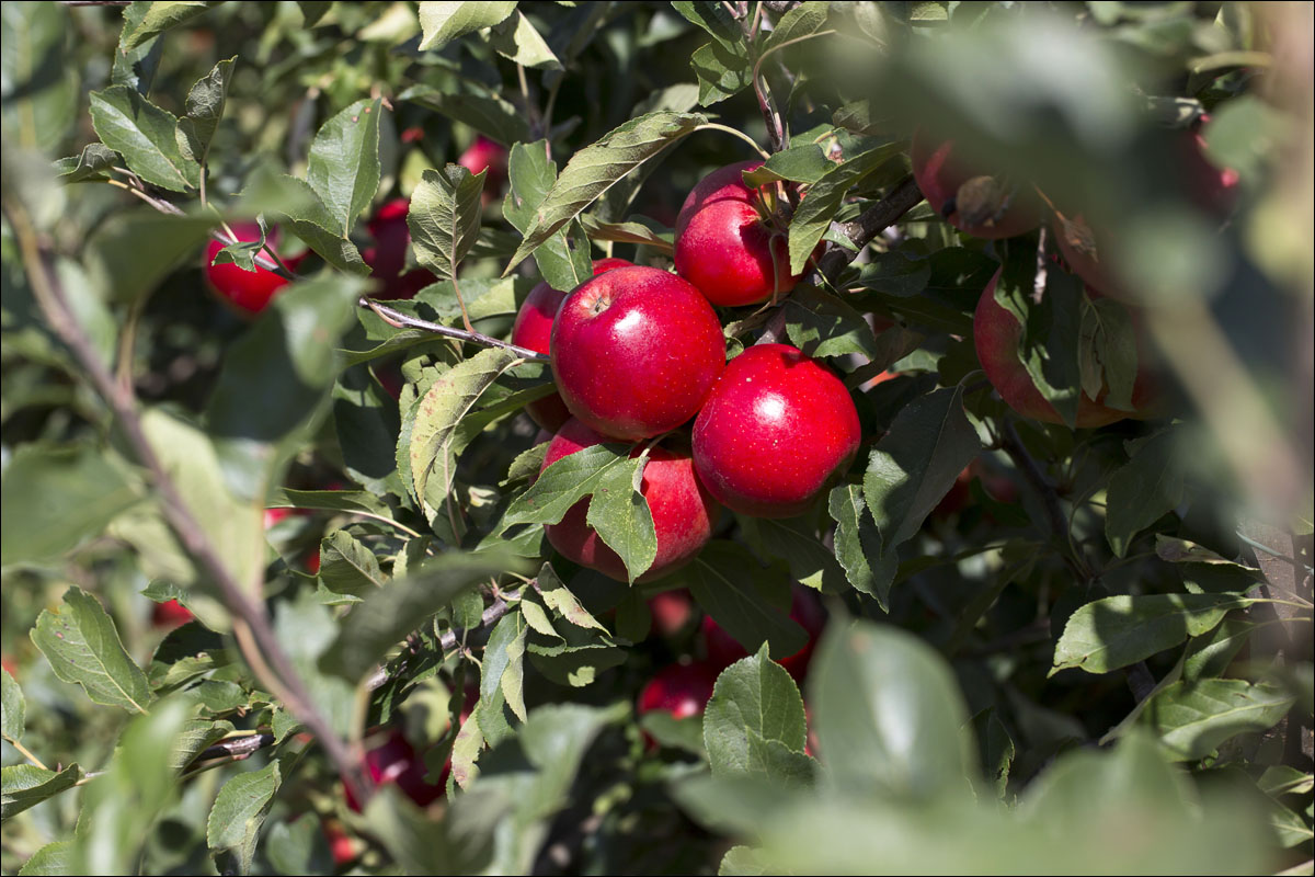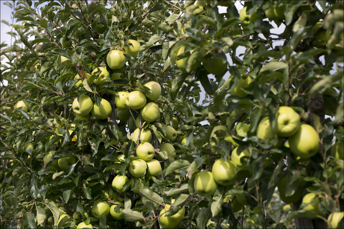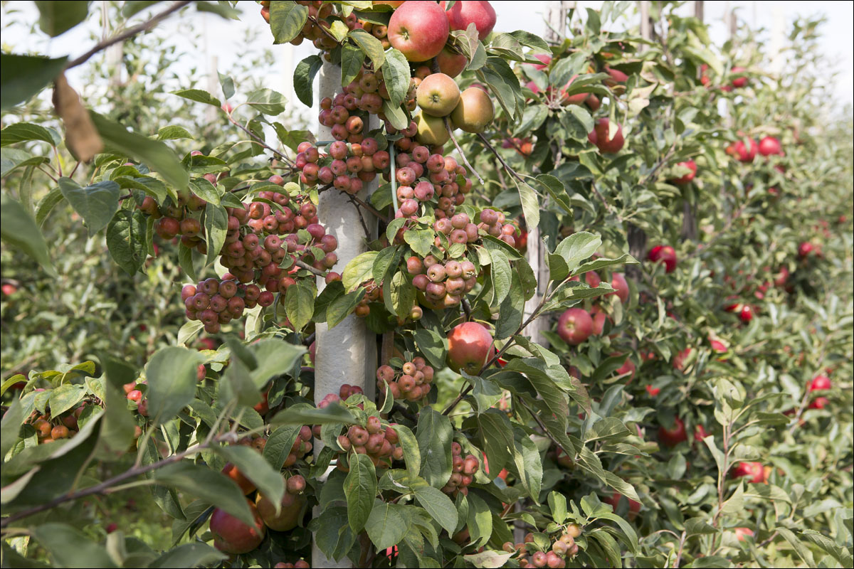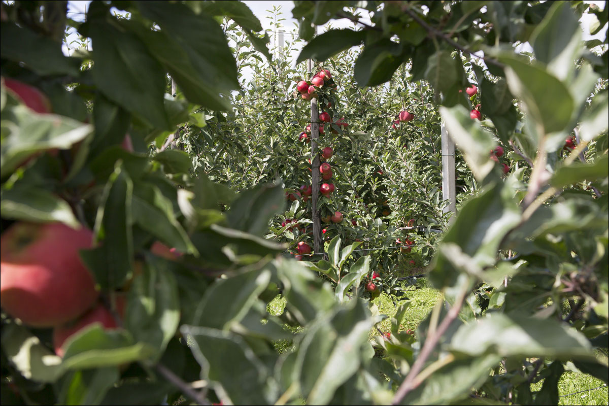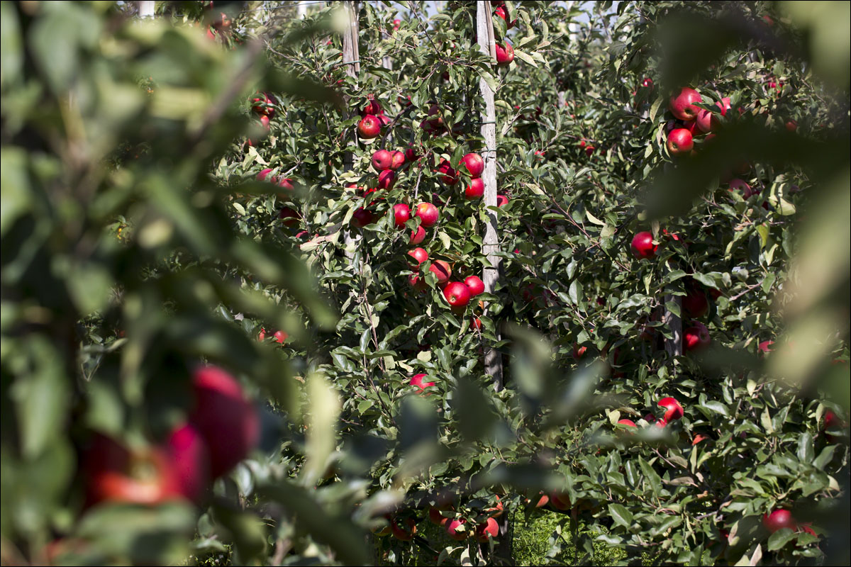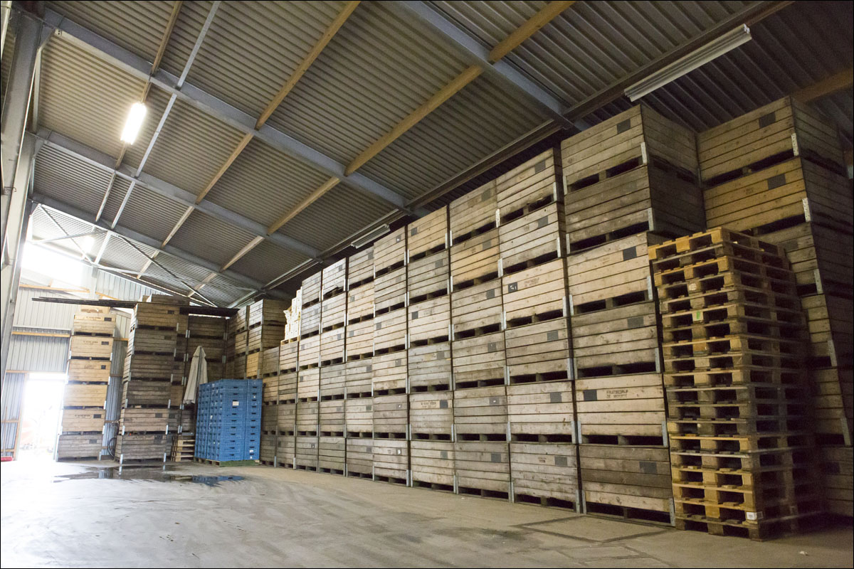 Foto’s van het appels plukken, de appelboomgaard en de opslag van het fruit in de koelcel.