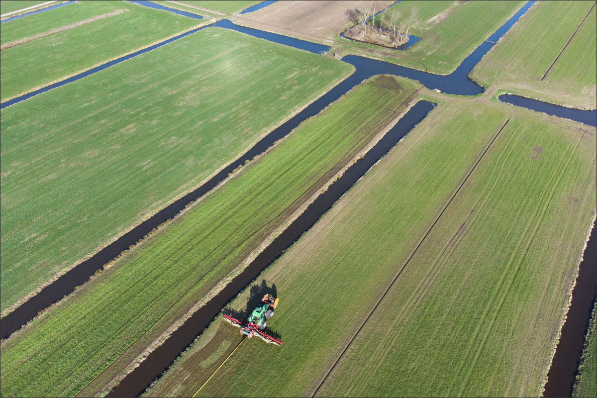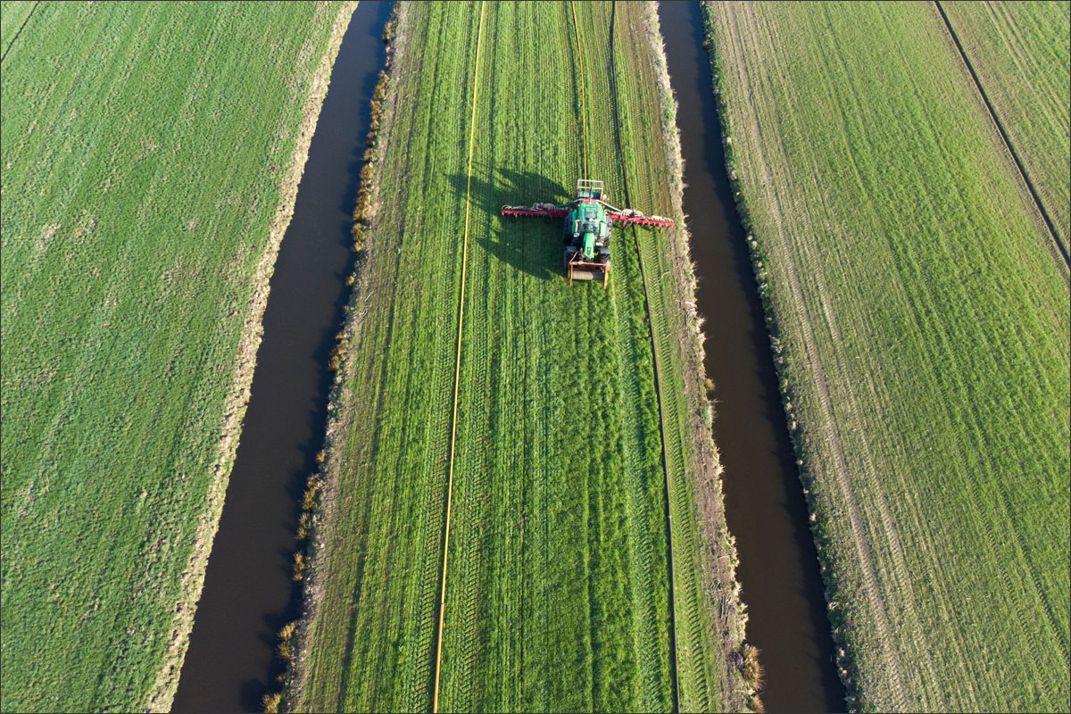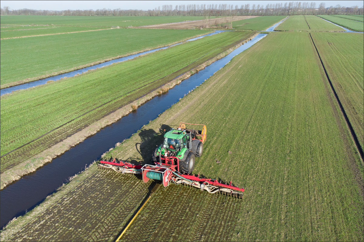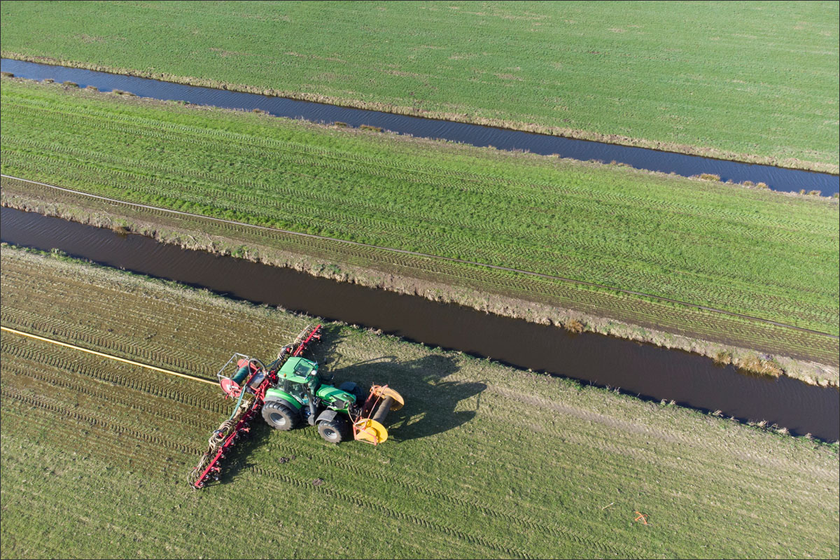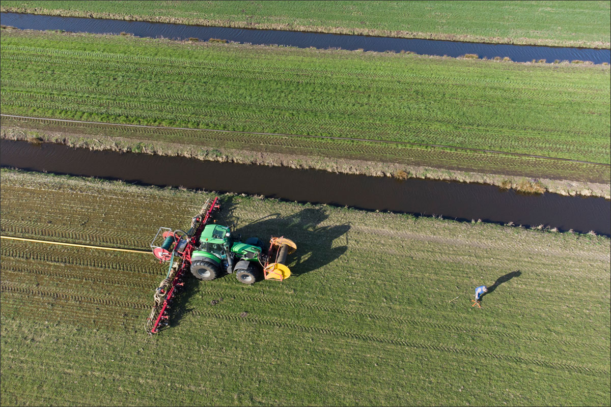 Foto’s van het bemesten van het maisland vanuit de lucht met een drone en vanaf de grond.