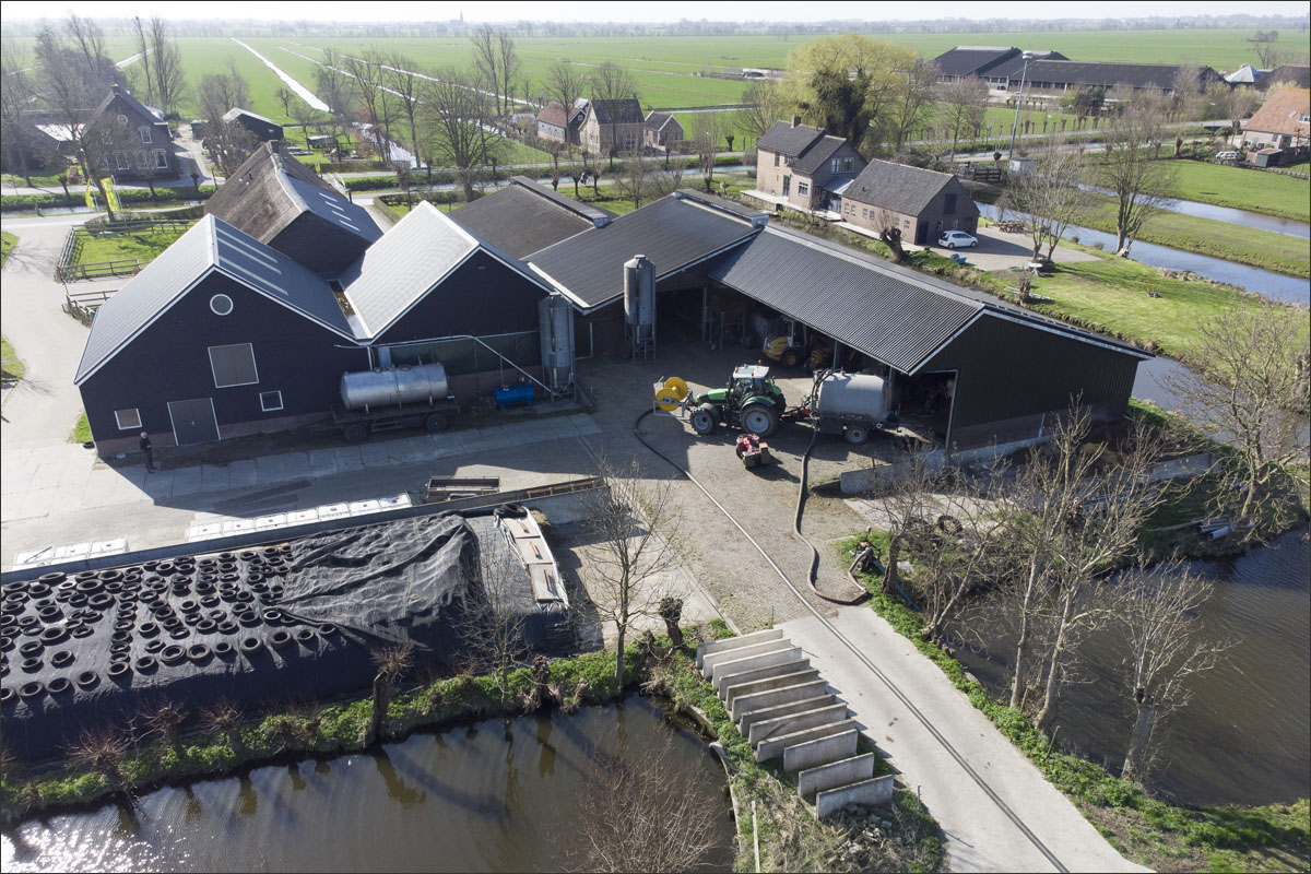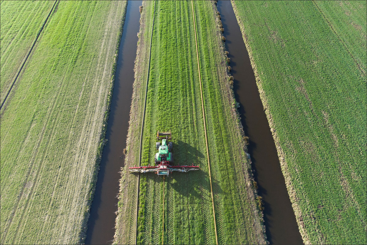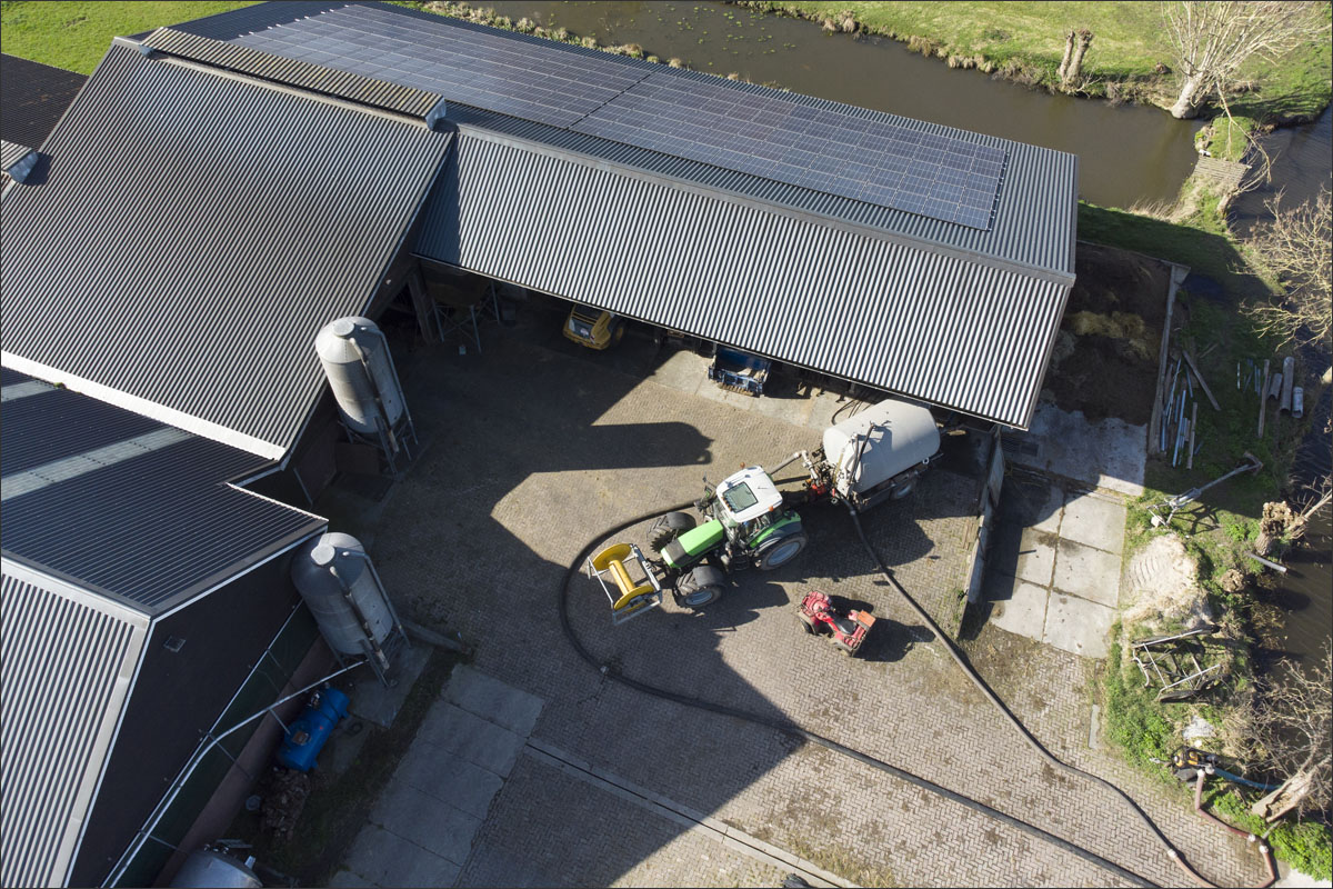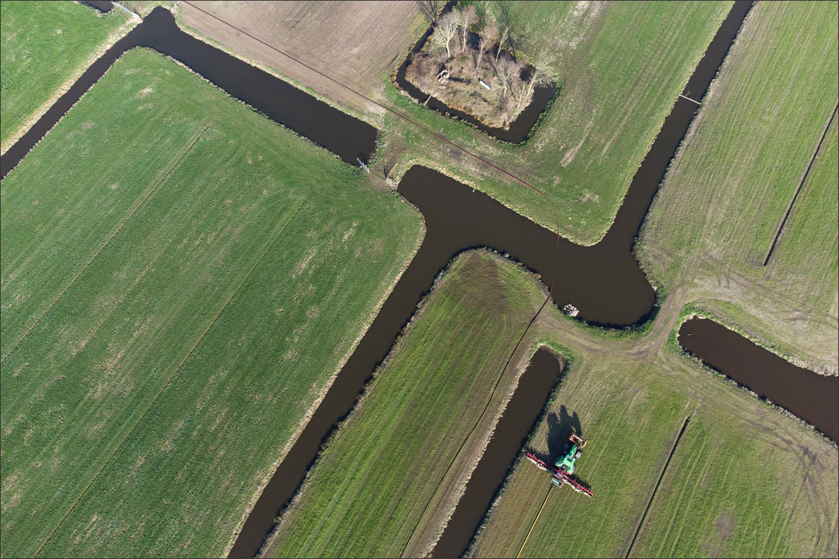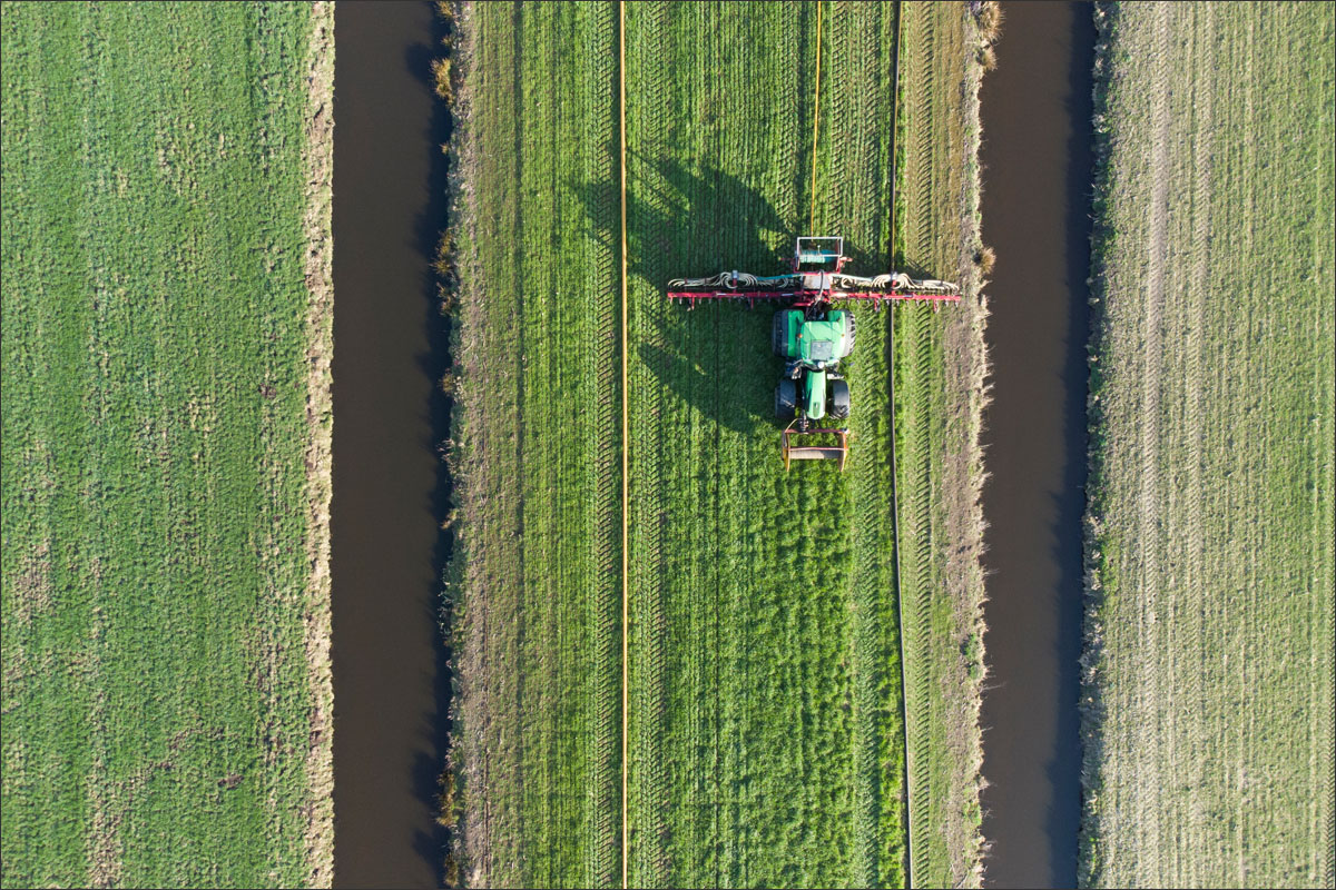 Foto’s van het bemesten van het maisland vanuit de lucht met een drone en vanaf de grond.