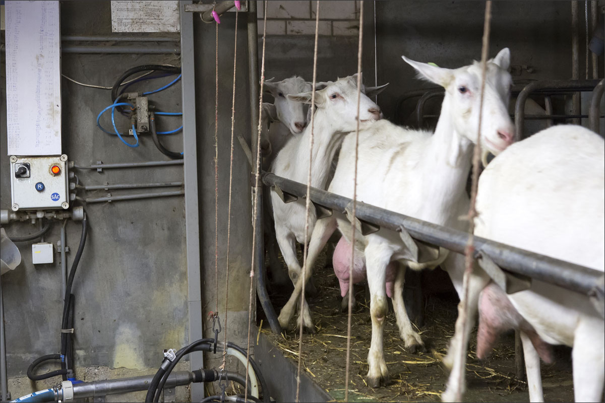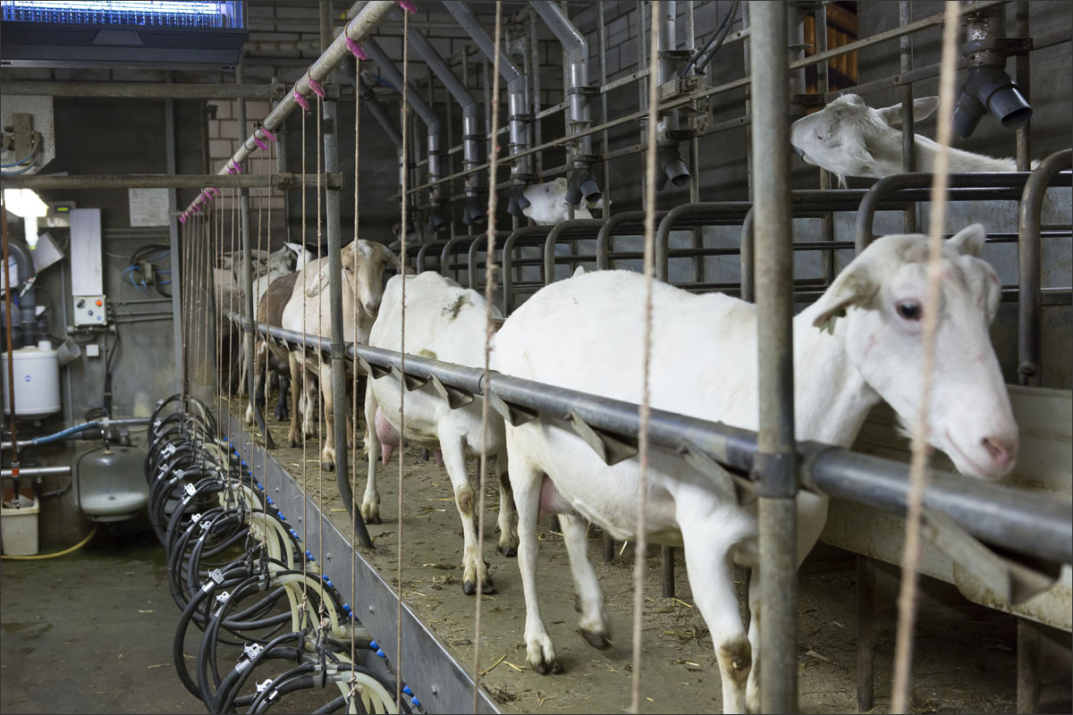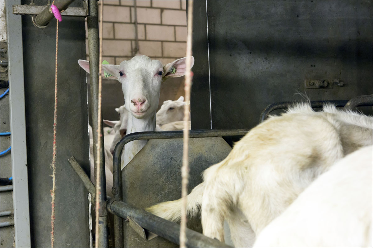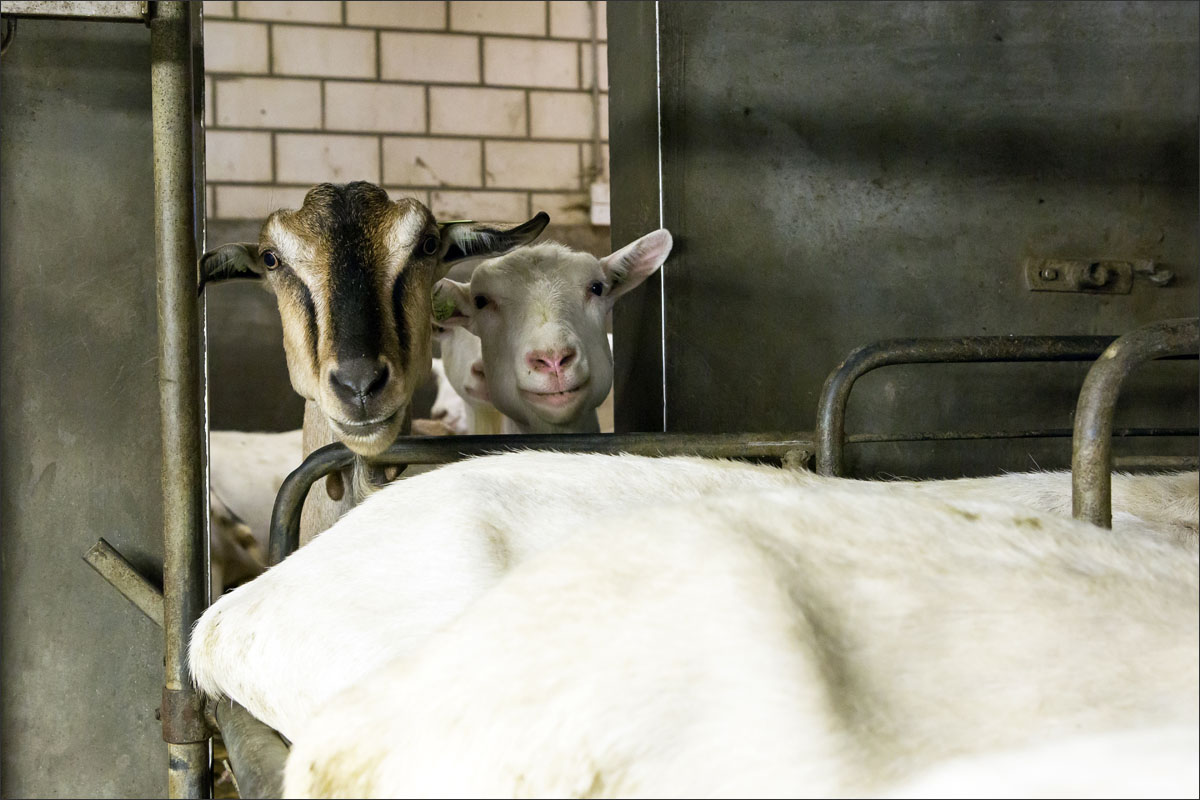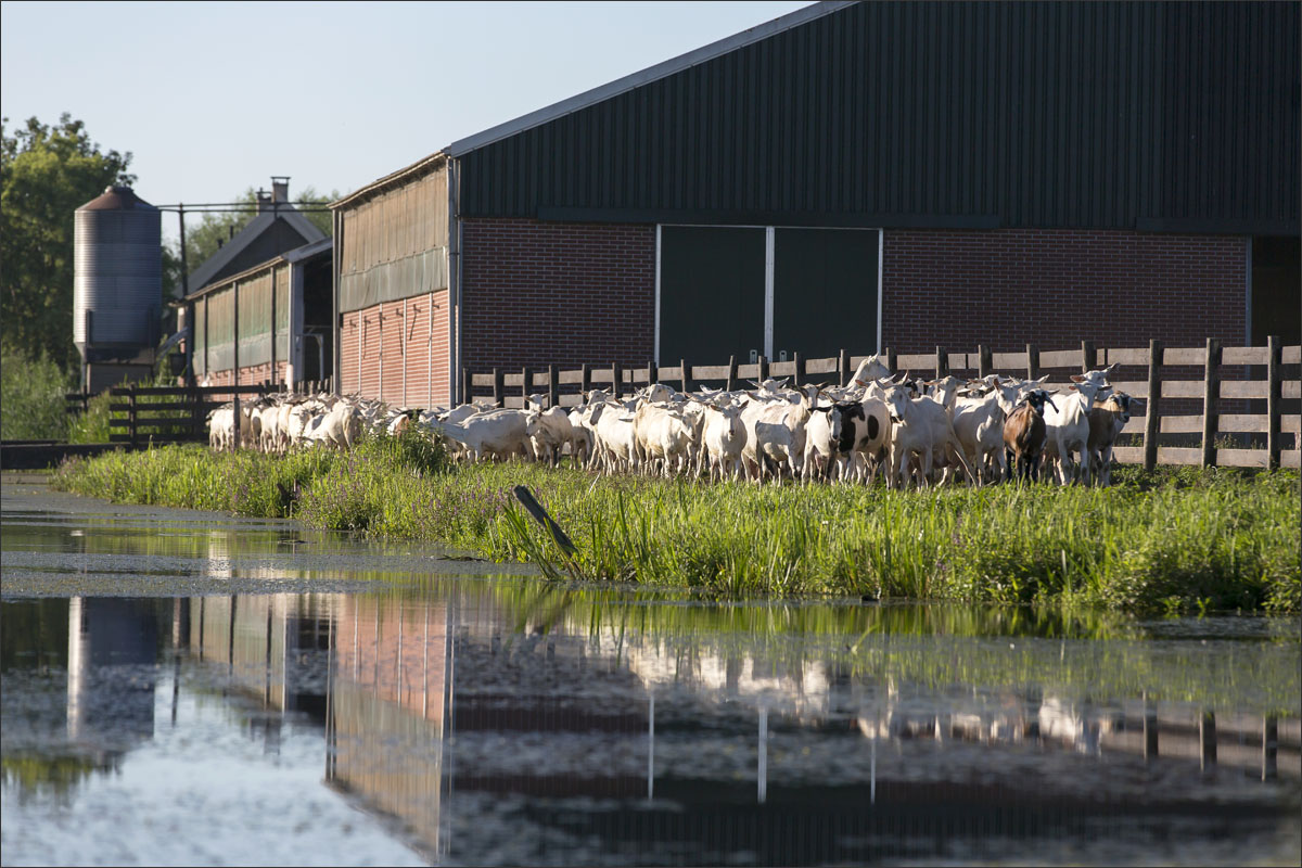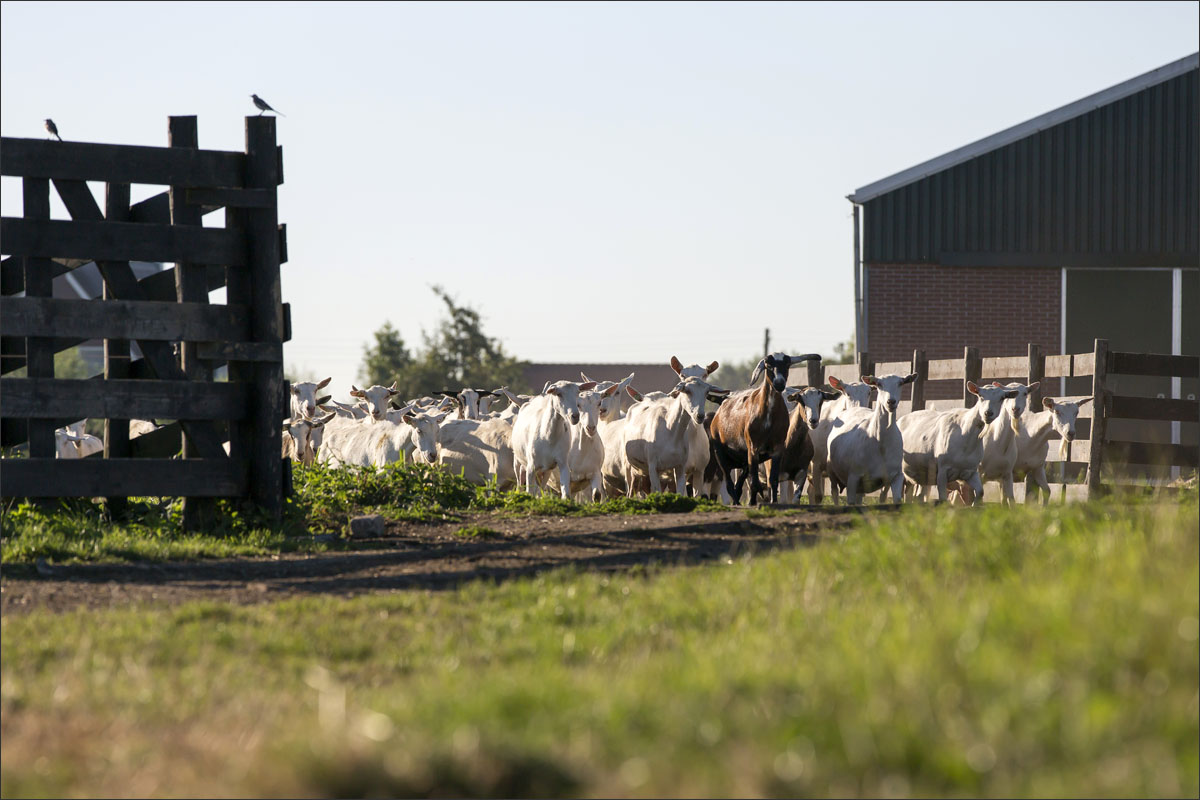 Foto’s van het melken van de geiten, het wachten in de stal na het melken tot ze naar buiten mogen en het lopen naar de weide.