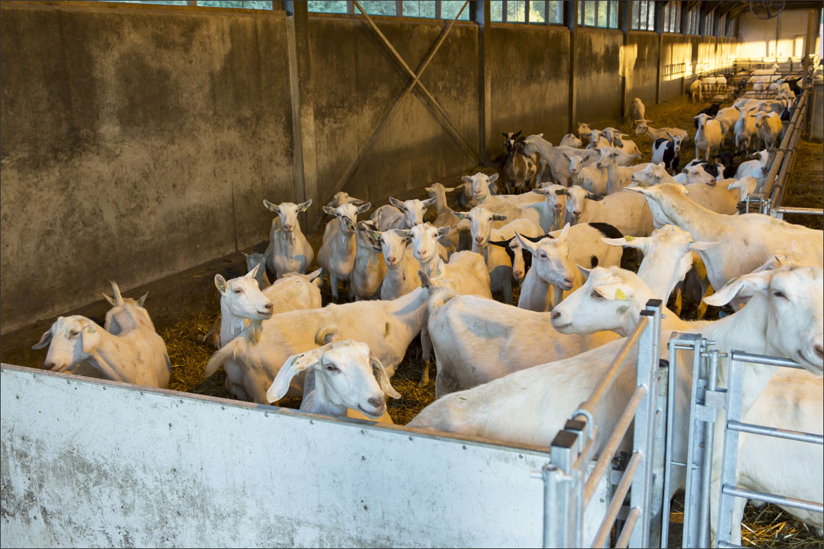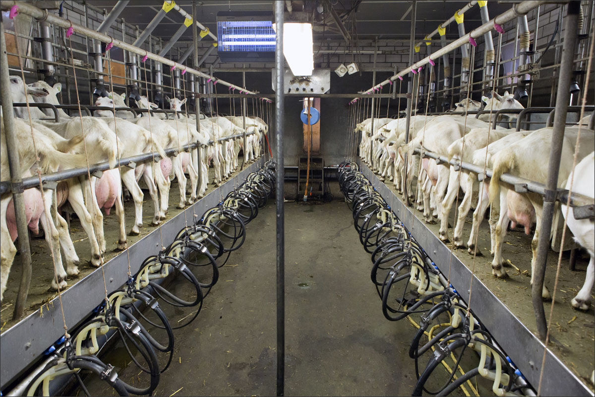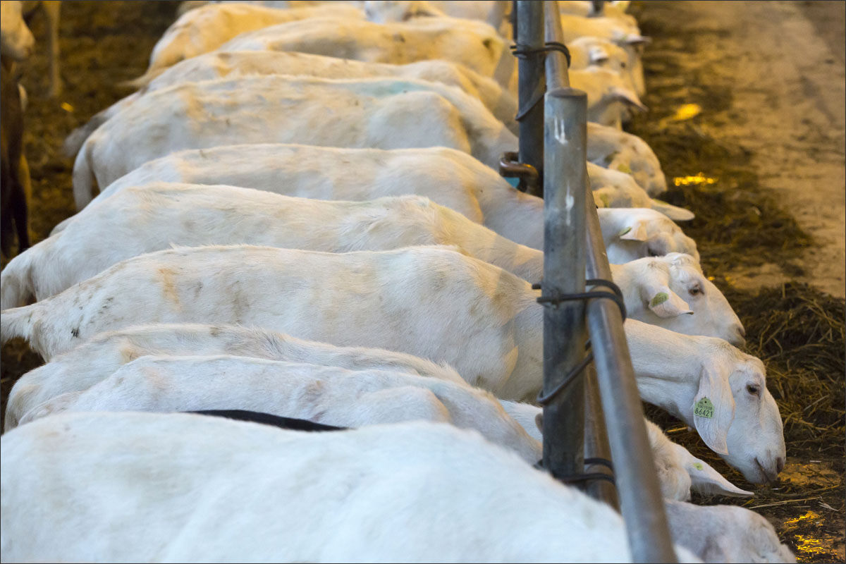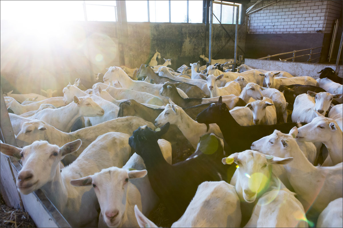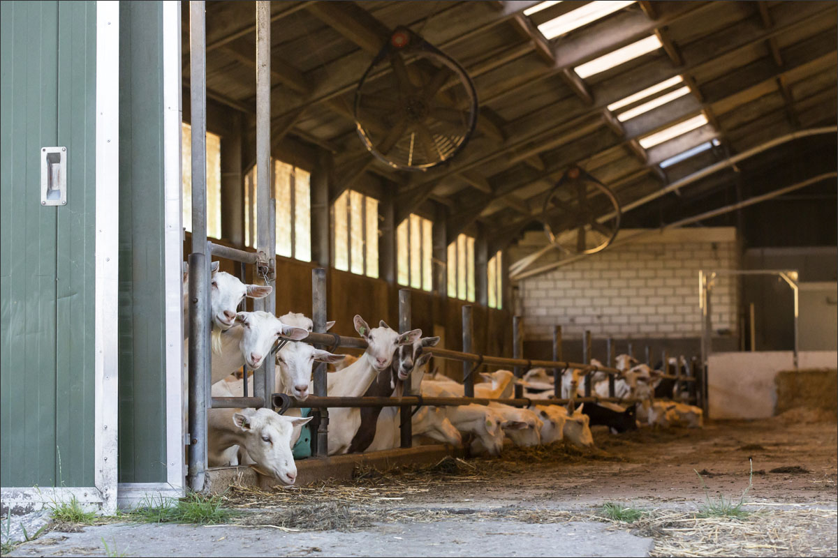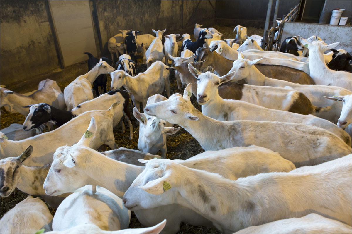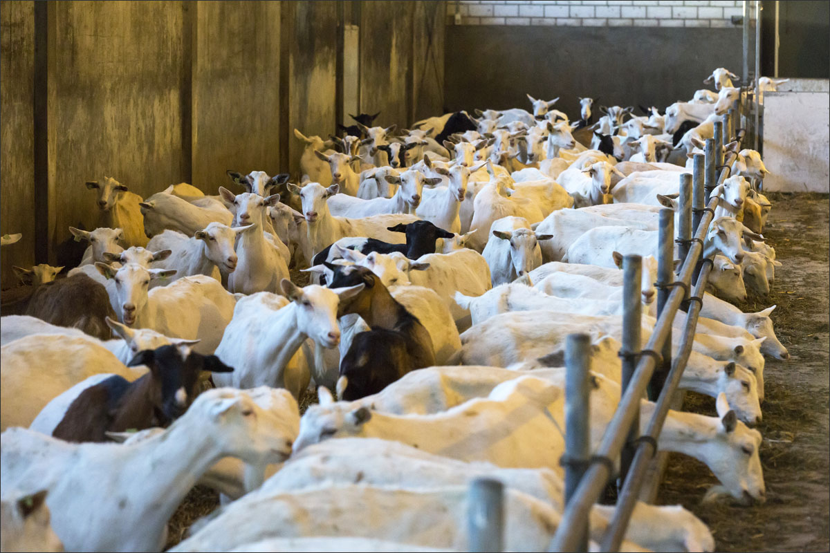 Foto’s van het melken van de geiten, het wachten in de stal na het melken tot ze naar buiten mogen en het lopen naar de weide.