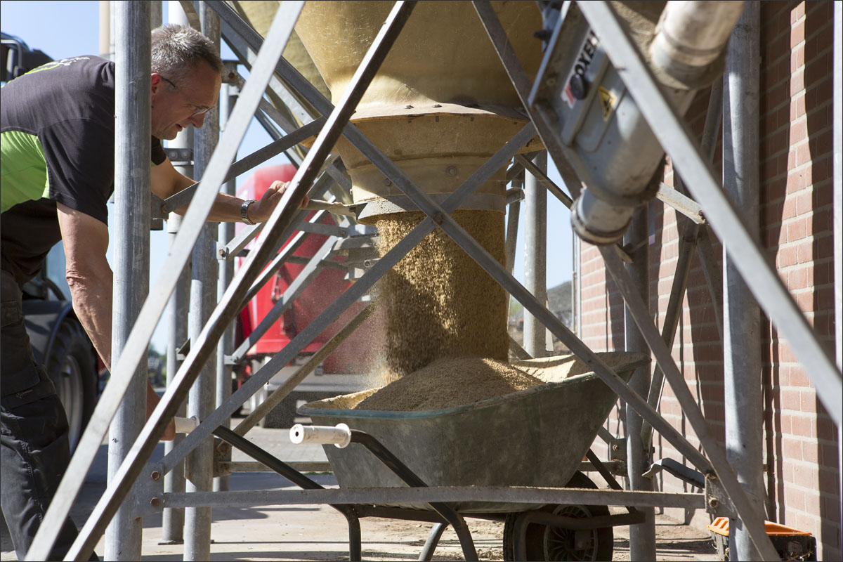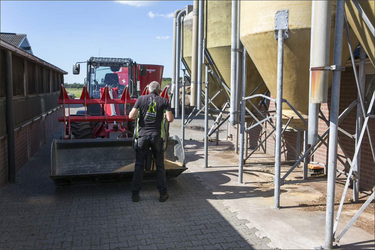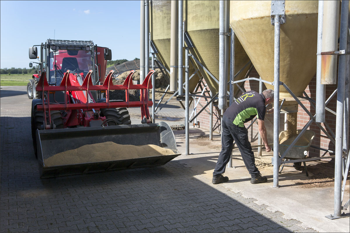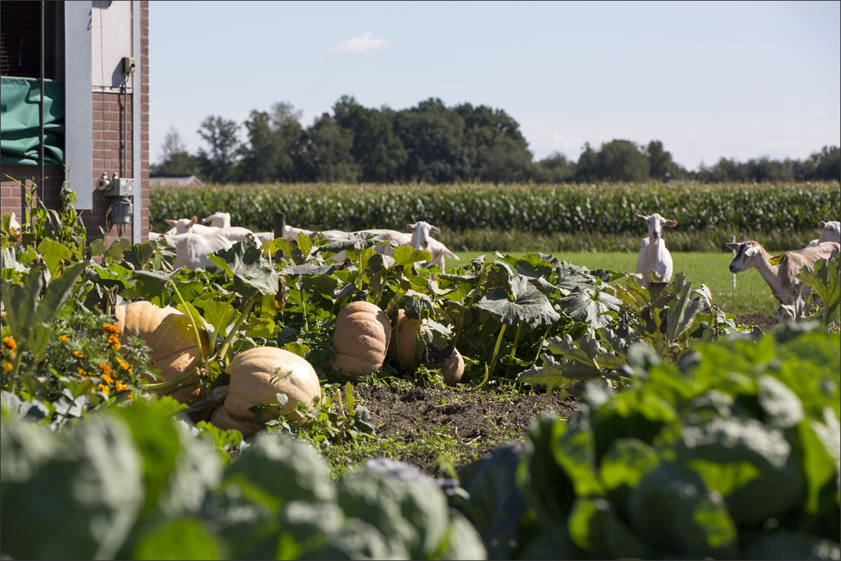Foto’s van o.a. de voersilo’s, ingekuild gras, opslag strobalen, de moestuin met pompoenen en andere groenten, het laden en mengen van de voermengwagen voor het voeren van de geiten en het wiersen van het grasland.
