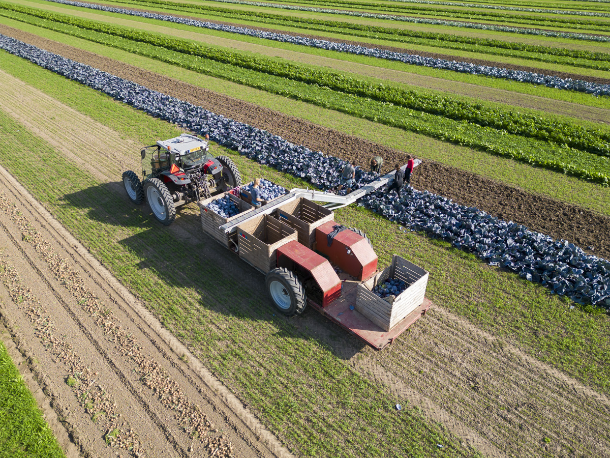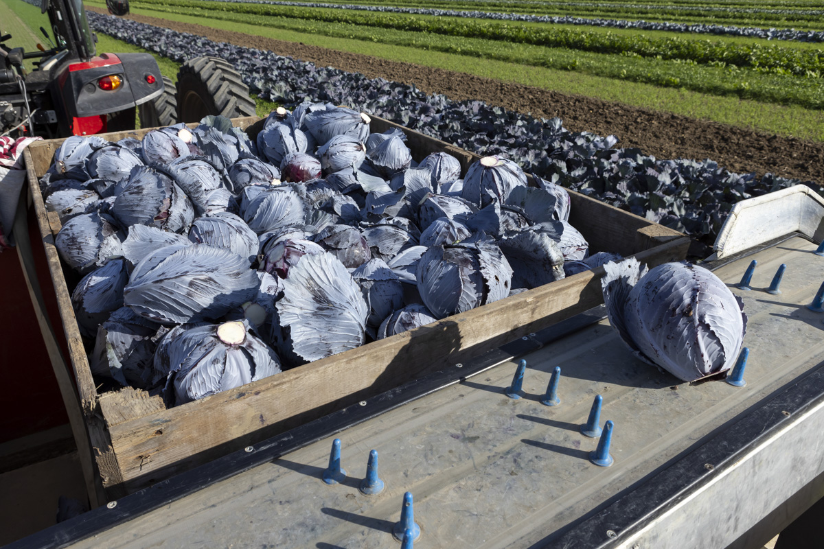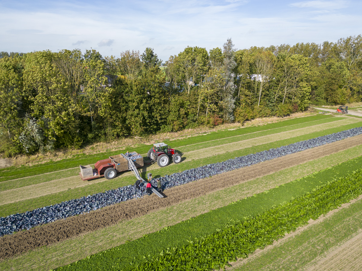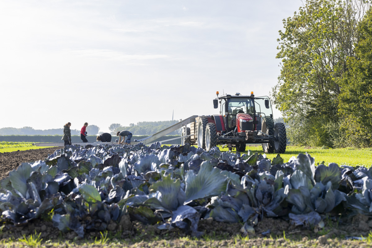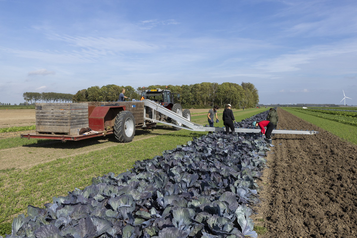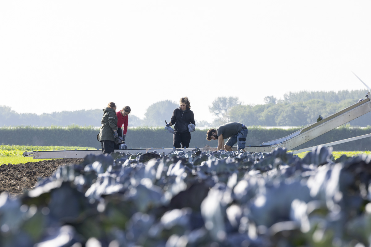 Biologische rode kool oogsten op het biologische regeneratief akkerbouwbedrijf BI-JOVIRA.