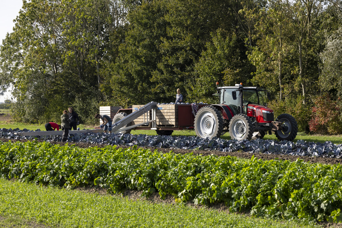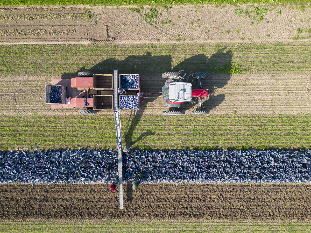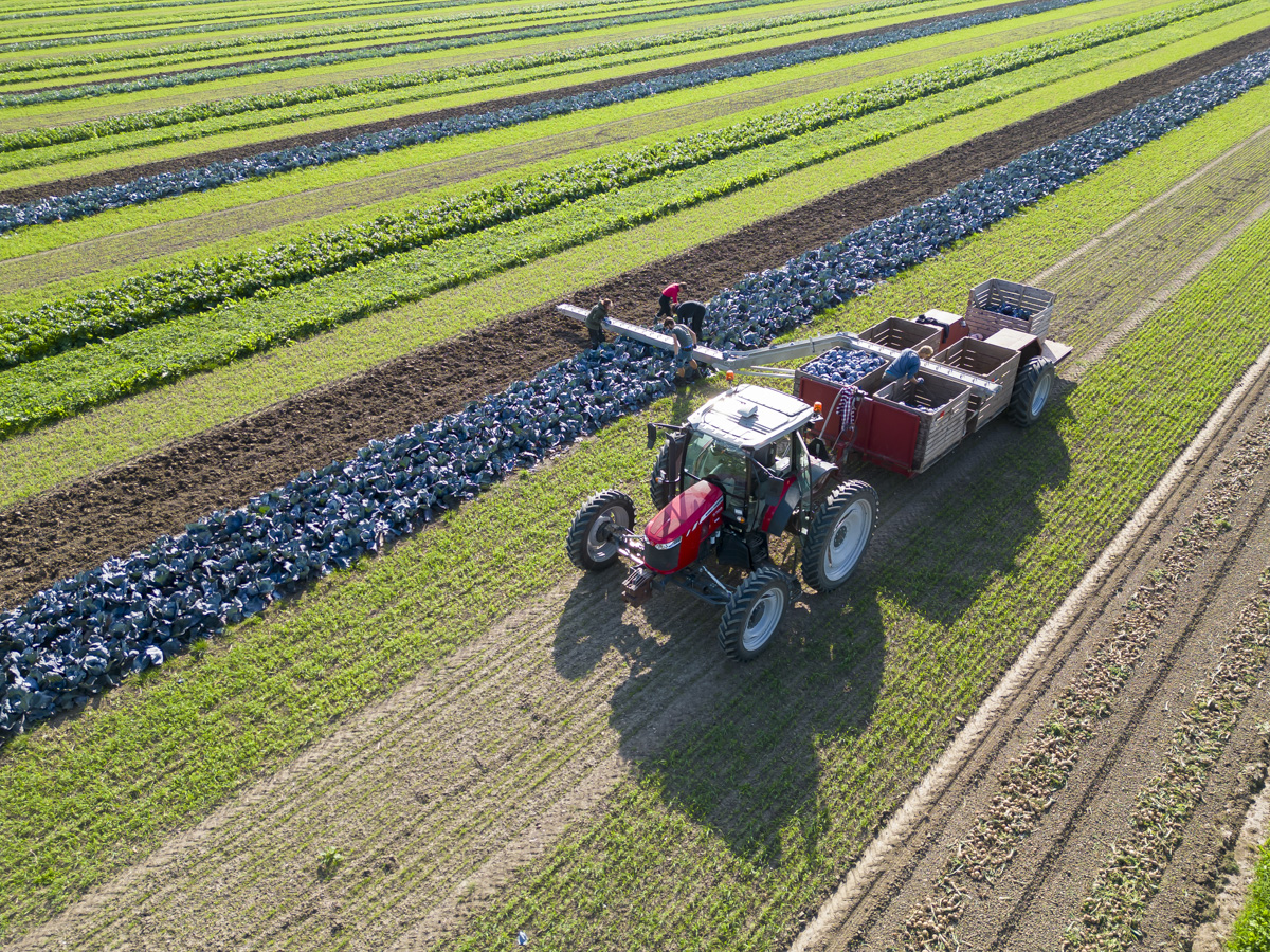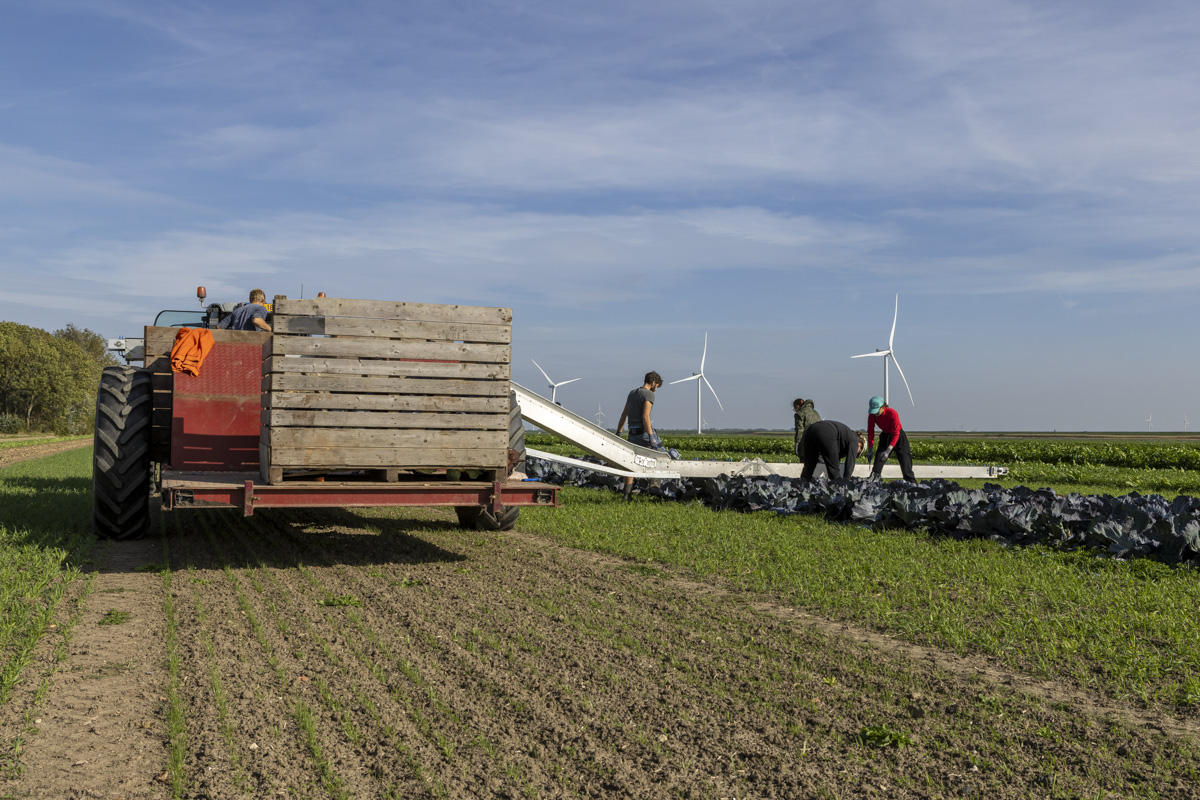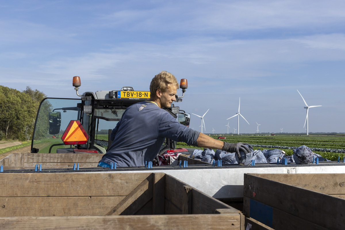 Biologische rode kool oogsten op het biologische regeneratief akkerbouwbedrijf BI-JOVIRA.