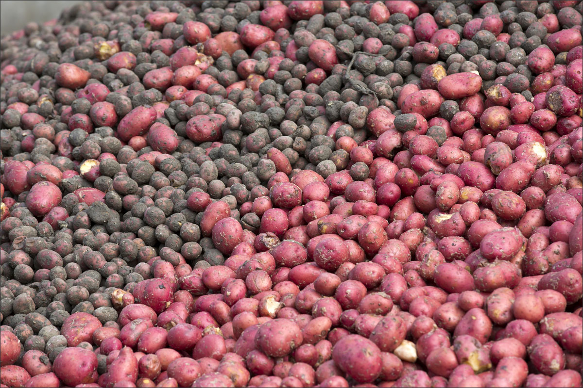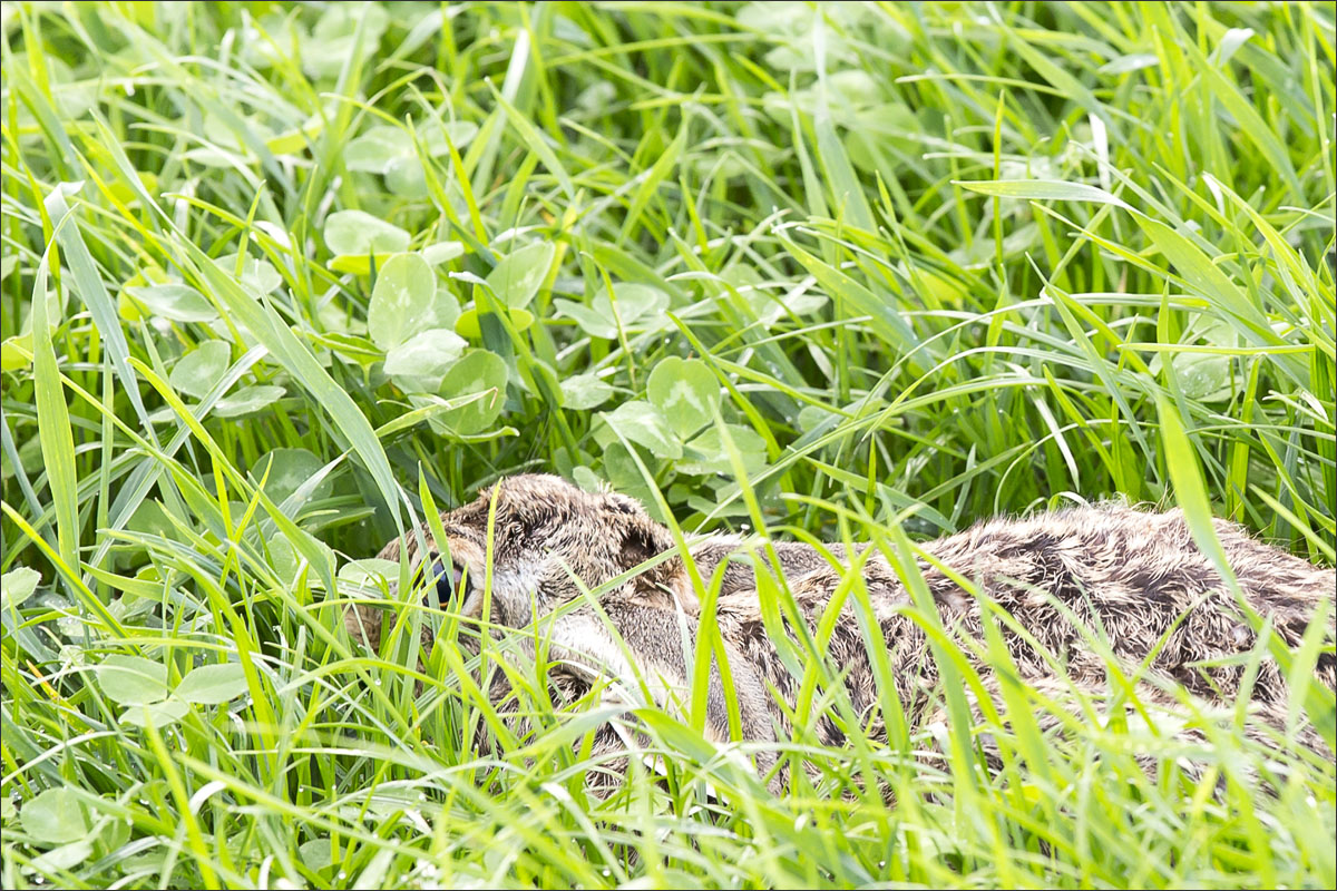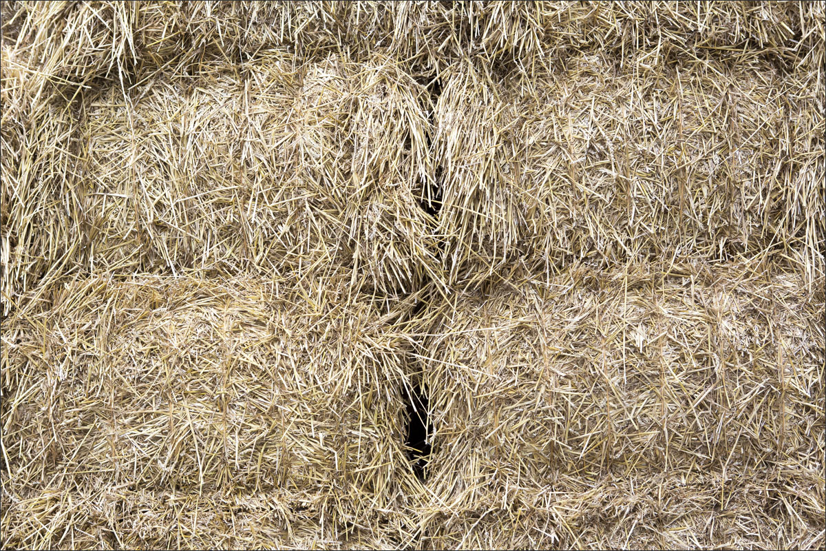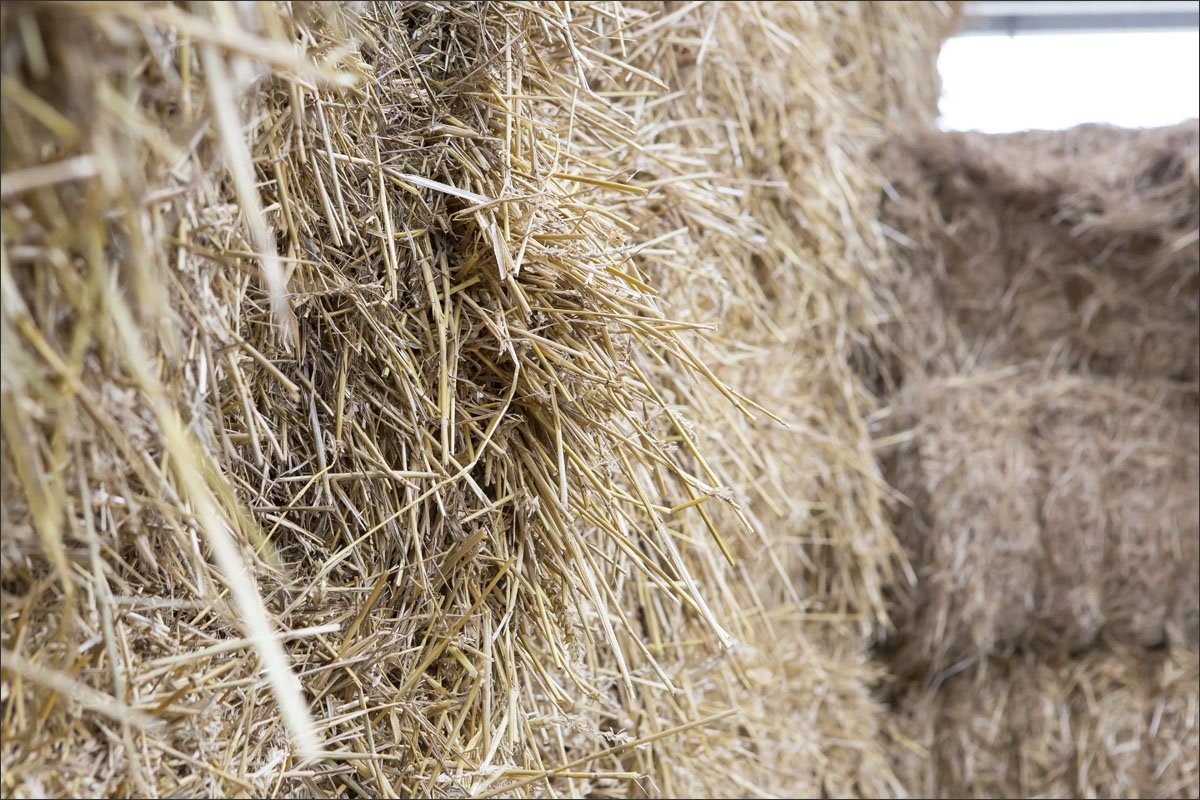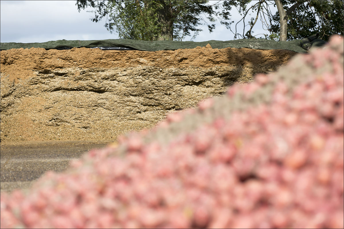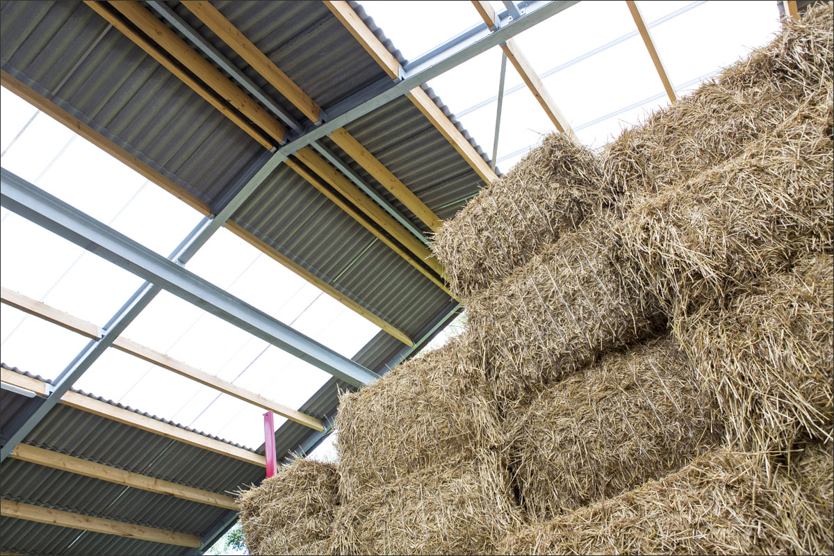 Foto’s van de voeraardappelen, opslag van strobalen, een haas verstopt in een hazenleger en het hakselen van mais.