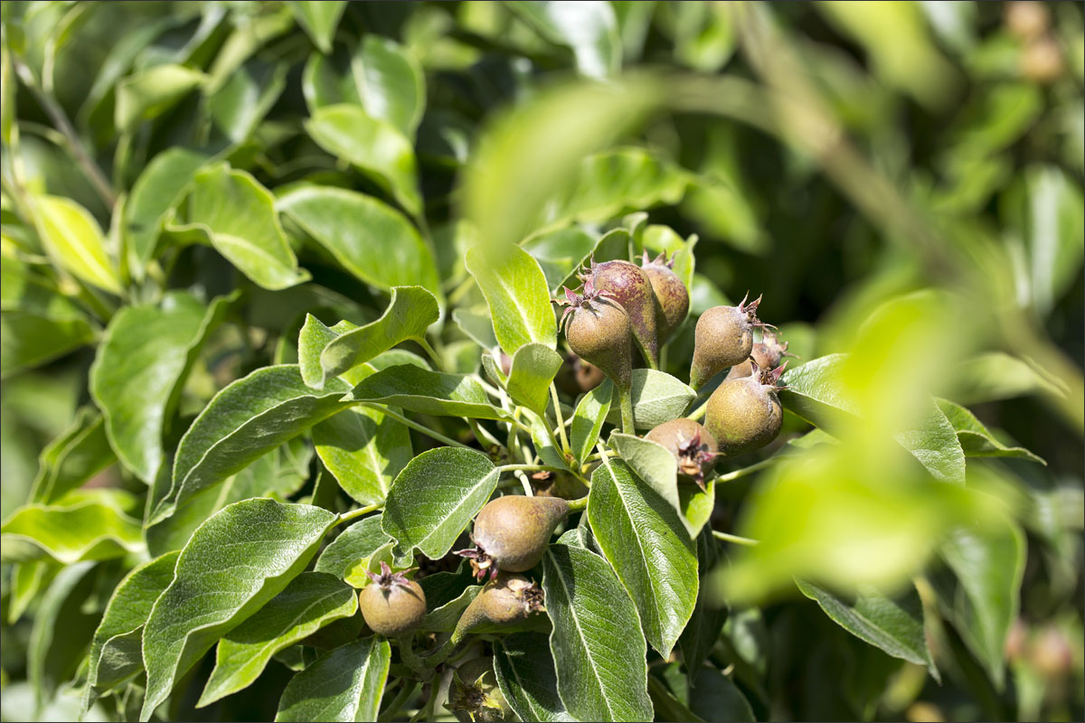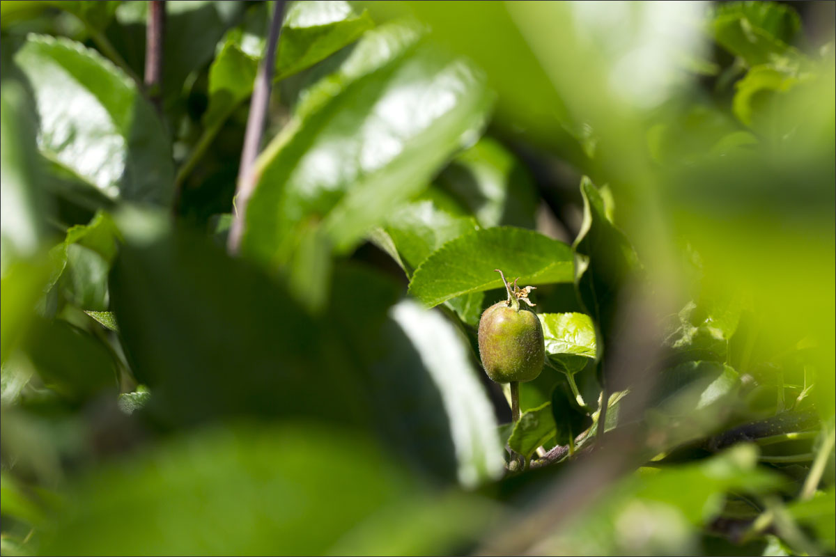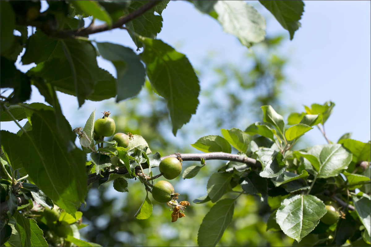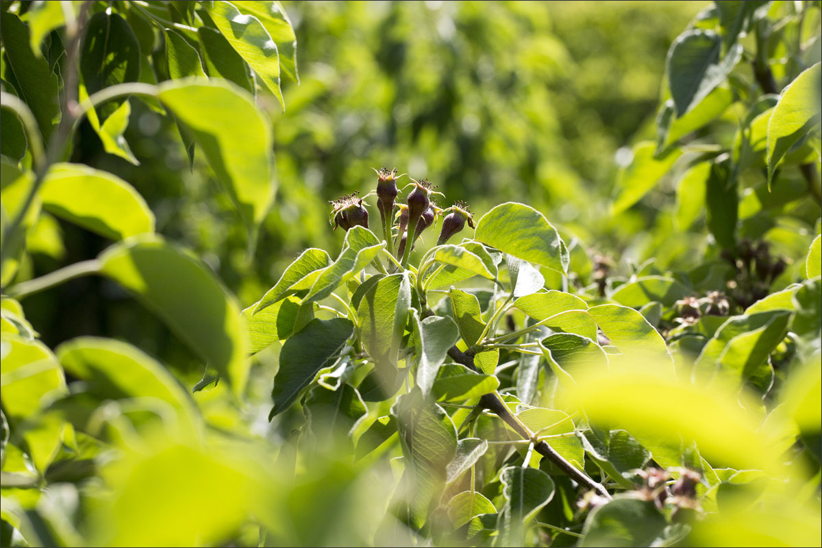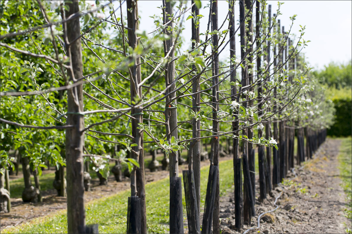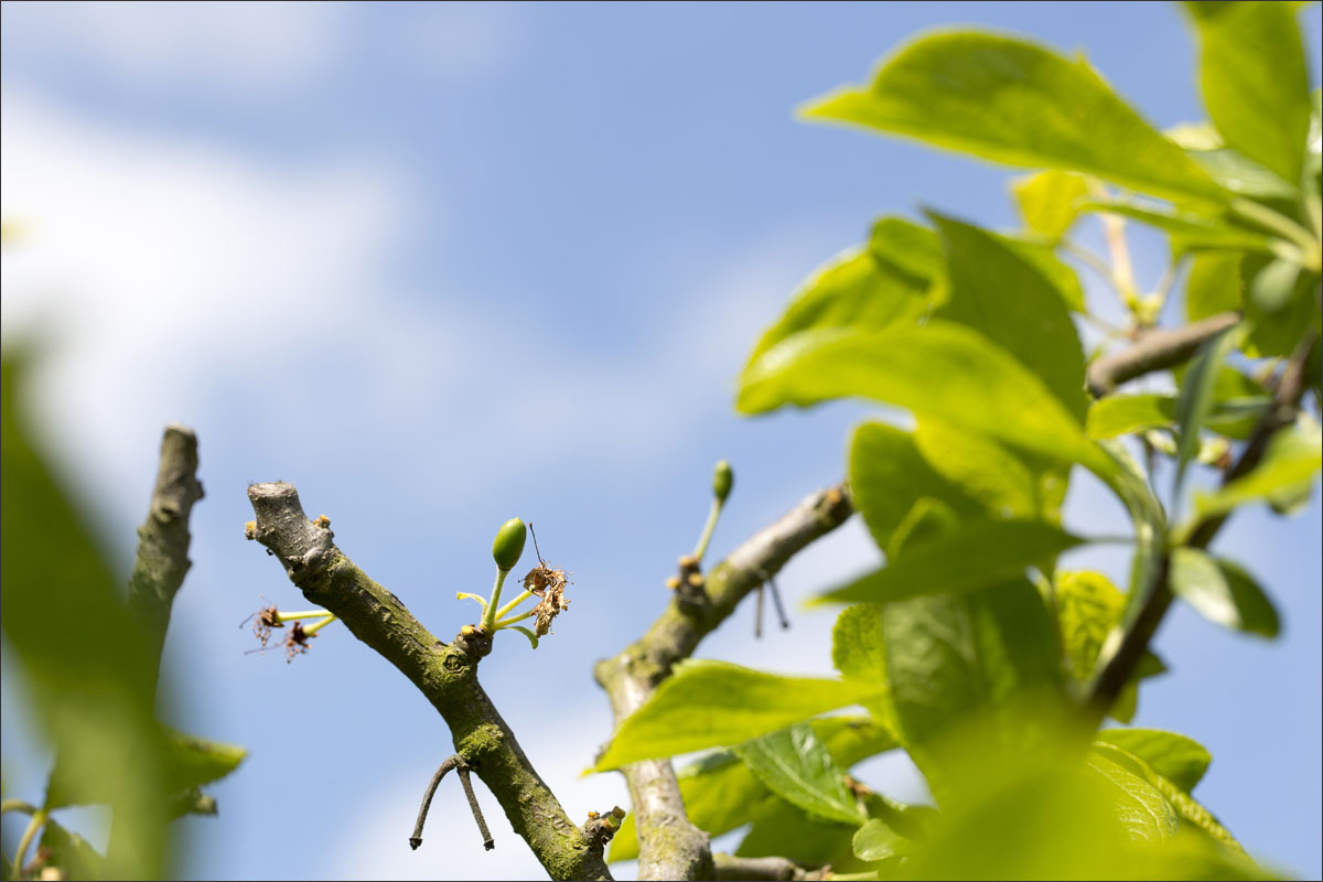 Foto’s in de boomgaard van een fruitteler. De bloesem is uitgebloeid, de vruchtjes beginnen te groeien.