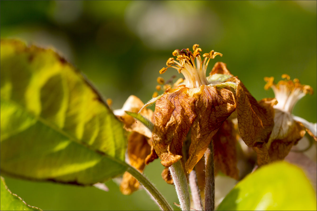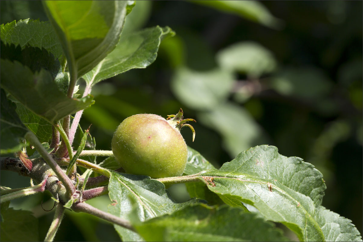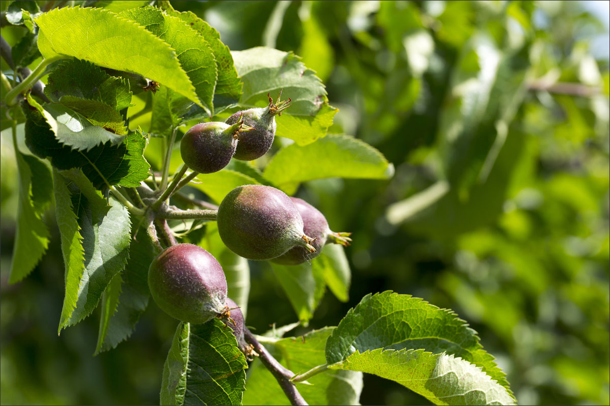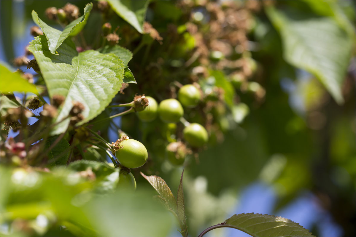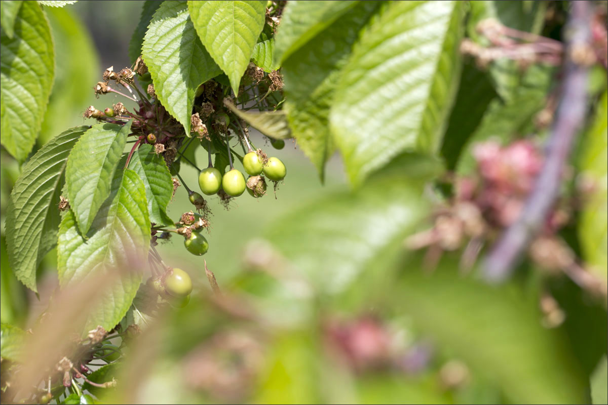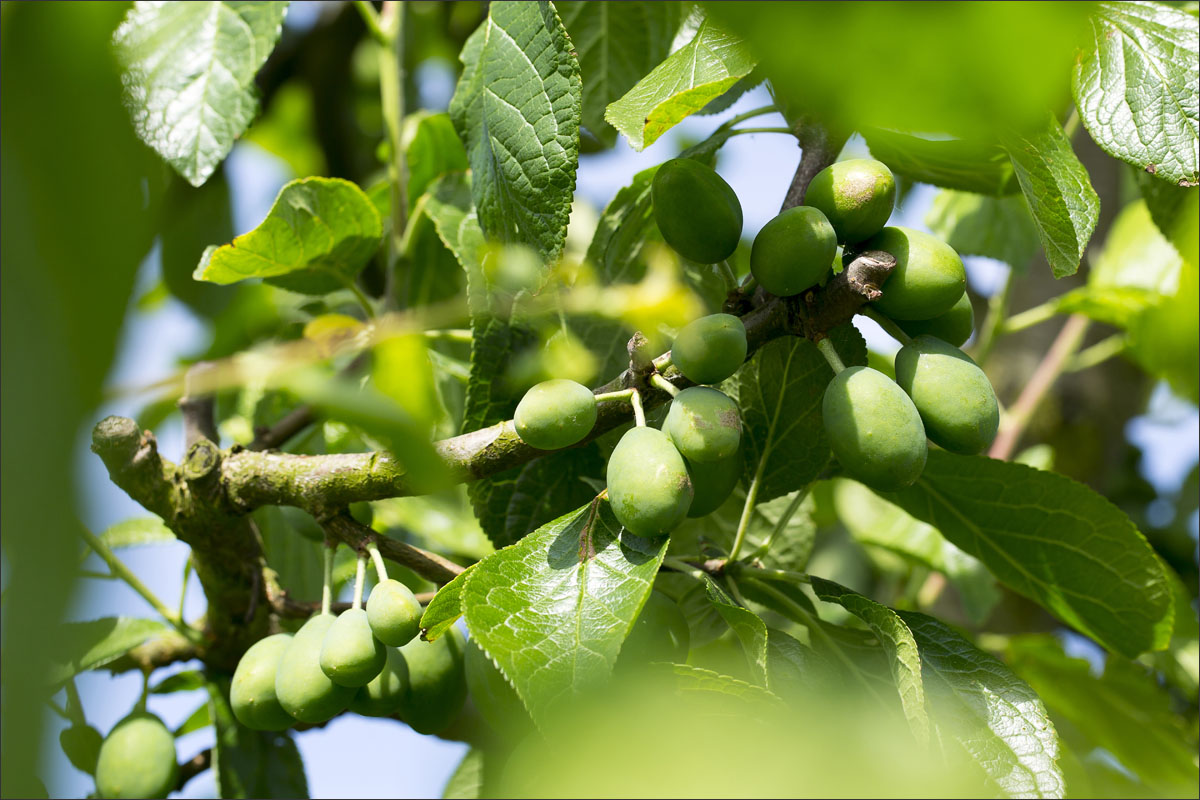 Foto’s in de boomgaard van een fruitteler. De bloesem is uitgebloeid, de vruchtjes beginnen te groeien.