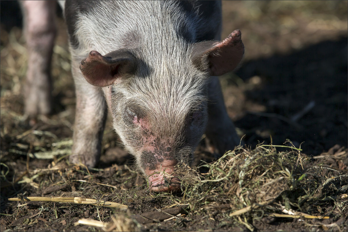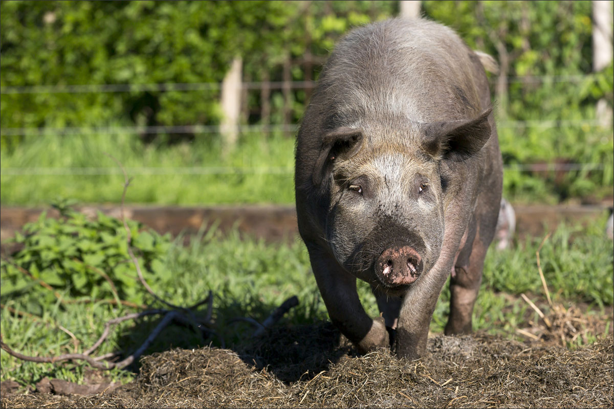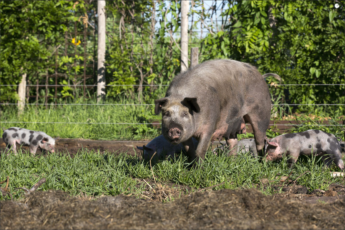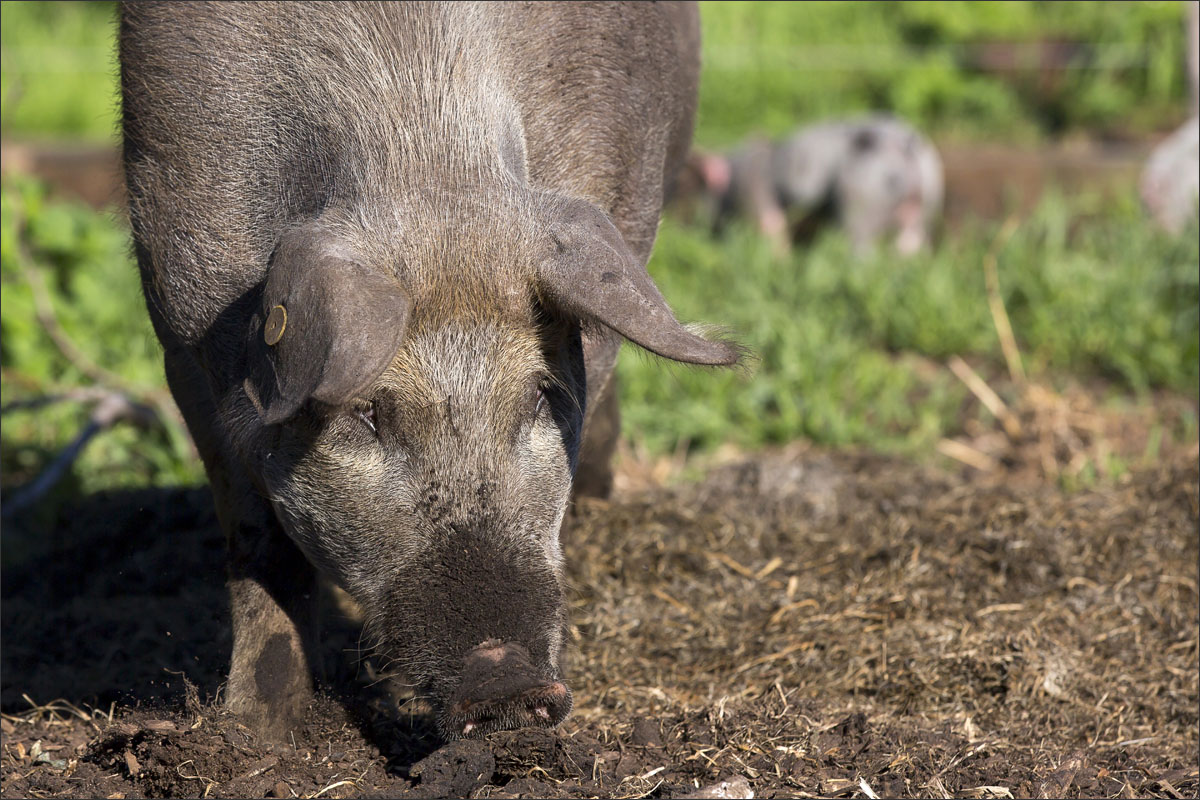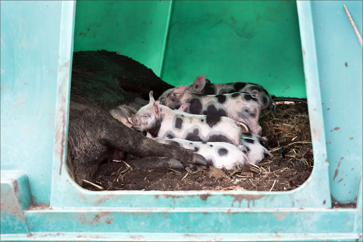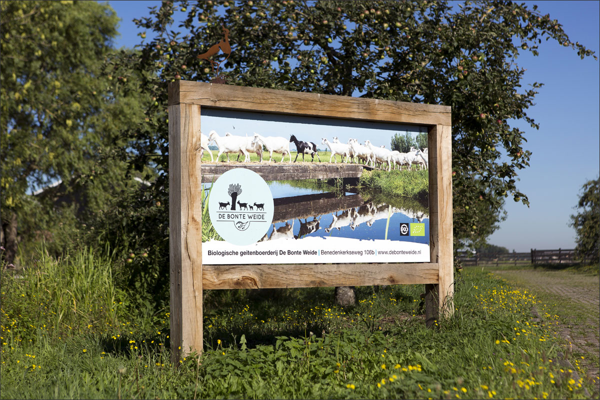 Foto’s van o.a. de boerderij, de bloeiende akkerrand, de biologische moestuin en het varken met haar biggen.