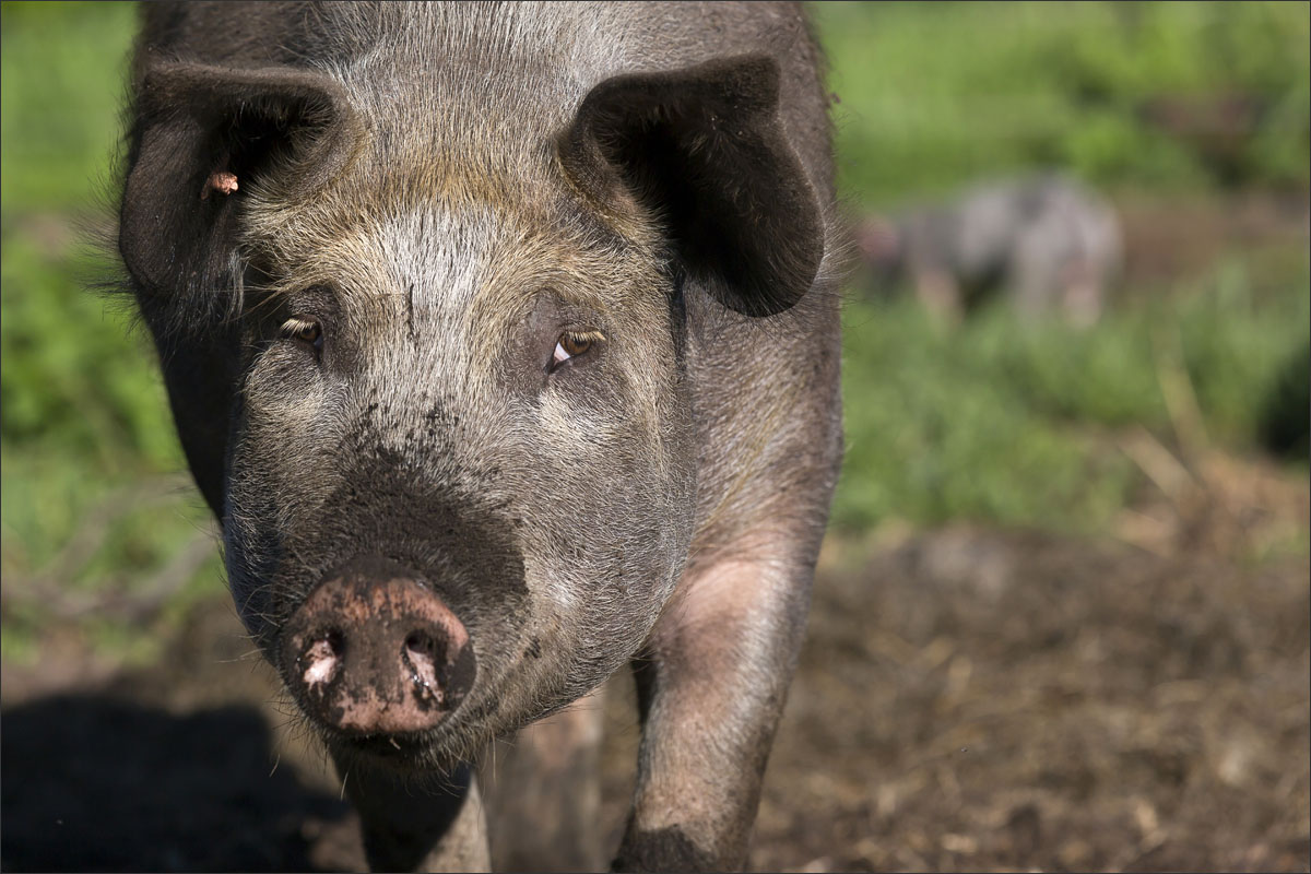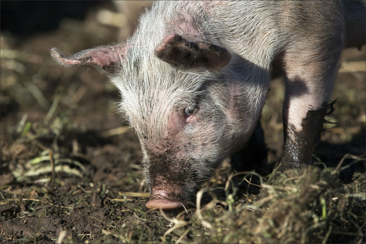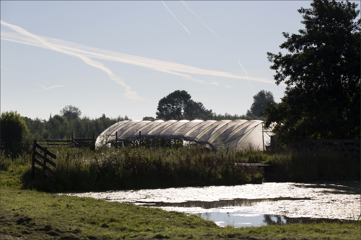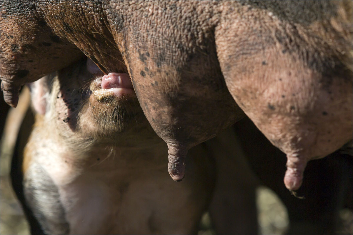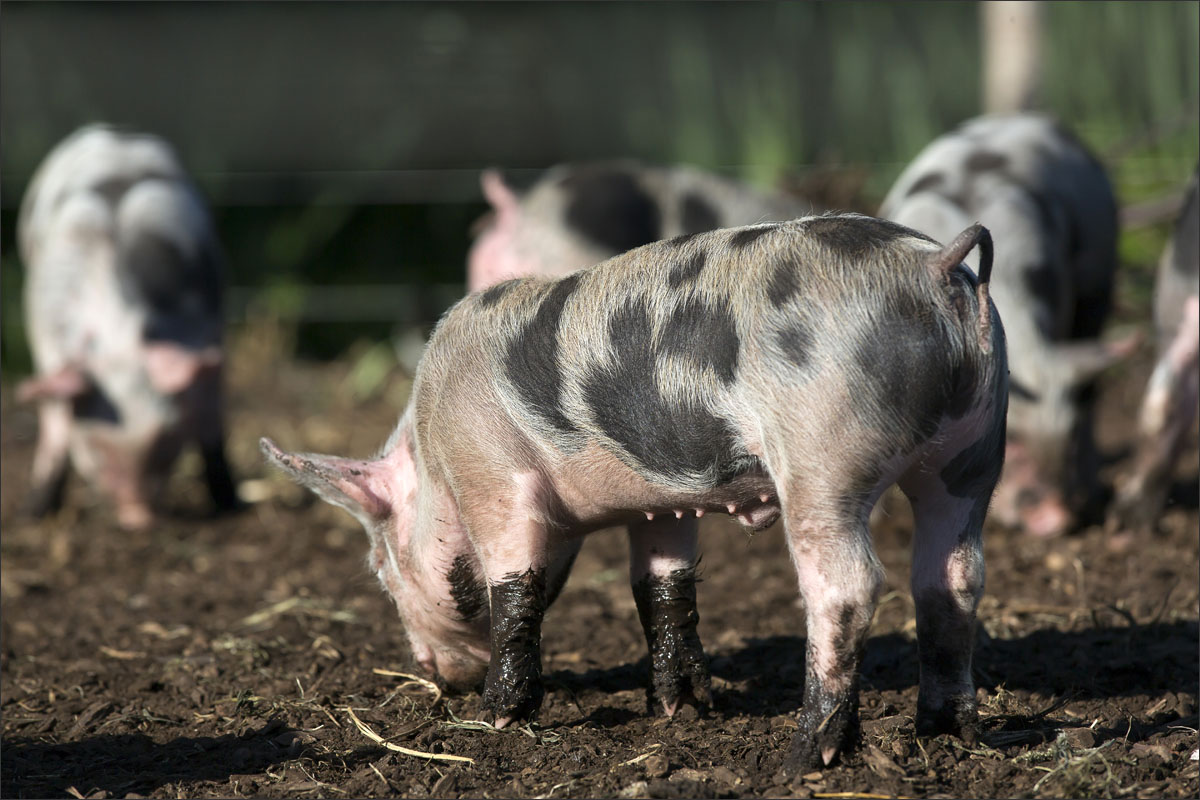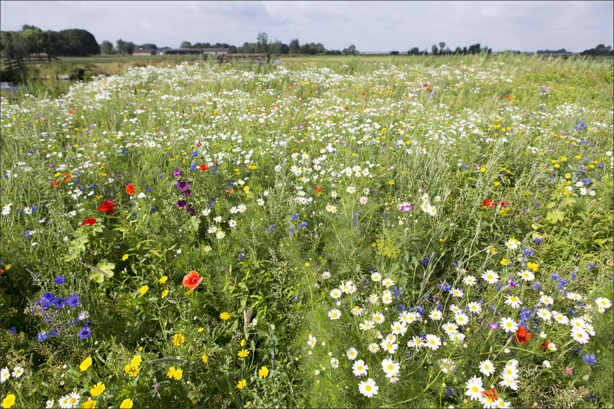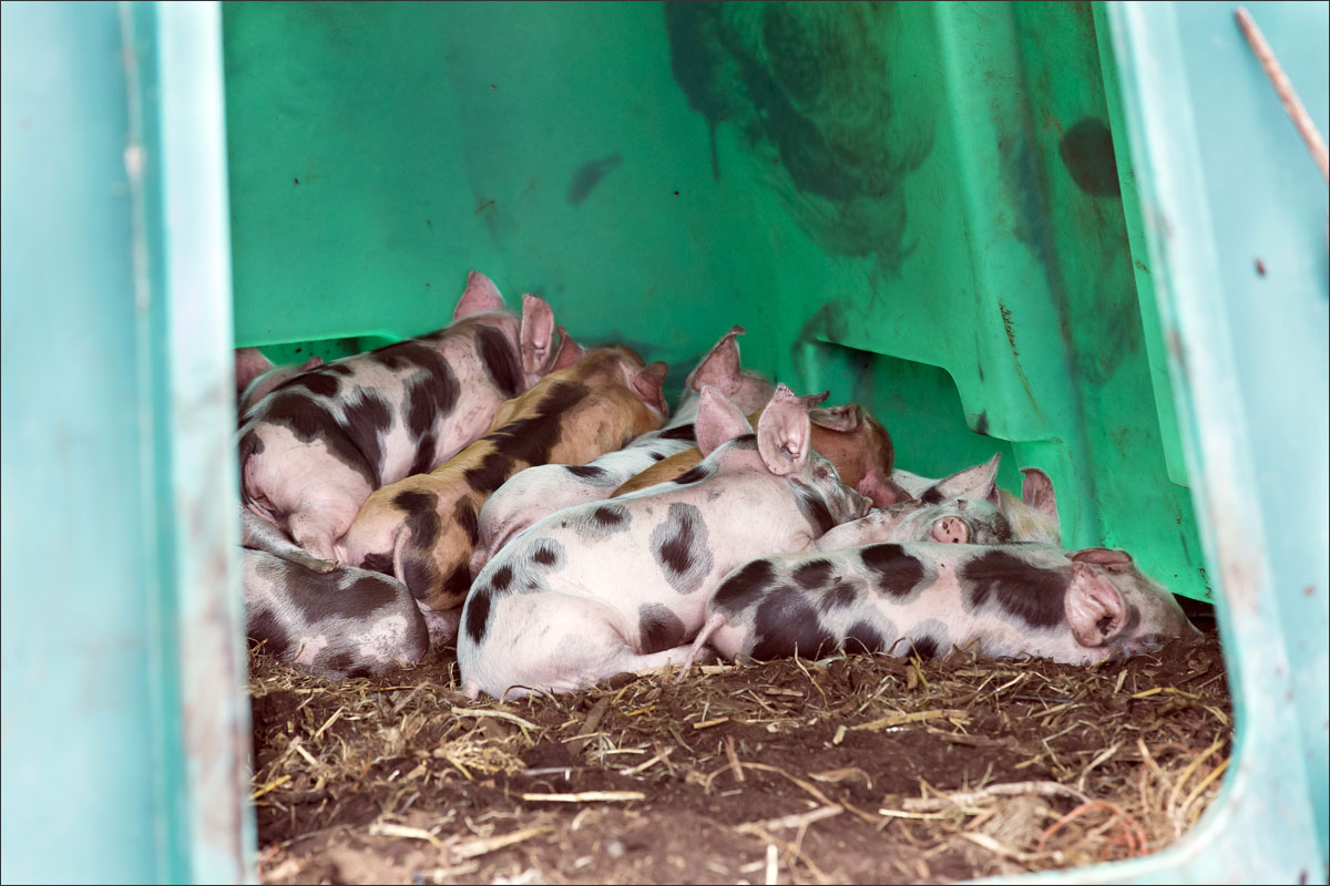 Foto’s van o.a. de boerderij, de bloeiende akkerrand, de biologische moestuin en het varken met haar biggen.