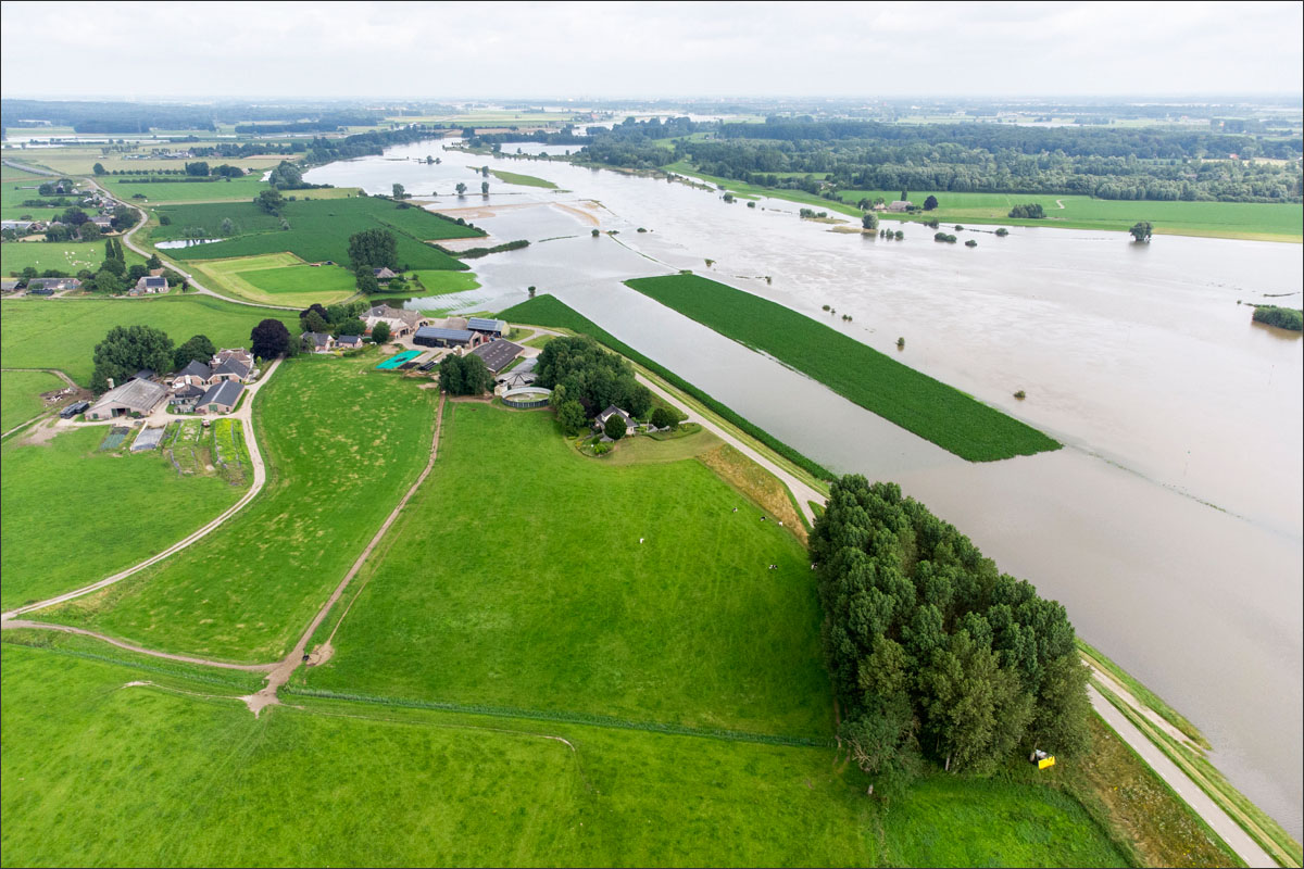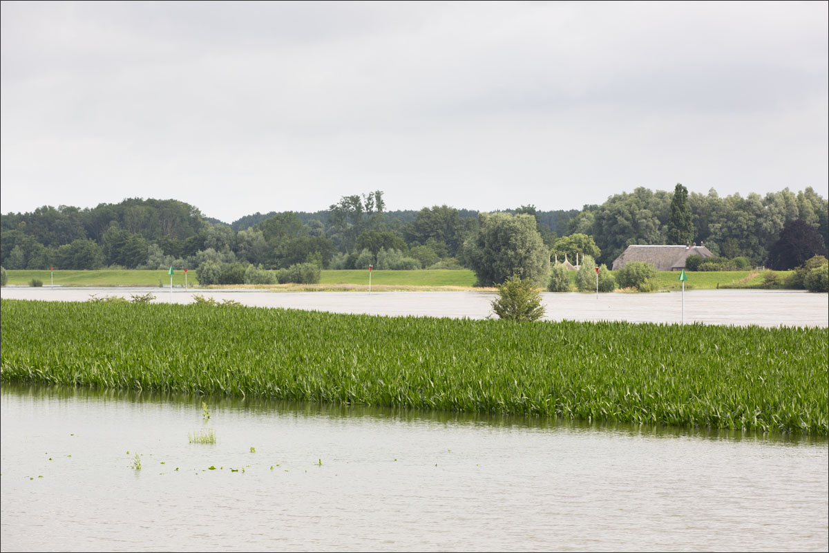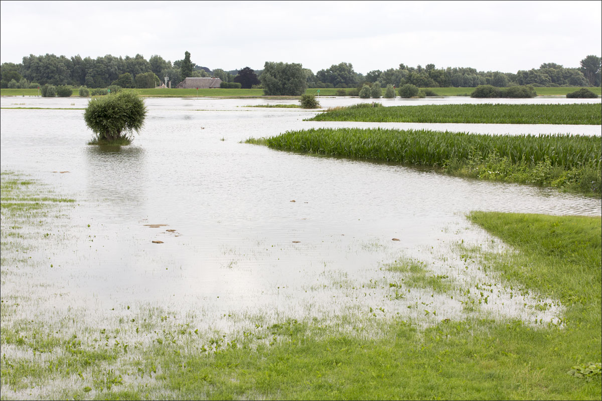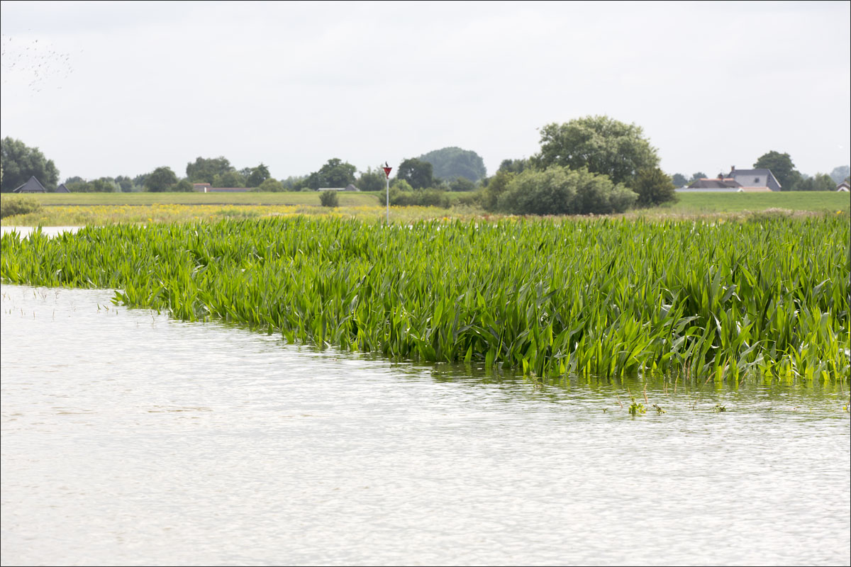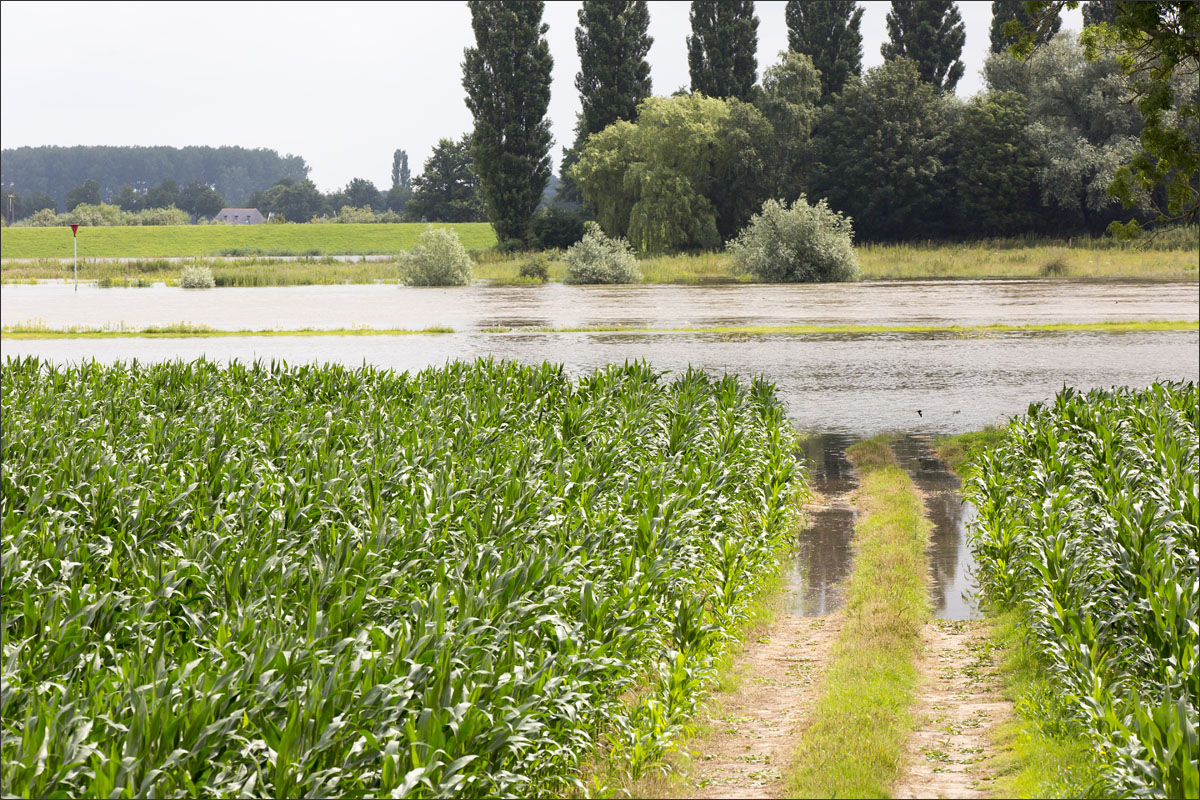 Foto’s van o.a. ondergelopen uiterwaarden met mais.