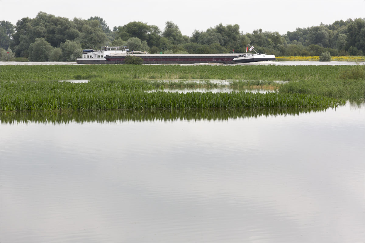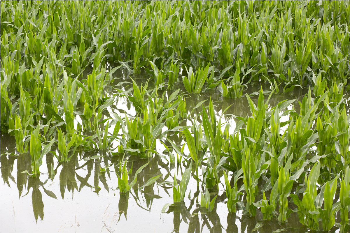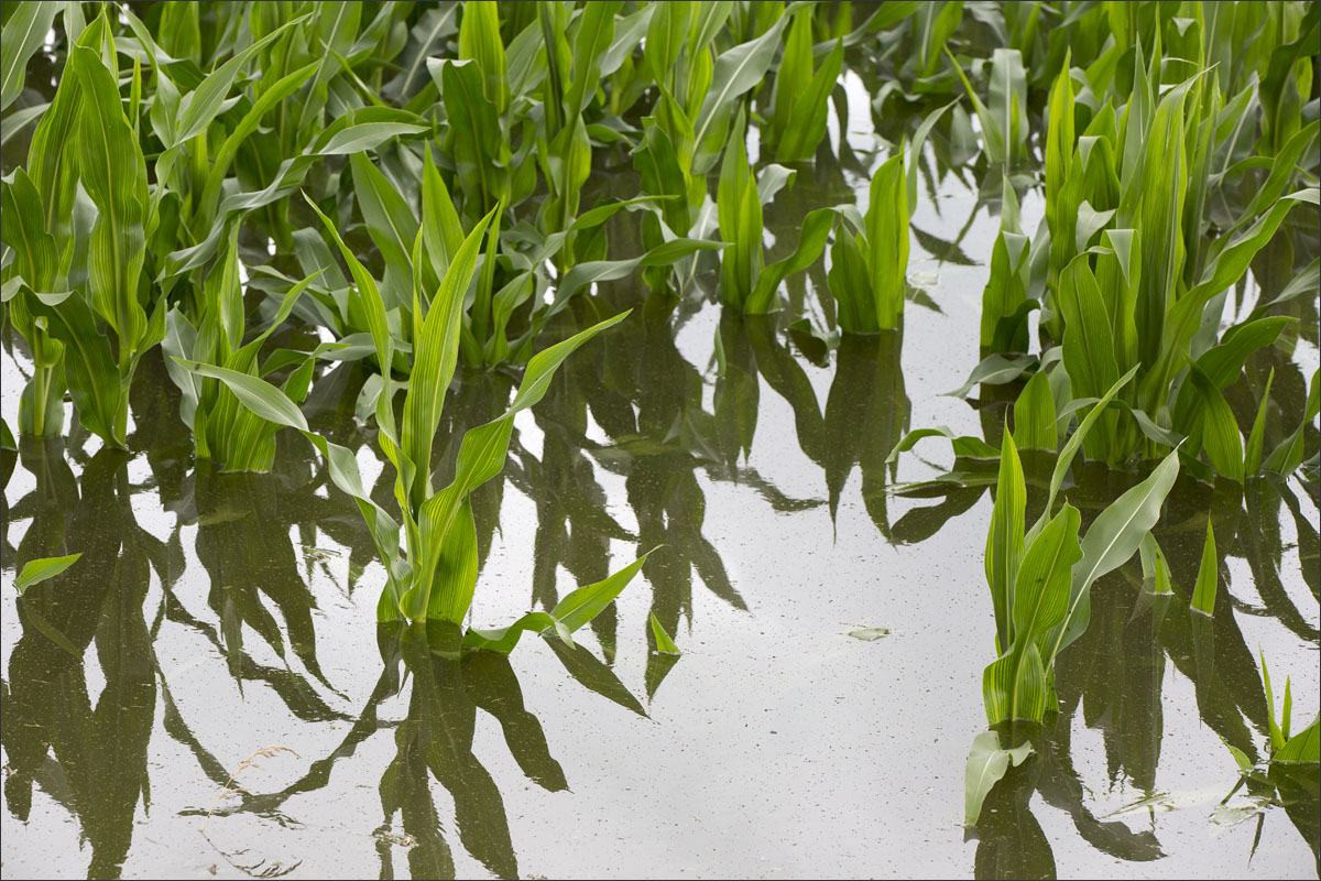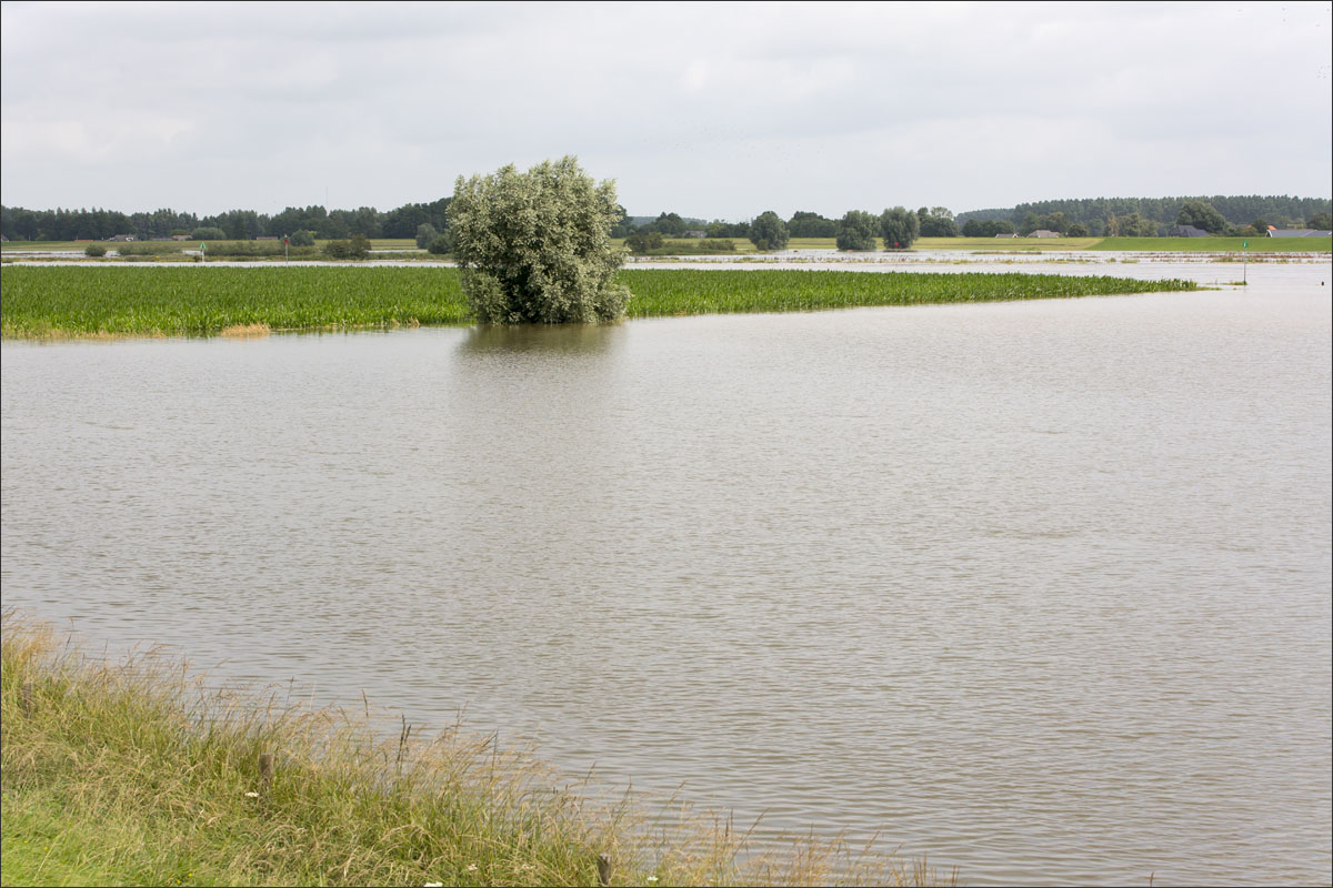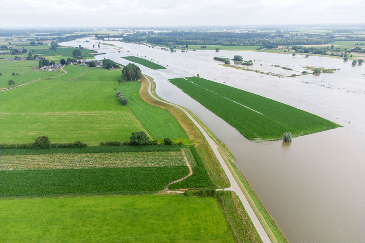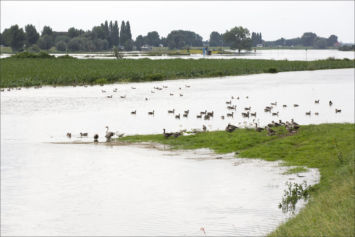 Foto’s van o.a. ondergelopen uiterwaarden met mais.