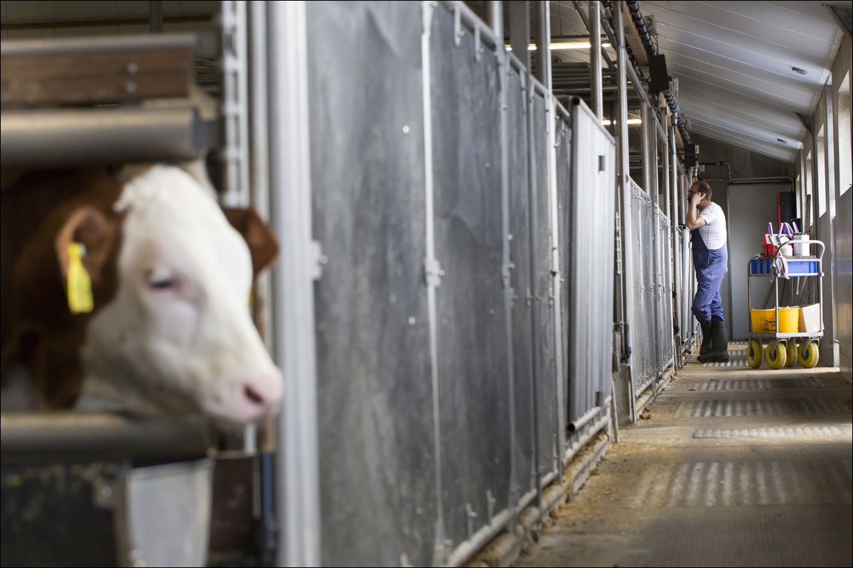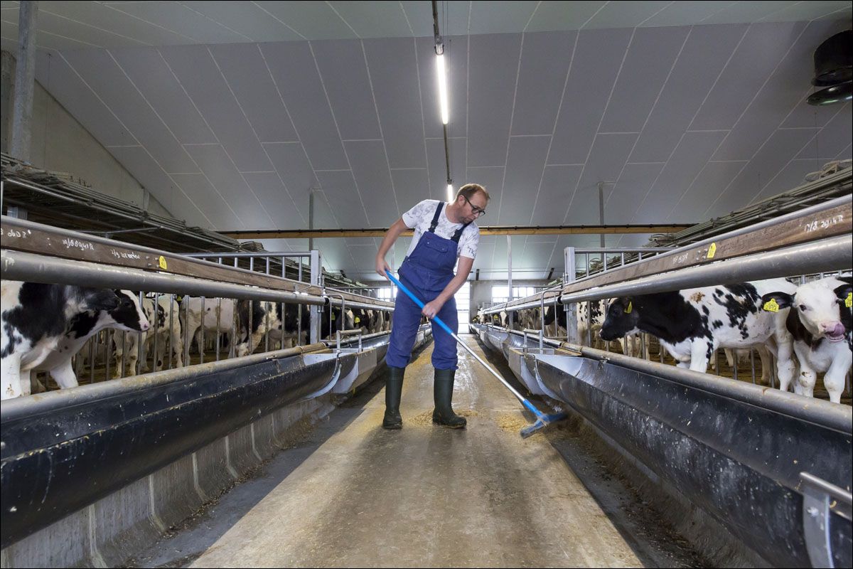 Foto’s van de boerderij, de kalveren in de stal en Wim Brouwer aan het werk.