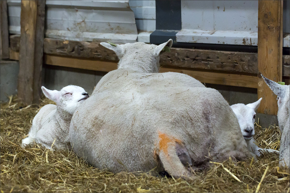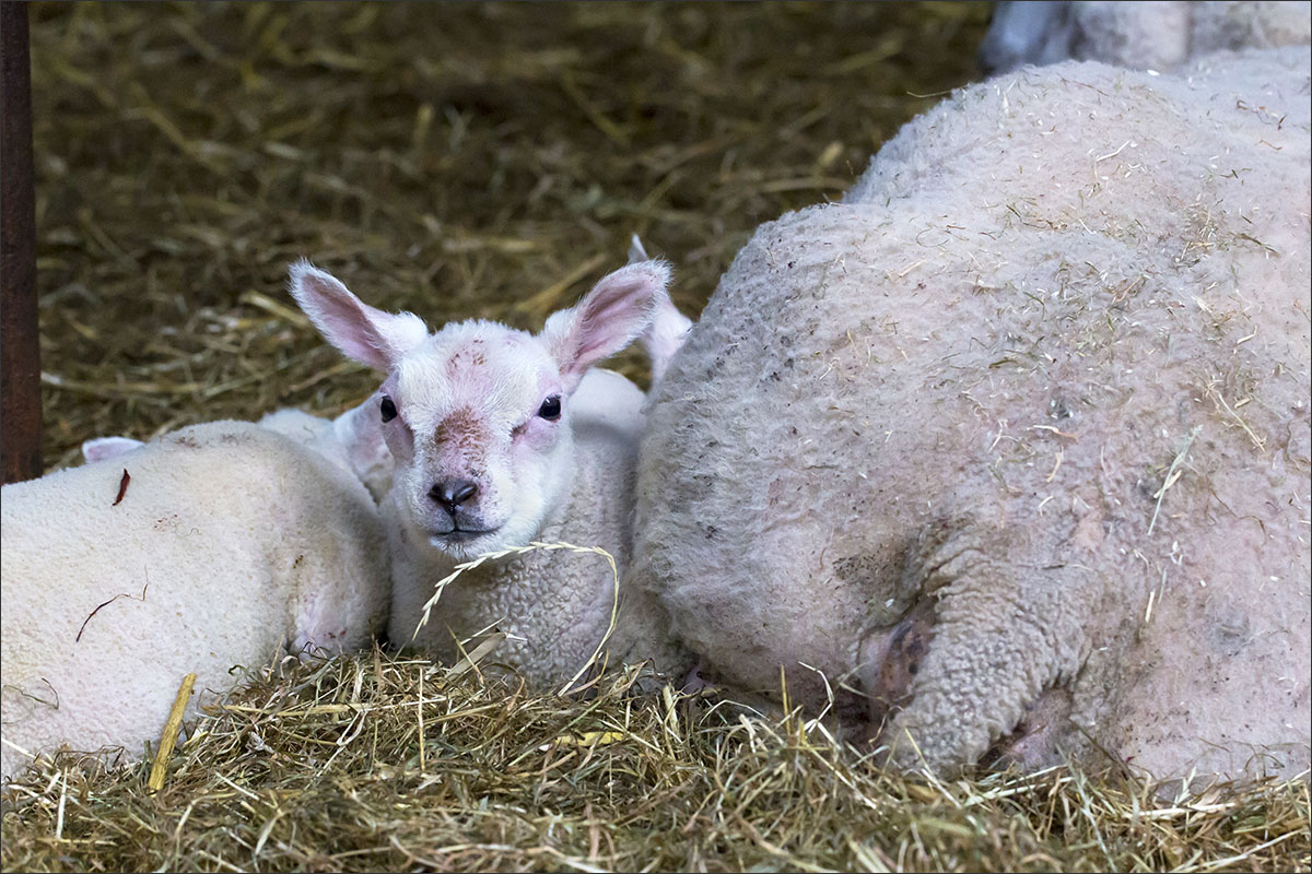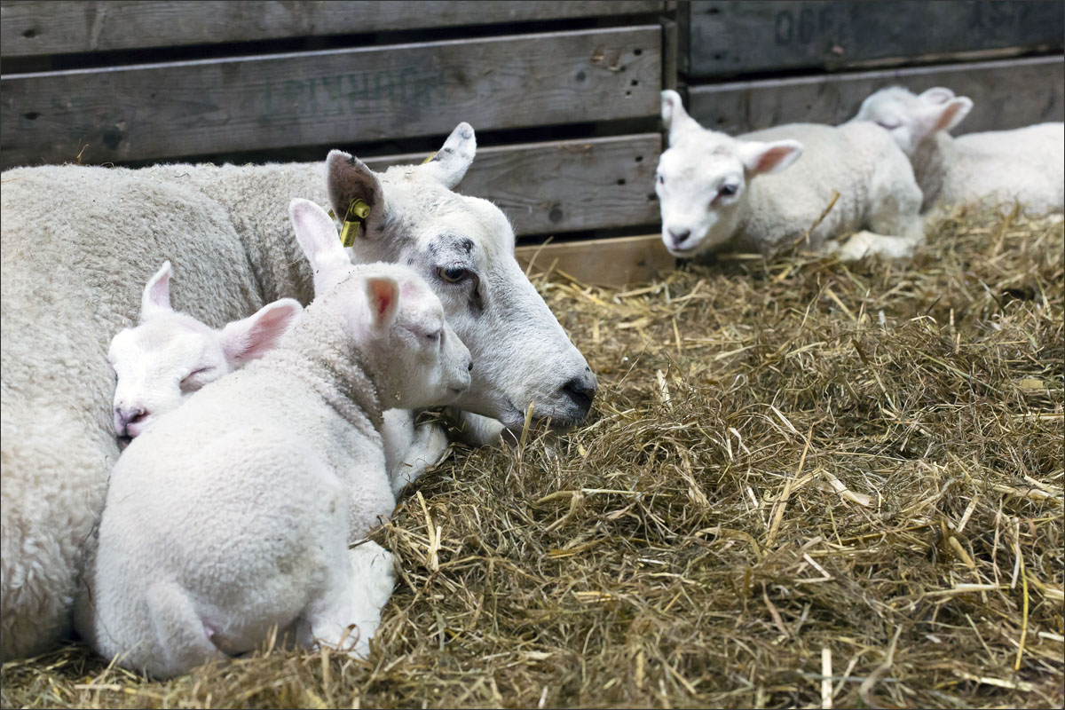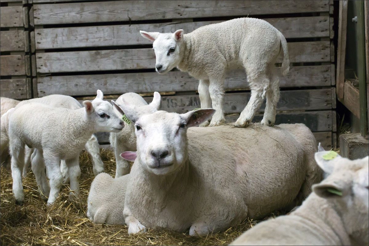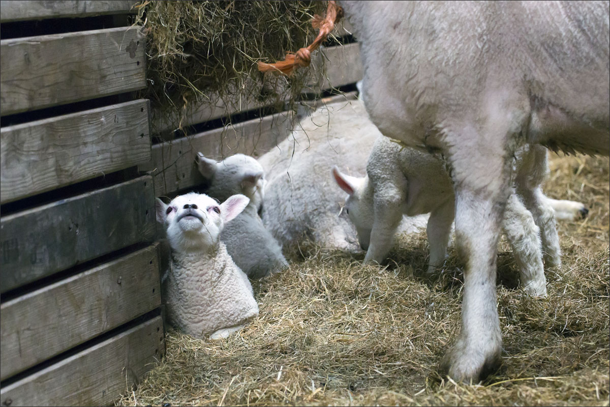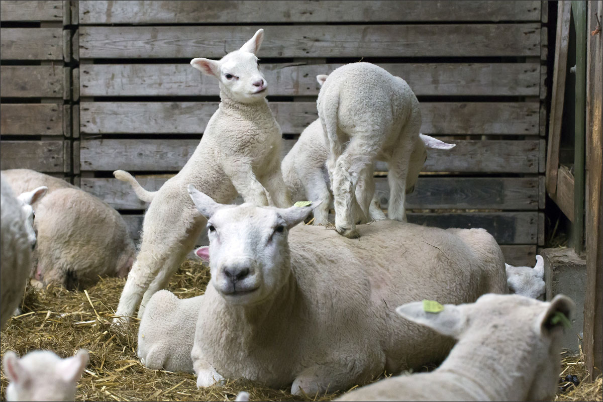 Foto’s van de lammeren binnen in de schuur op boerderij Zonneveld.