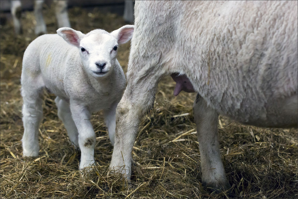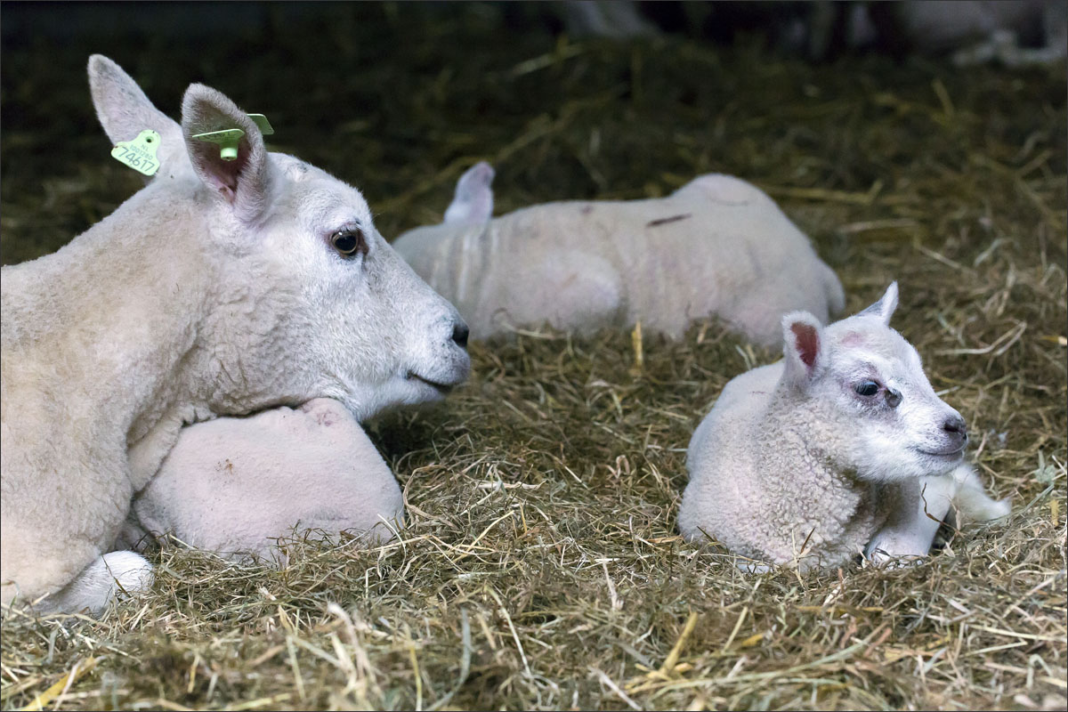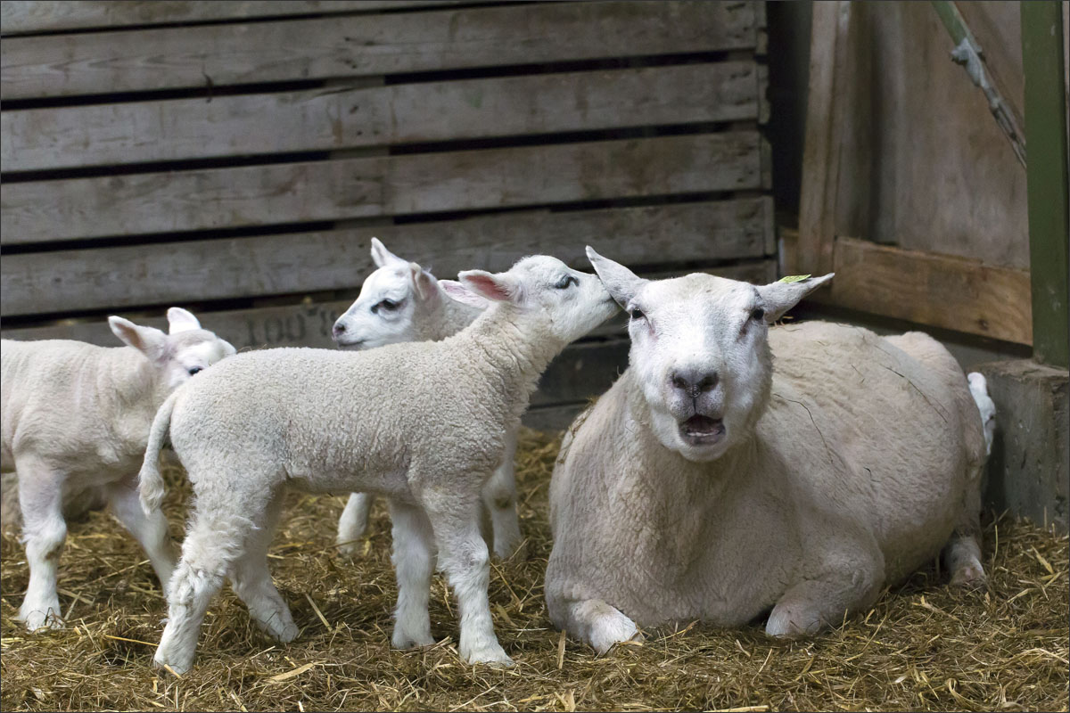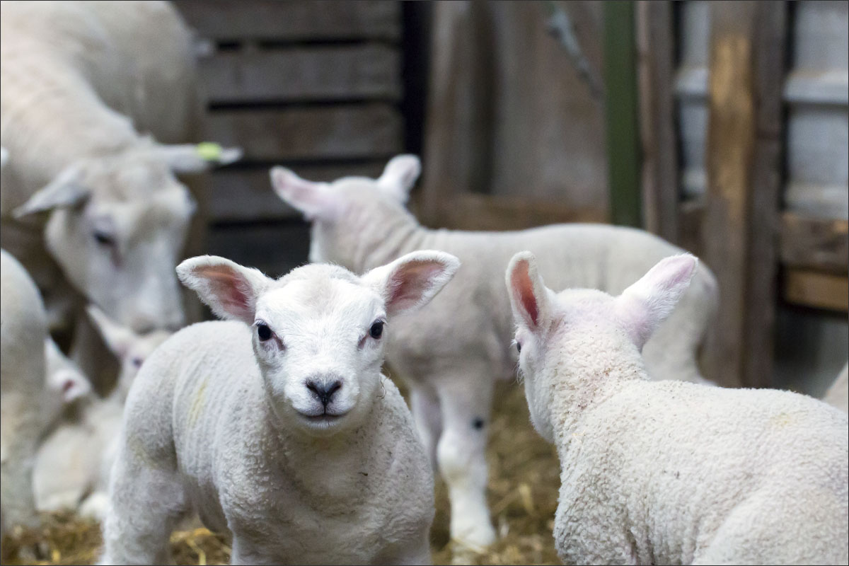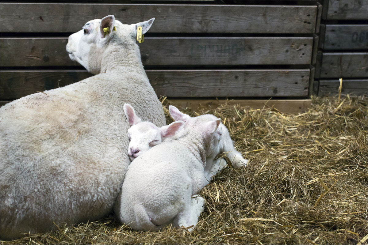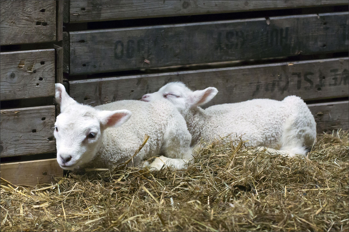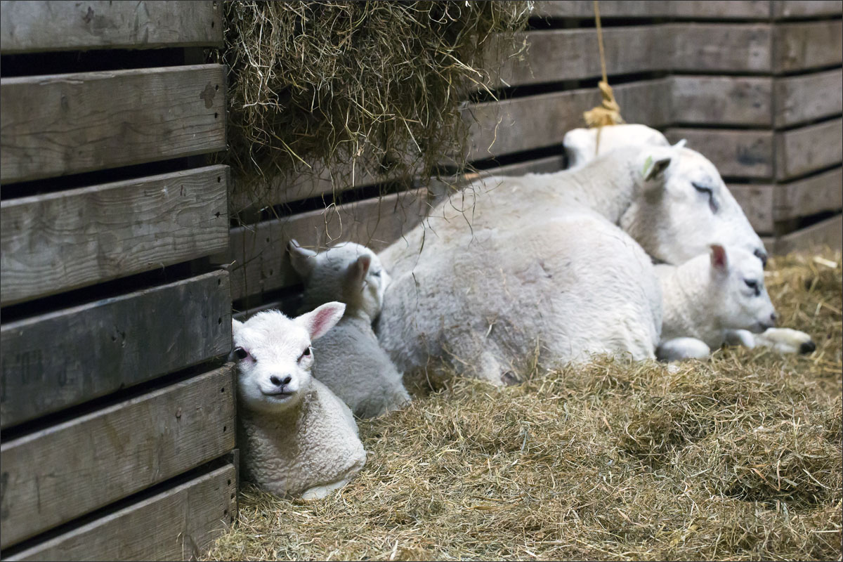 Foto’s van de lammeren binnen in de schuur op boerderij Zonneveld.