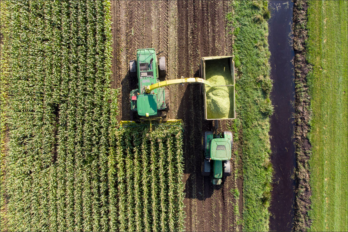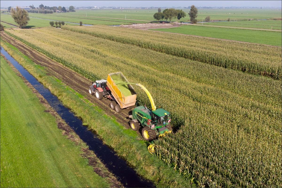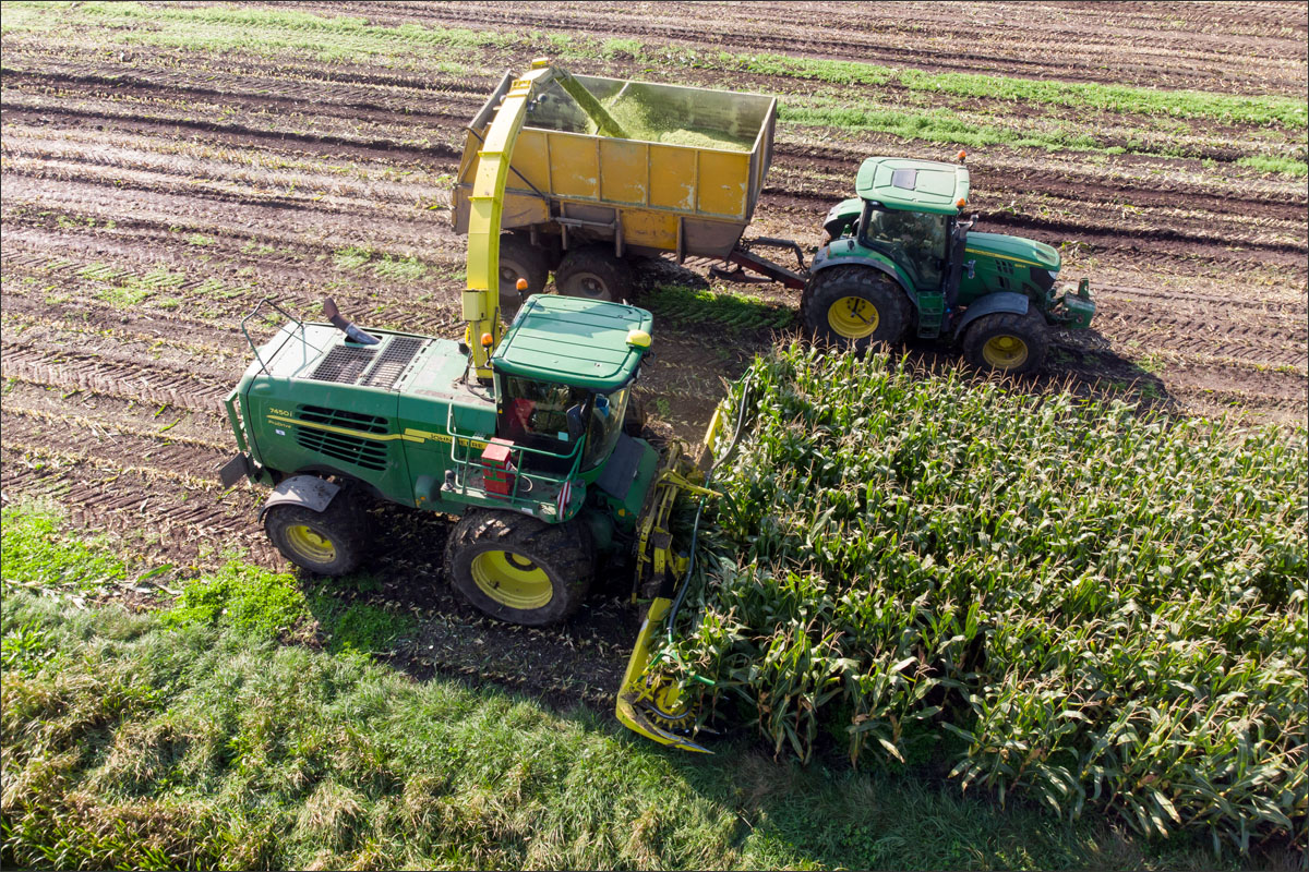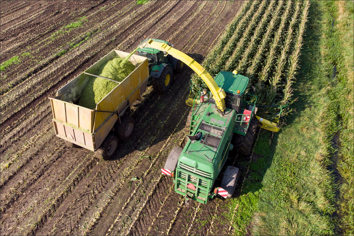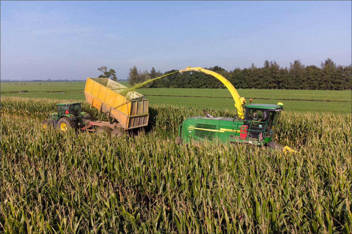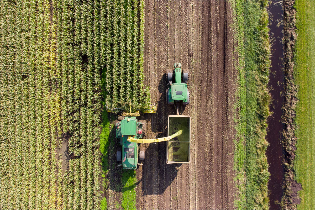 Luchtfoto’s van het maïs hakselen en inkuilen.
