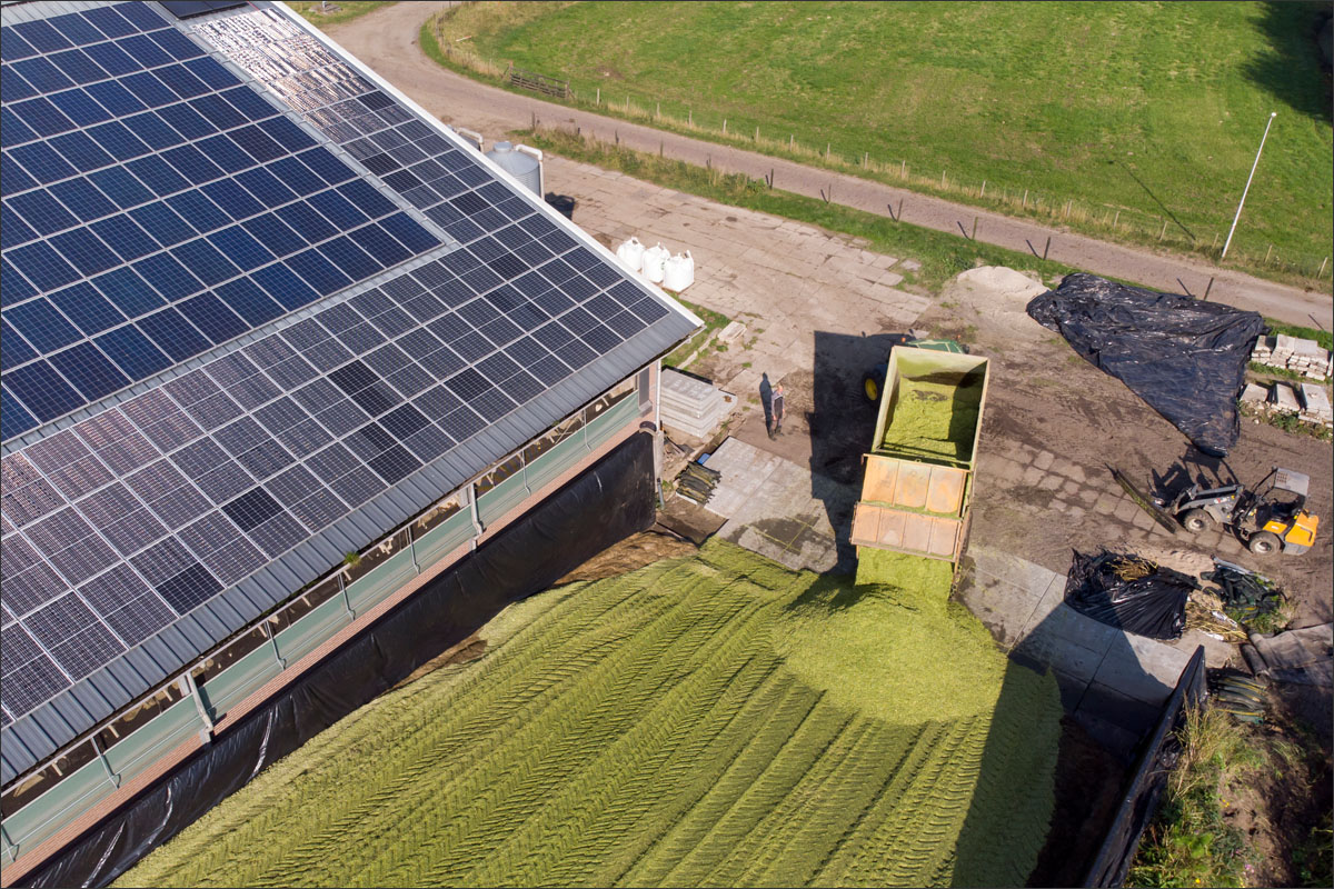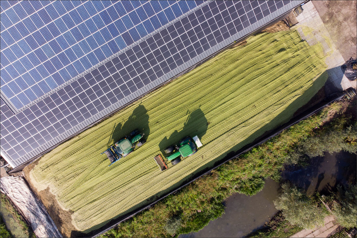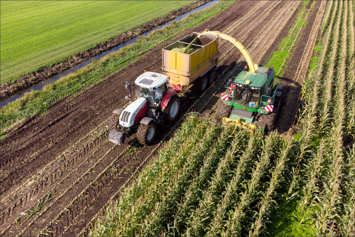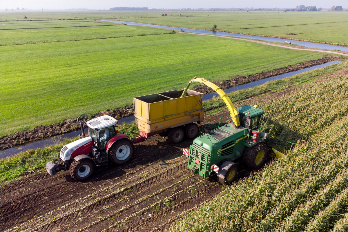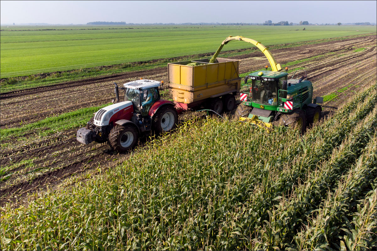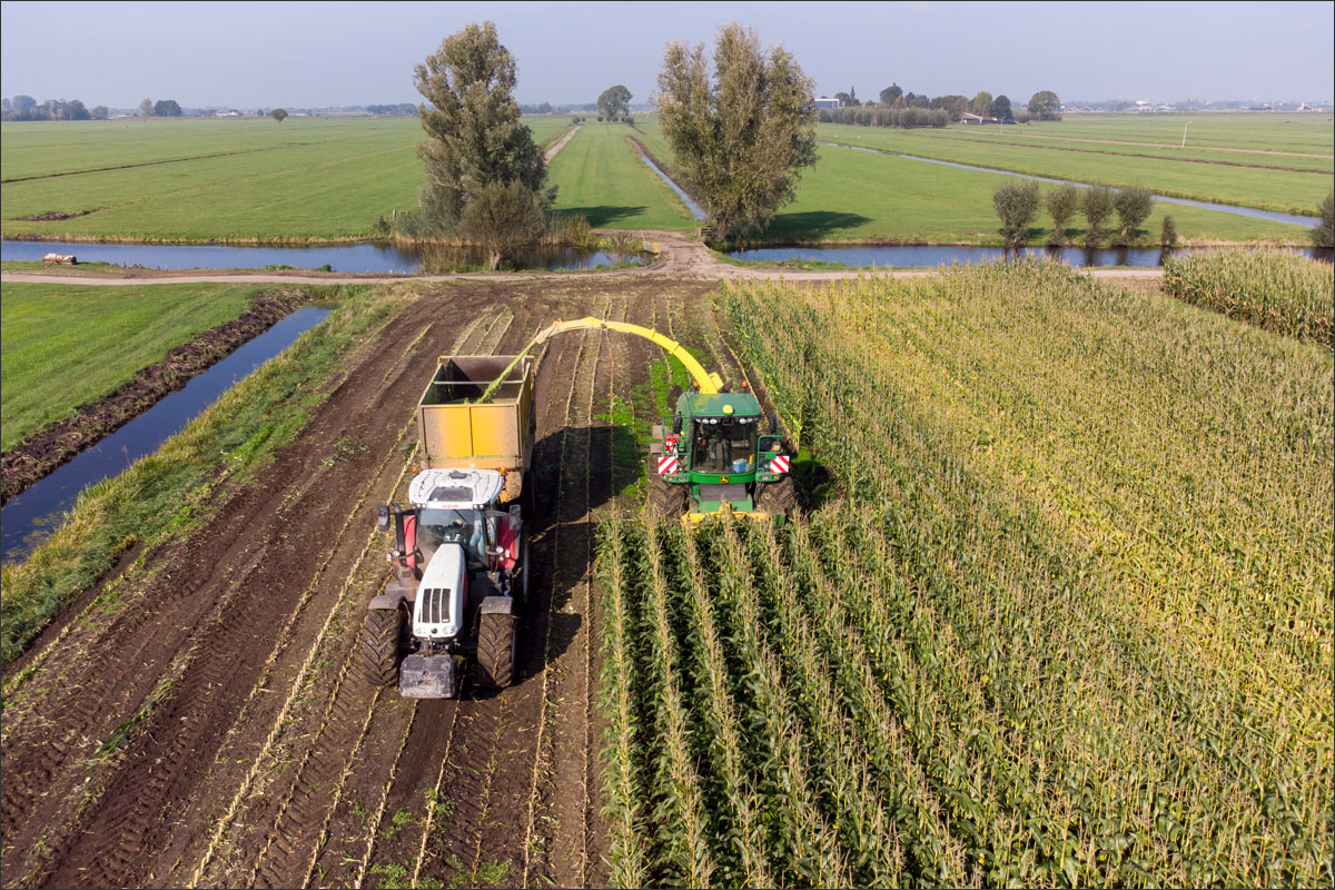 Luchtfoto’s van het maïs hakselen en inkuilen.