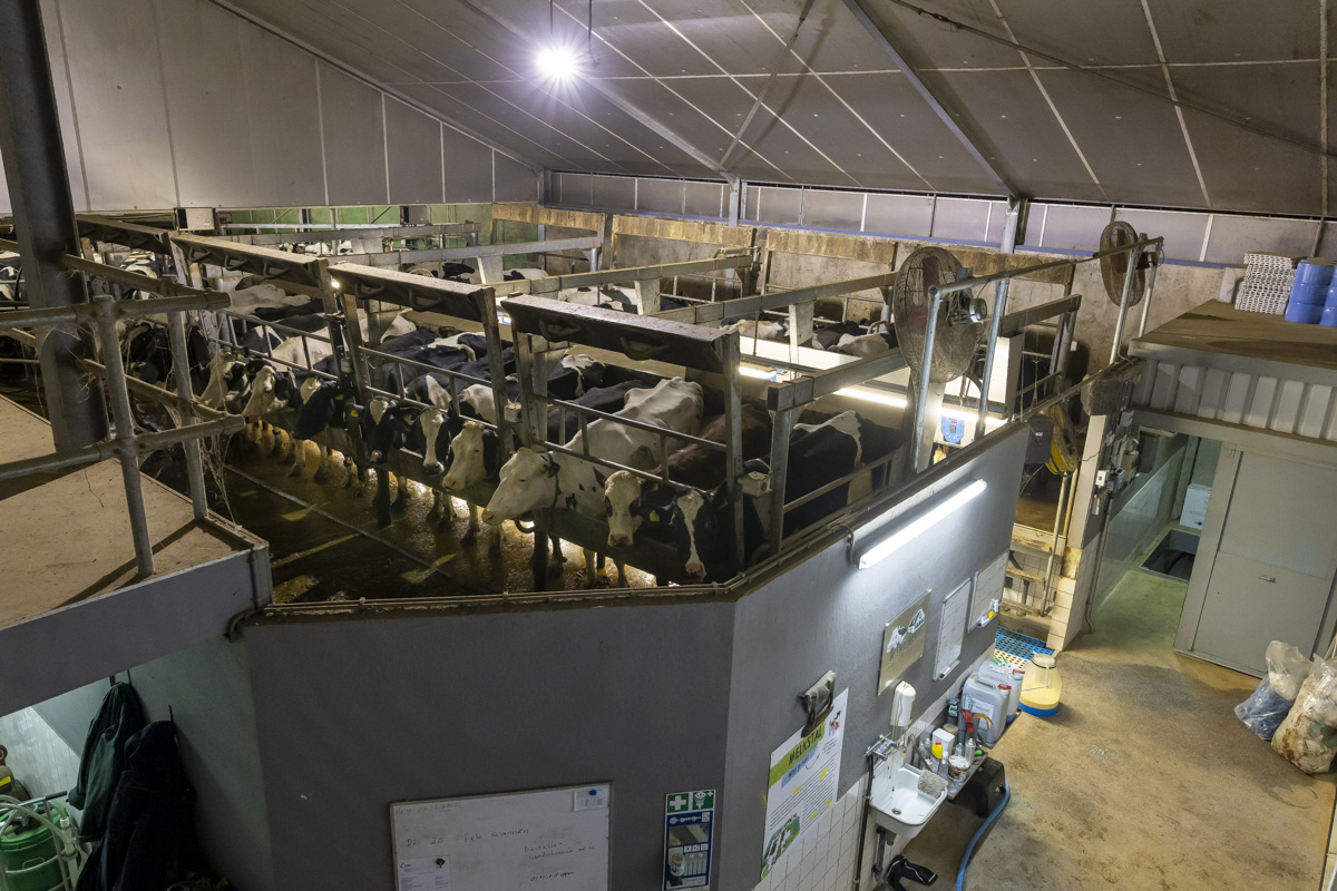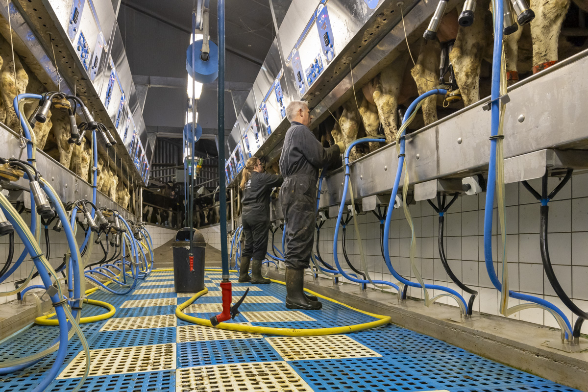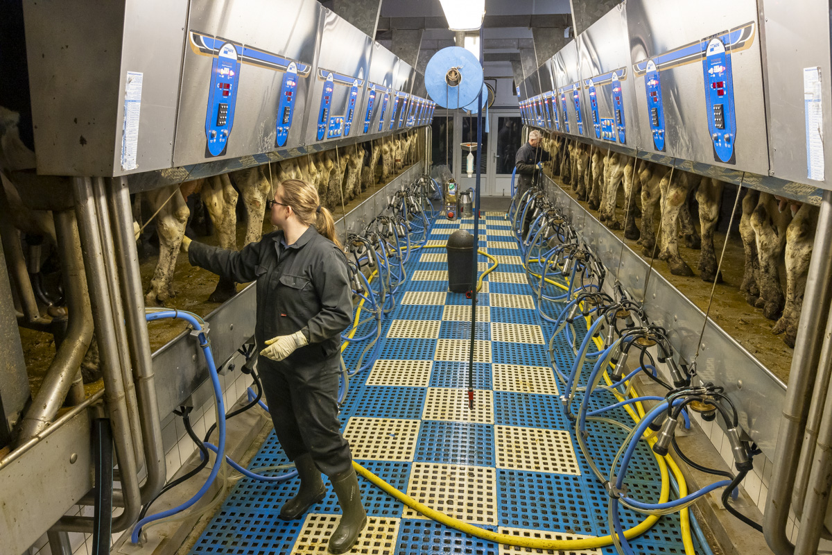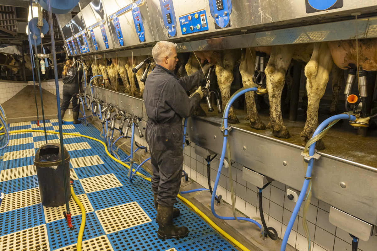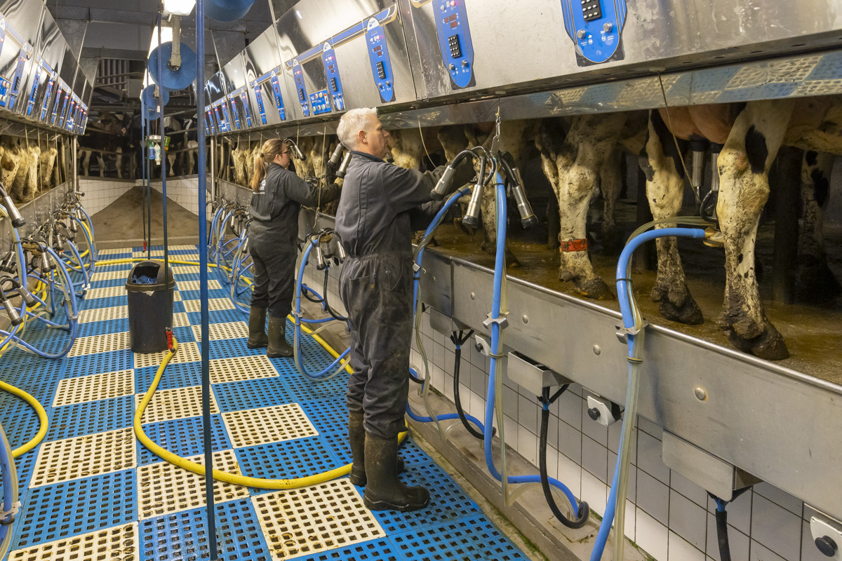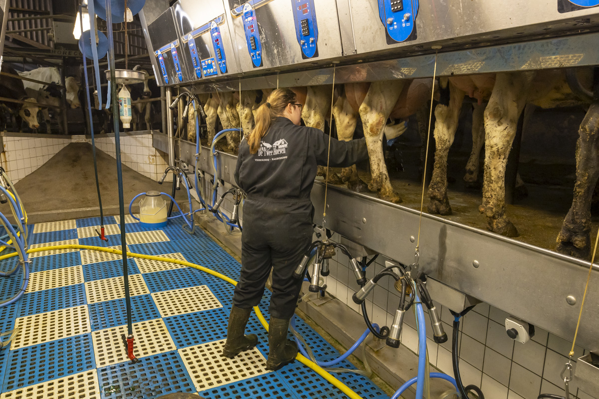 Tijdens het melken staan er in de melkstal 28 koeien in 2 rijen zij-aan-zij naast elkaar. De koeien worden tussen de achterpoten door gemolken.