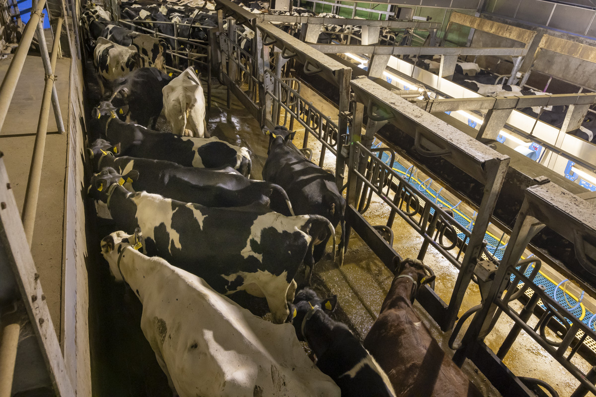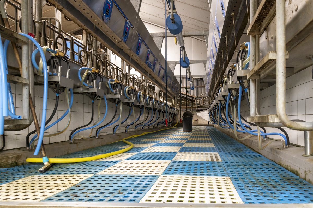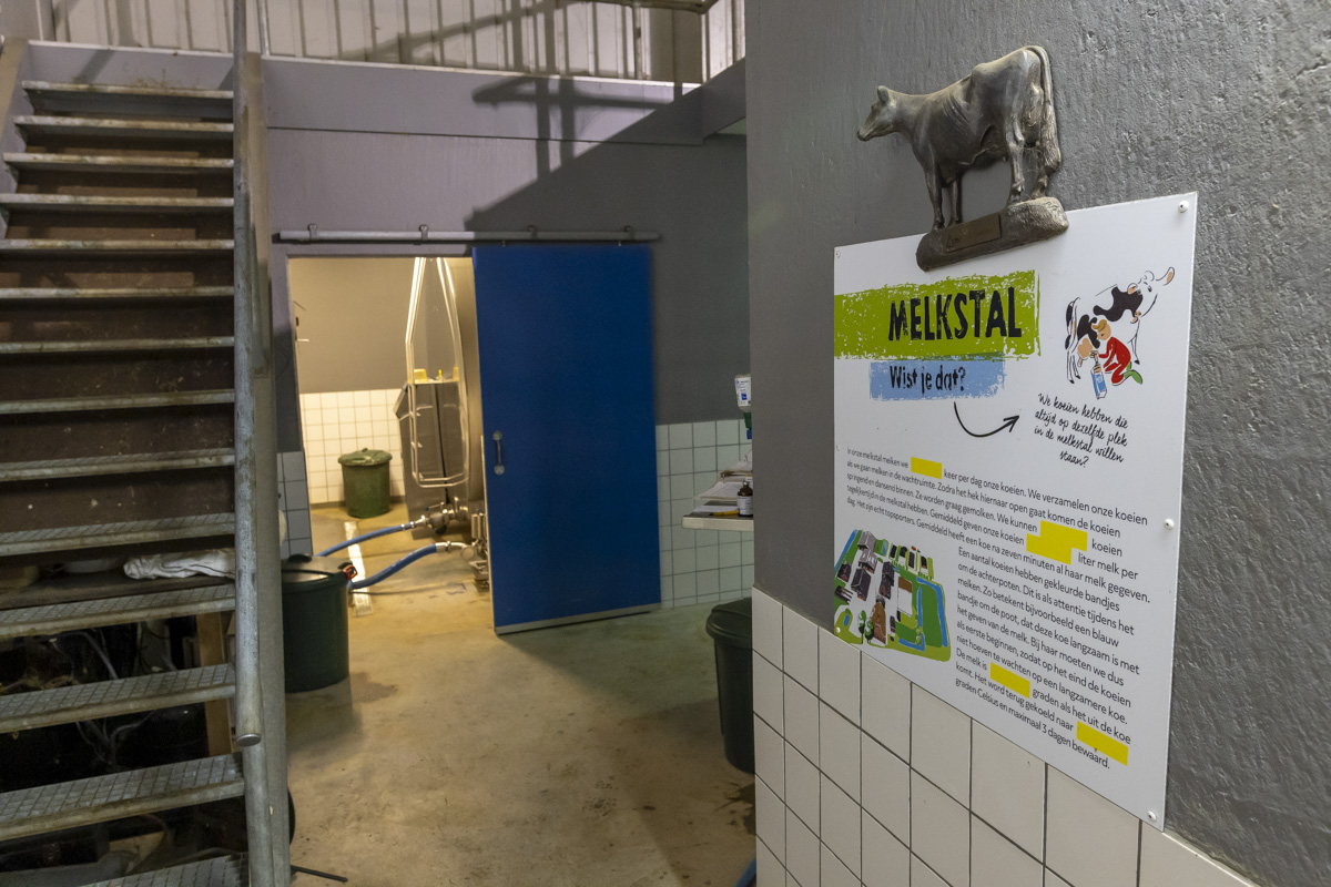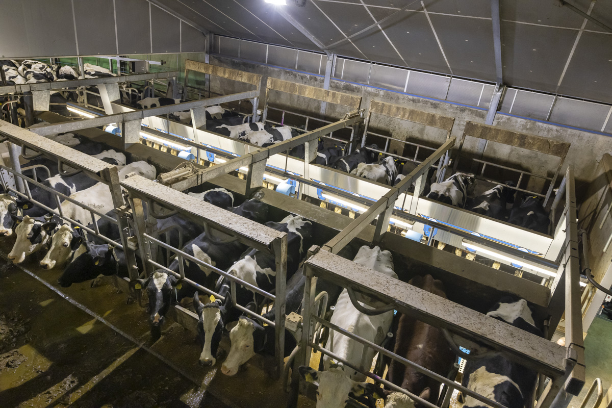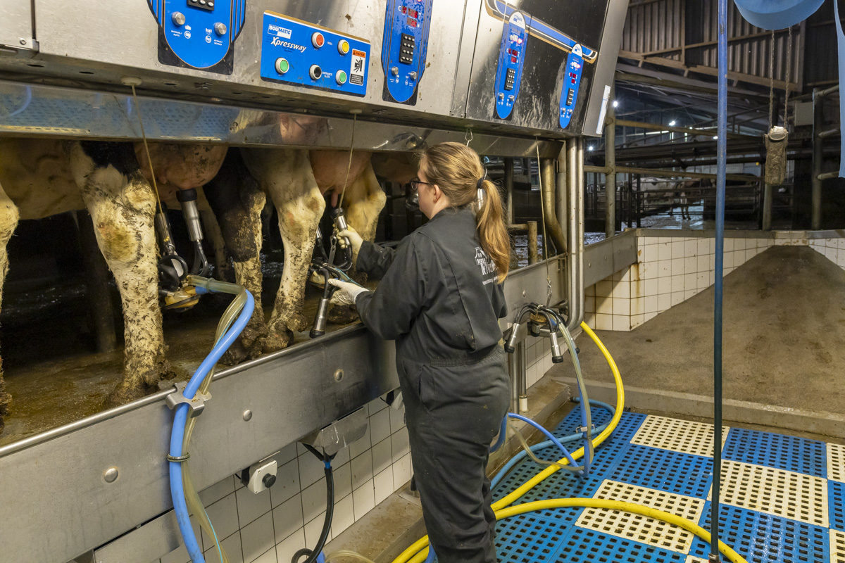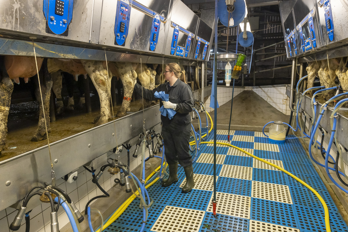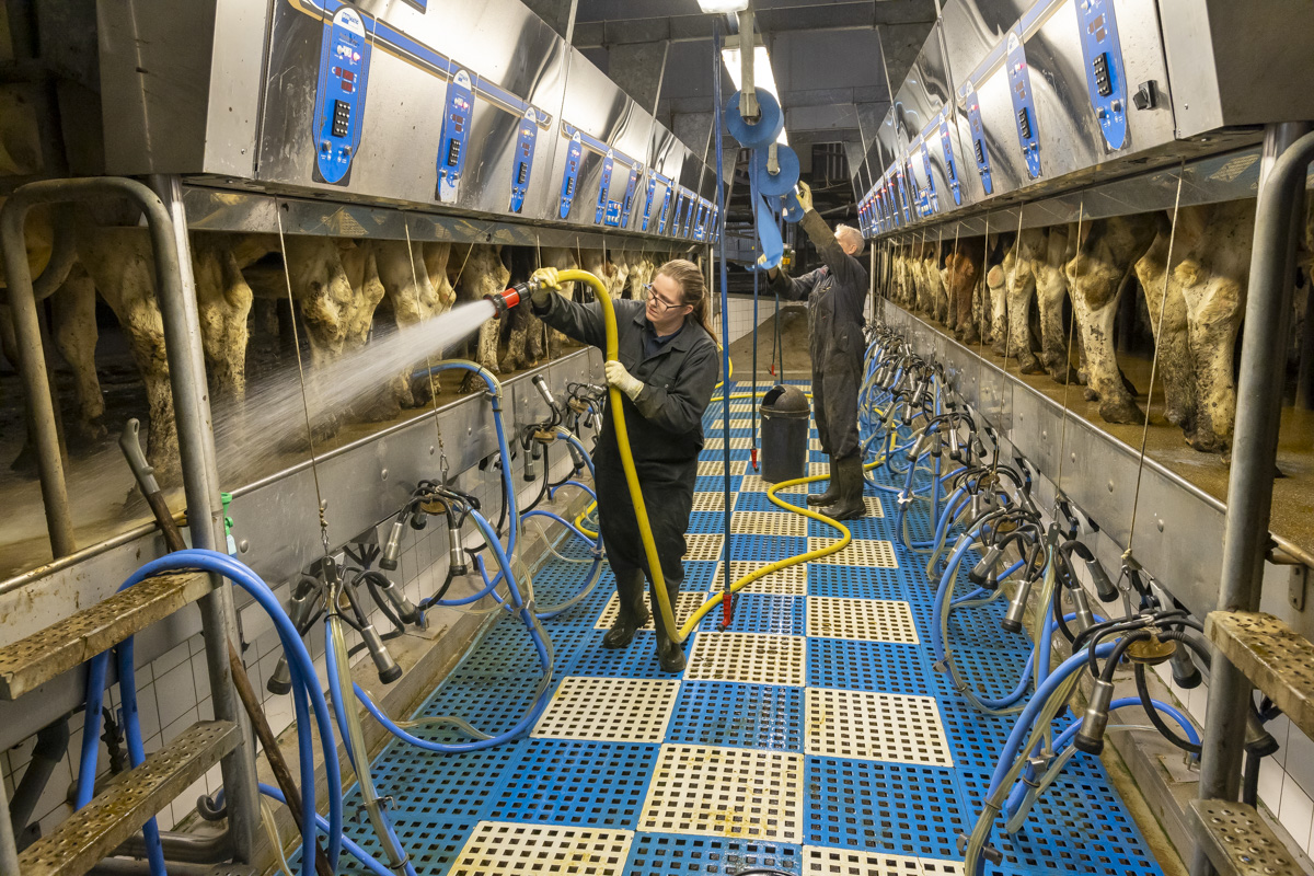 Tijdens het melken staan er in de melkstal 28 koeien in 2 rijen zij-aan-zij naast elkaar. De koeien worden tussen de achterpoten door gemolken.