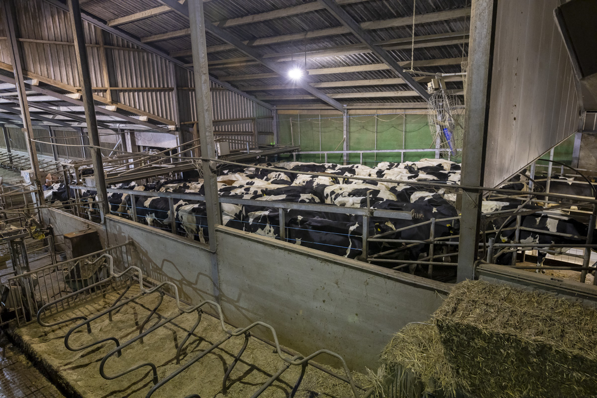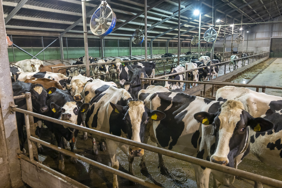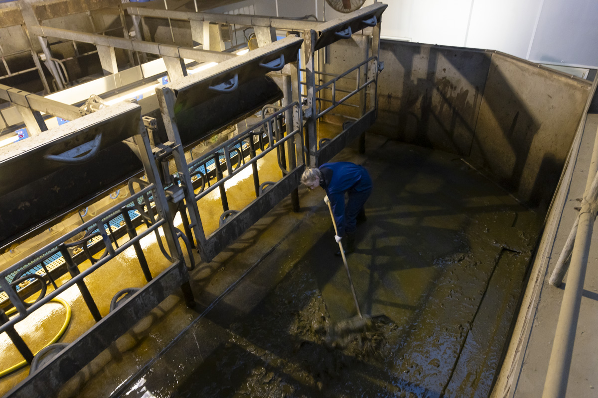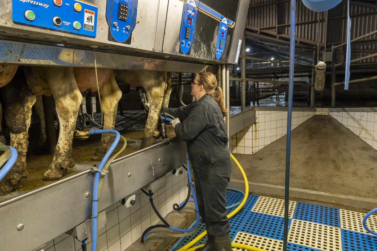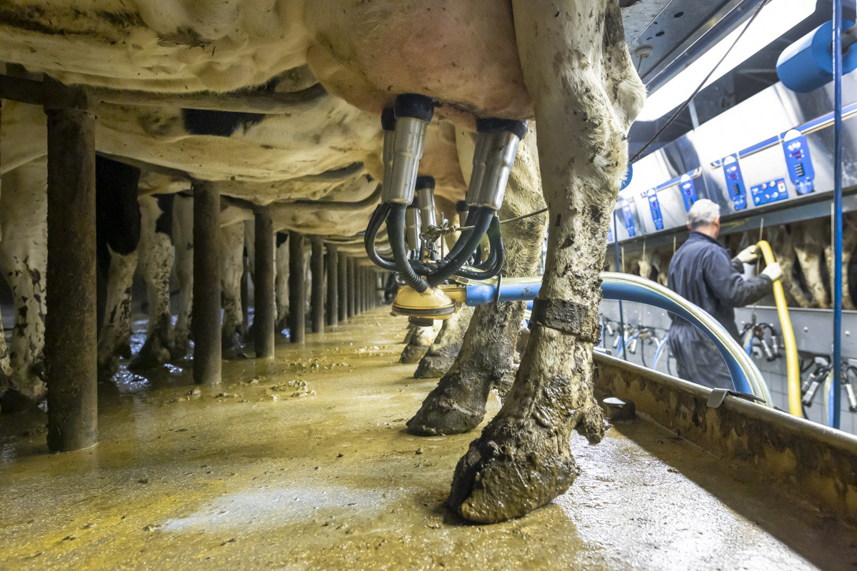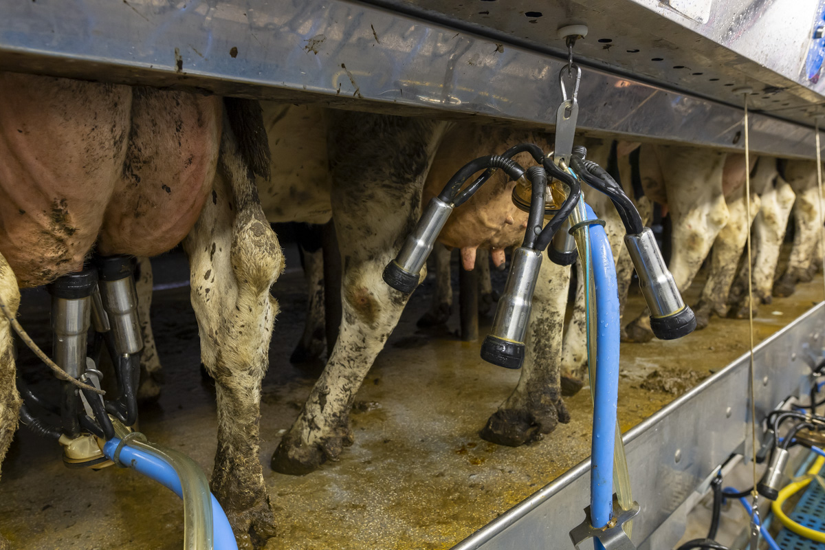 Tijdens het melken staan er in de melkstal 28 koeien in 2 rijen zij-aan-zij naast elkaar. De koeien worden tussen de achterpoten door gemolken.
