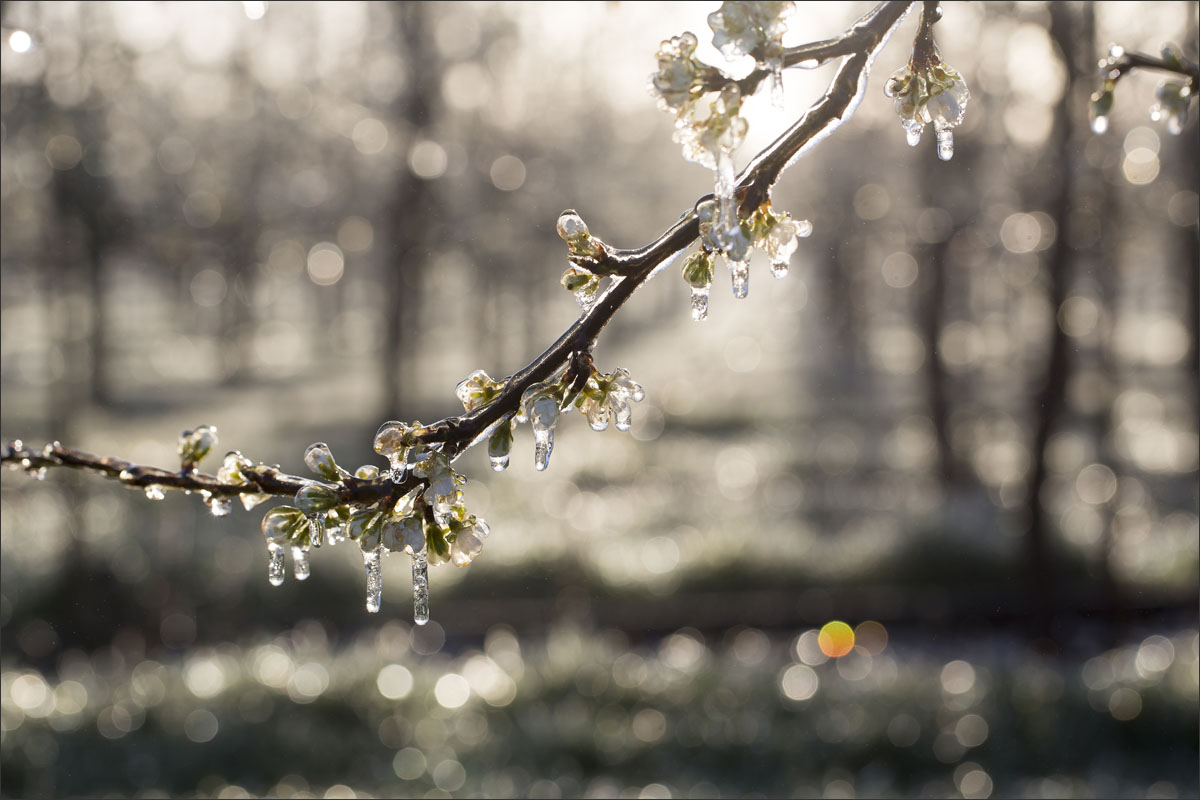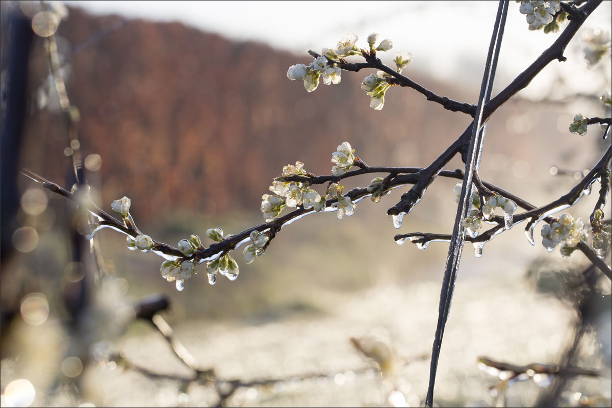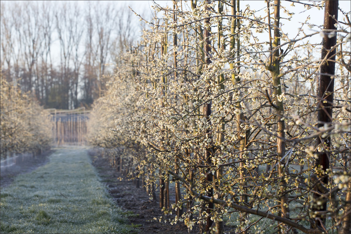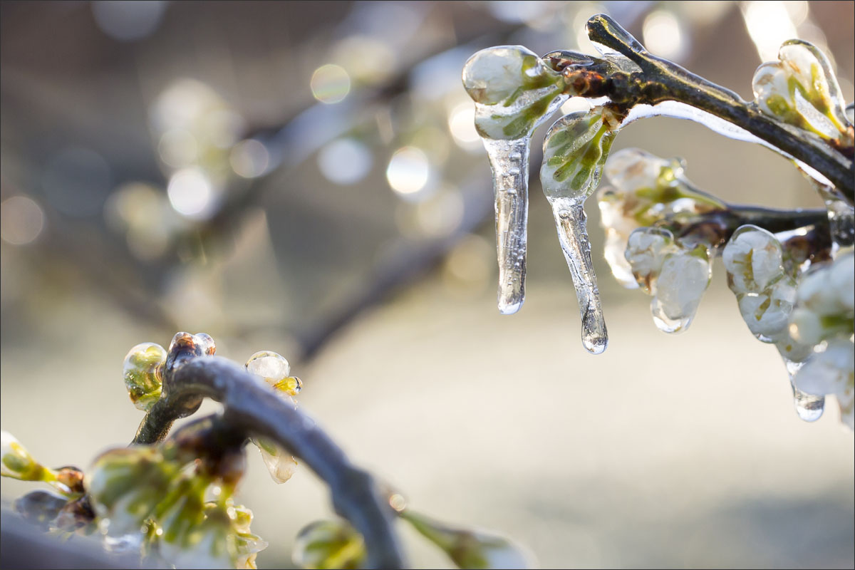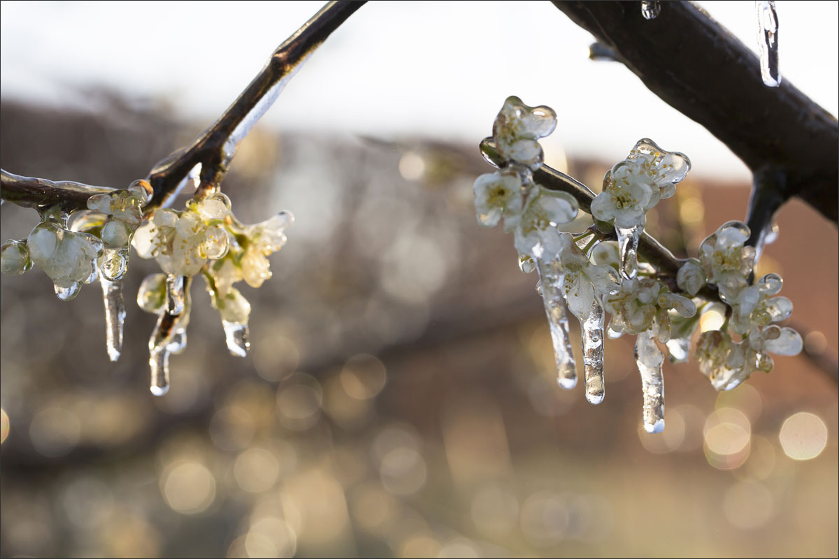 Nachtvorstbestrijding d.m.v. beregening. Tijdens het beregenen vormt zich een laagje ijs om de bloesem. Bij de overgang van water naar ijs komt energie vrij, de zogenaamde stollingswarmte. Deze warmte zorgt ervoor dat de temperatuur rondom de bloesem niet verder daalt dan 0° C. Zo blijft de bloesem beschermd.