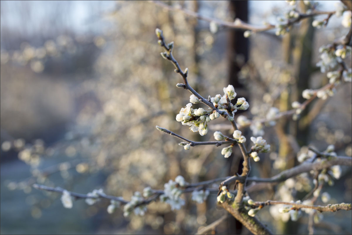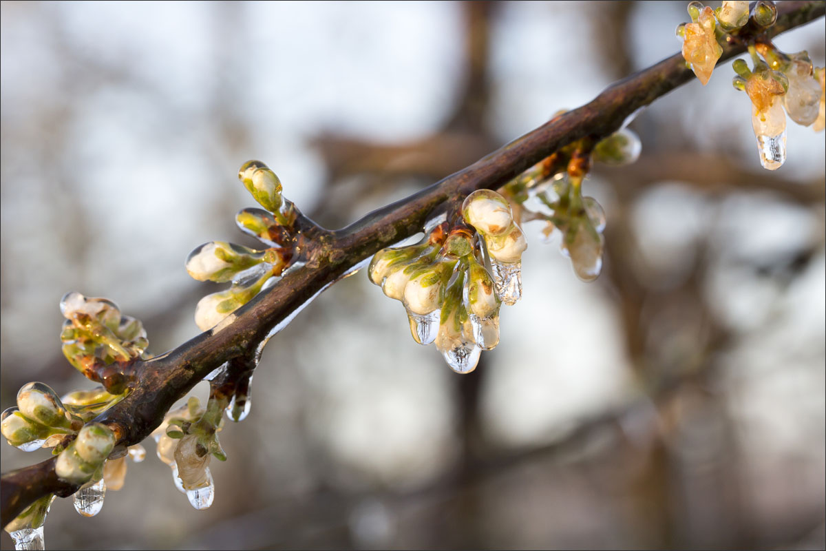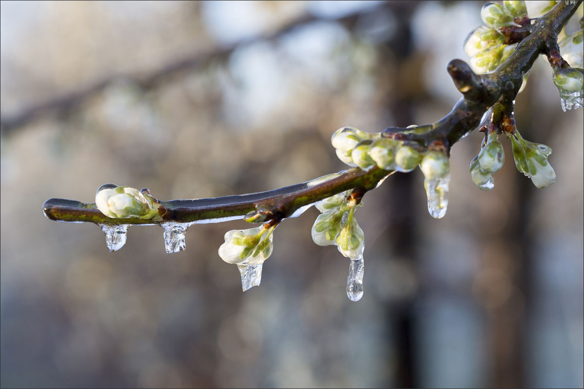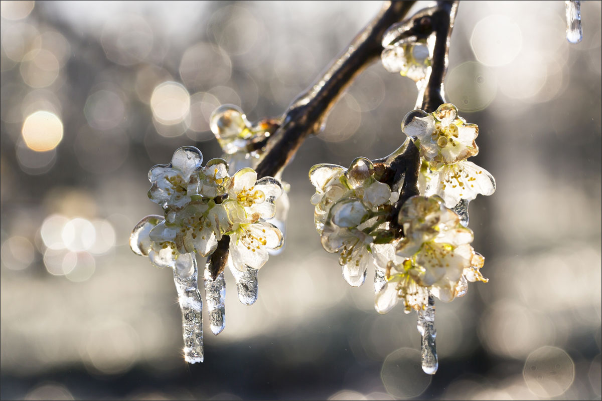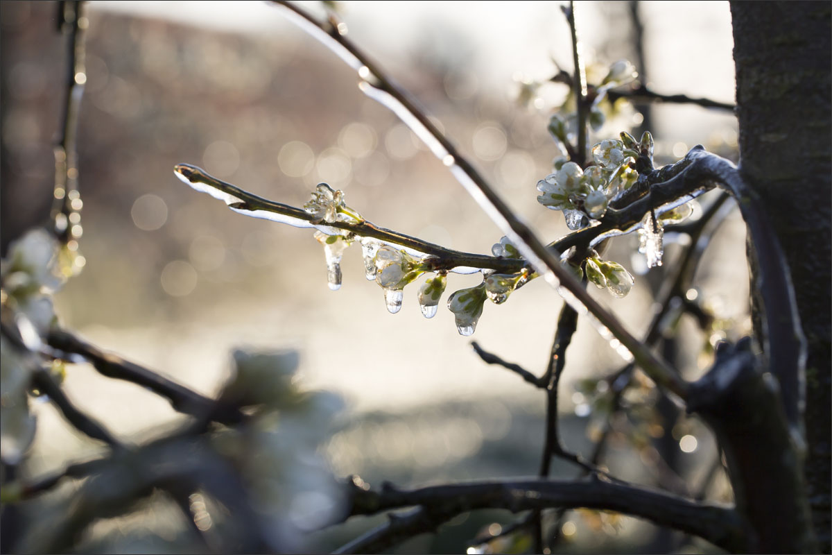 Nachtvorstbestrijding d.m.v. beregening. Tijdens het beregenen vormt zich een laagje ijs om de bloesem. Bij de overgang van water naar ijs komt energie vrij, de zogenaamde stollingswarmte. Deze warmte zorgt ervoor dat de temperatuur rondom de bloesem niet verder daalt dan 0° C. Zo blijft de bloesem beschermd.