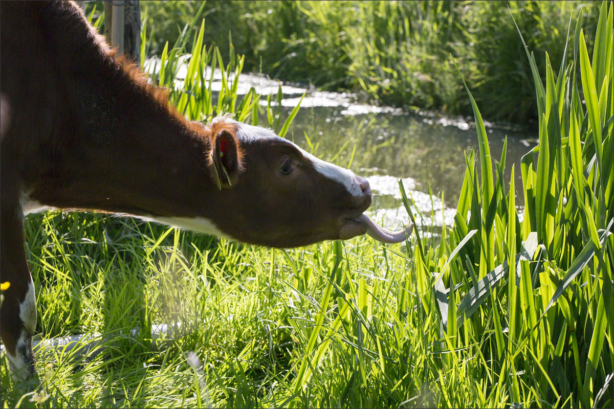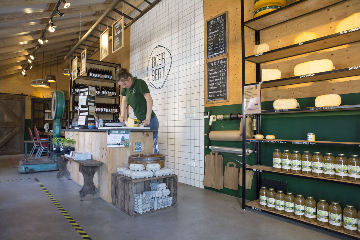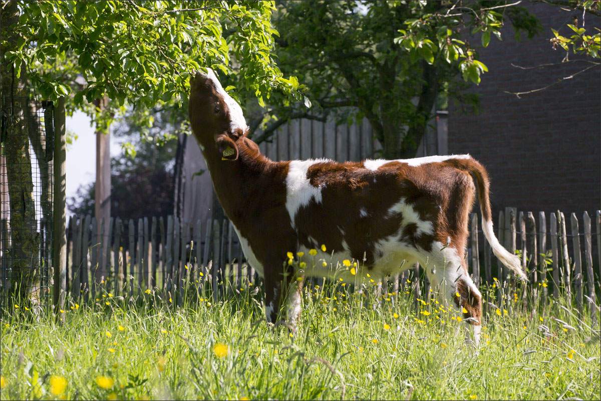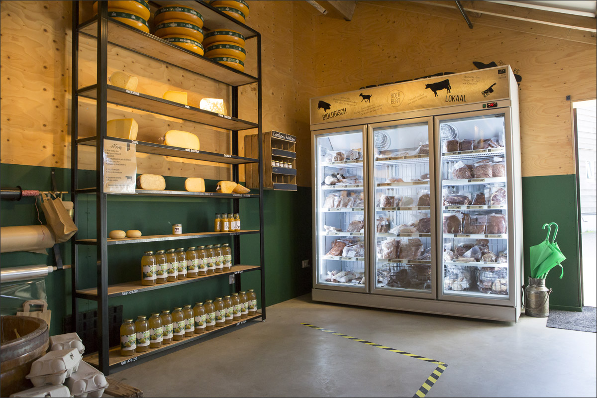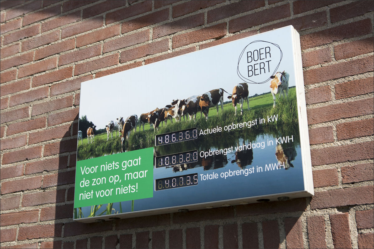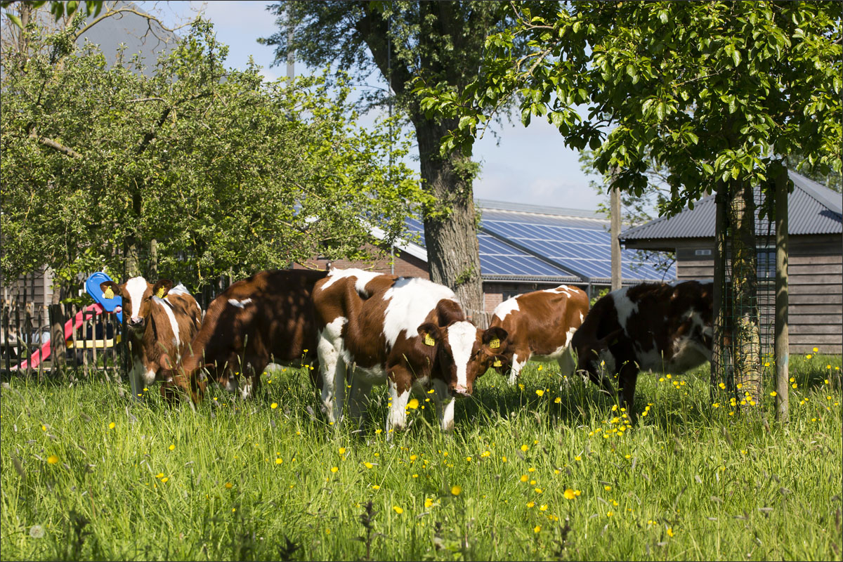 Foto’s van de boerderij, de ingepakte hooibalen, de zonnepanelen op het dak van de schuur, het gras maaien, de boerderijwinkel en de kalfjes buiten in de boomgaard.
