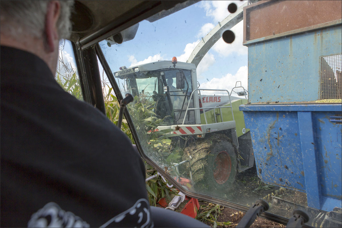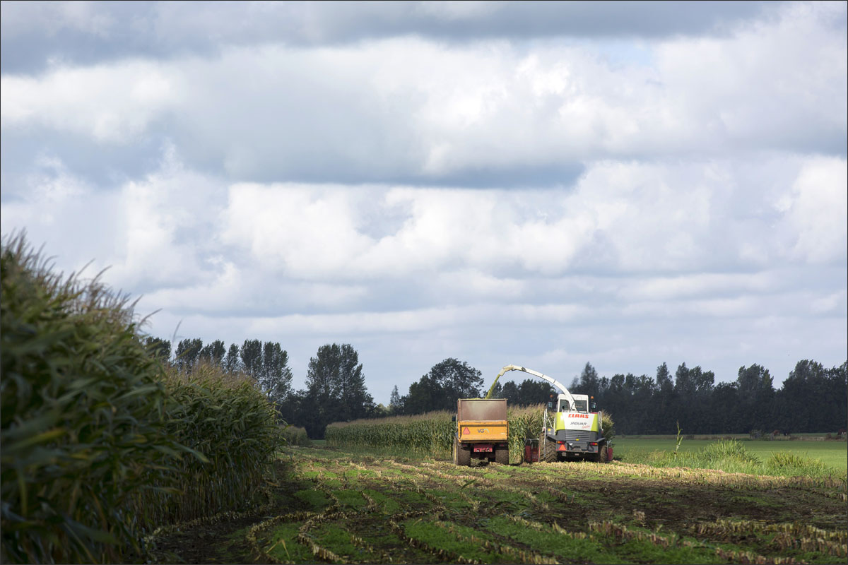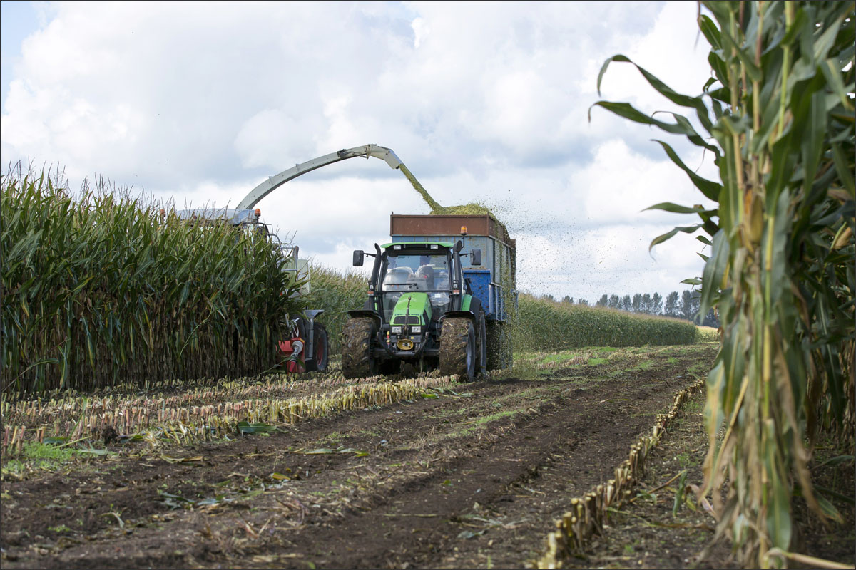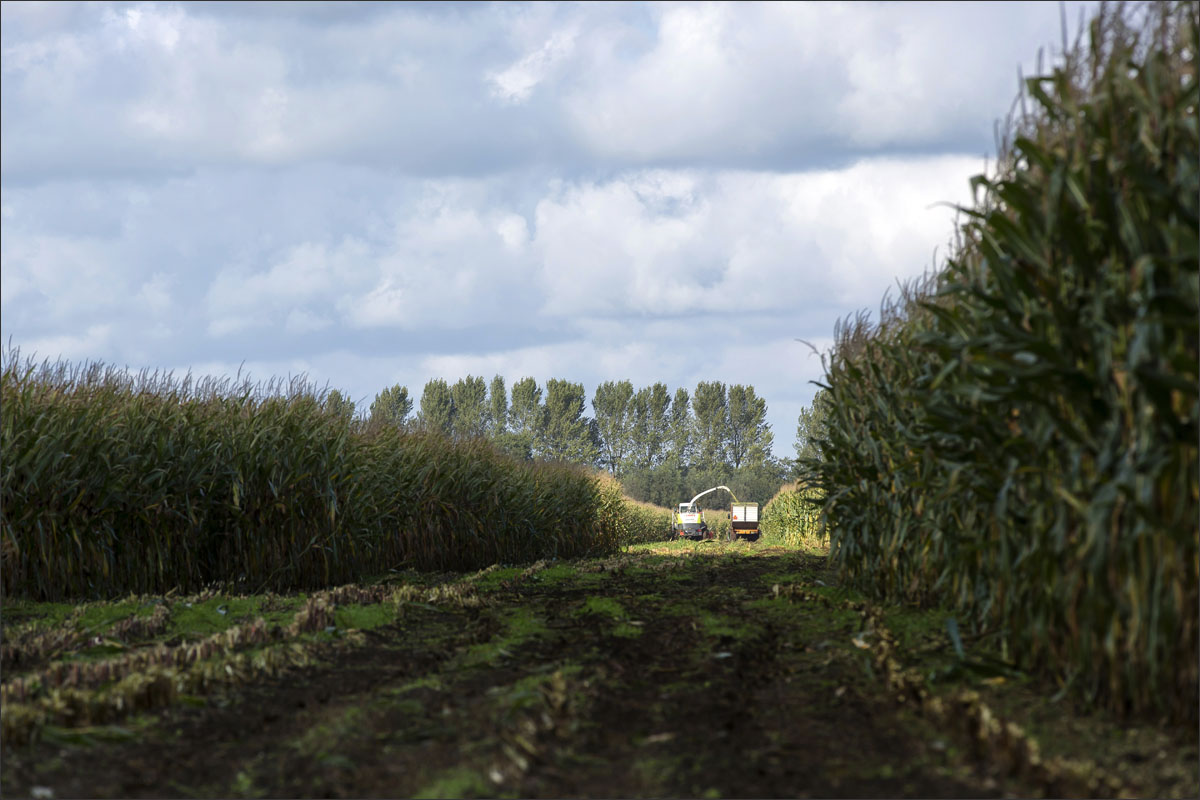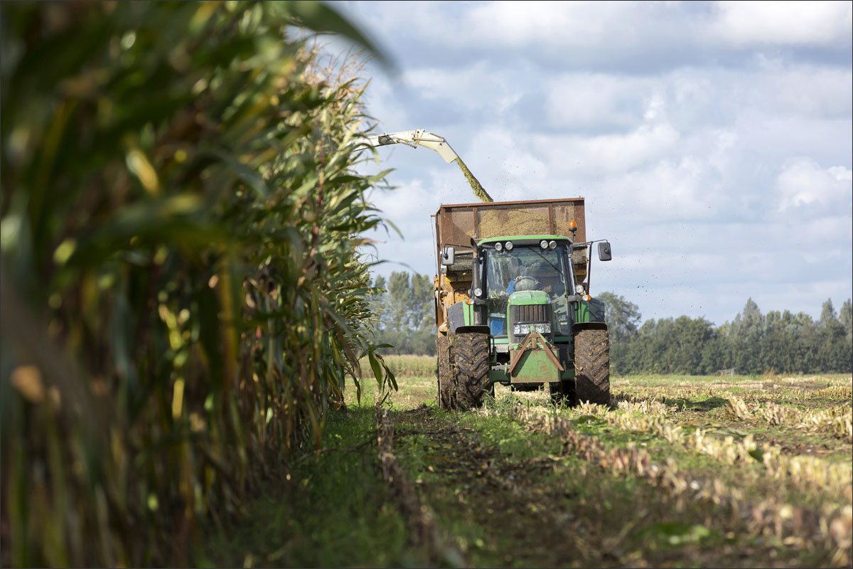 Foto’s van het zaaien van de maïs, de ontwikkeling (groei) en het hakselen van de snijmaïs.