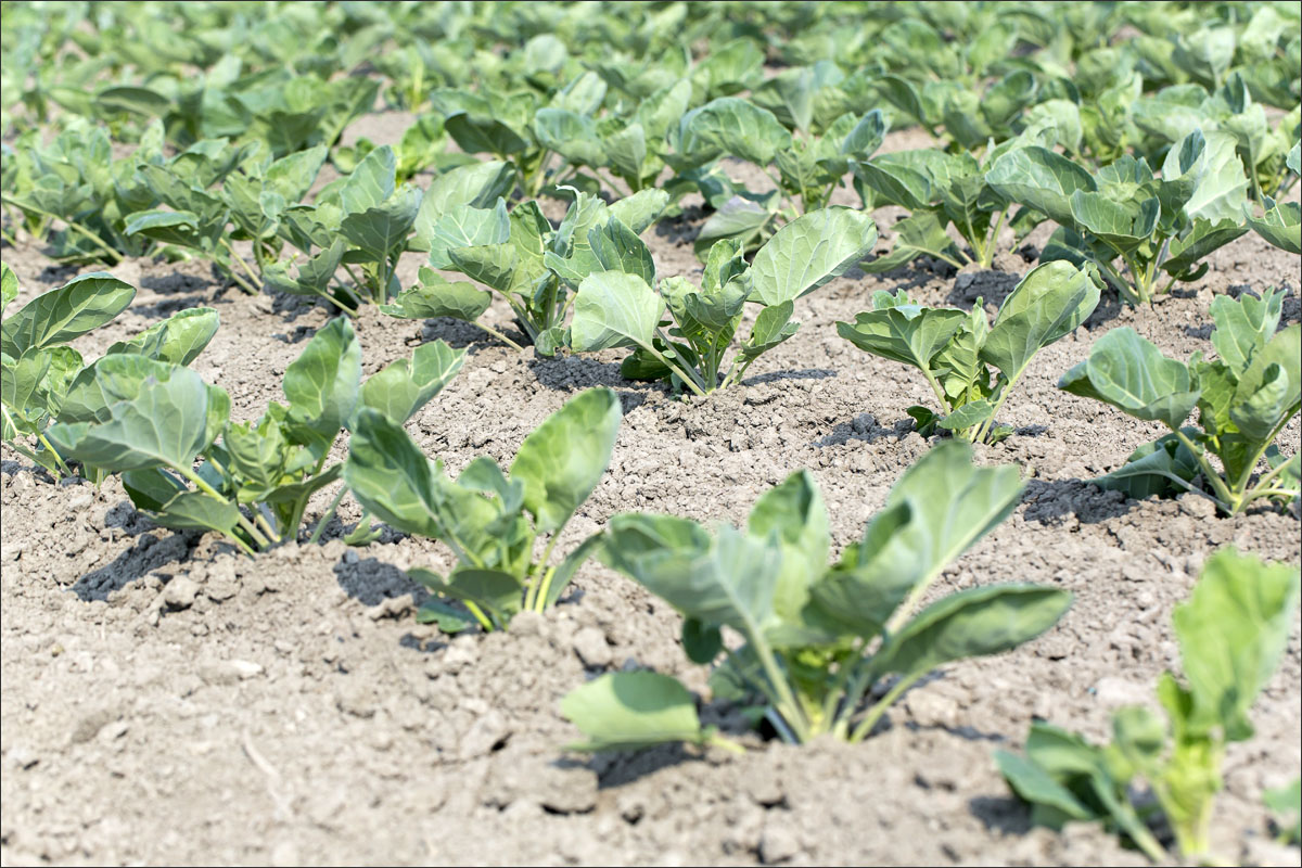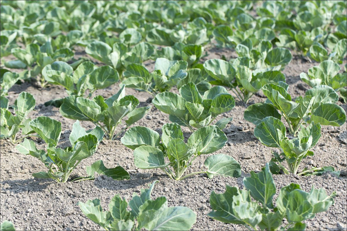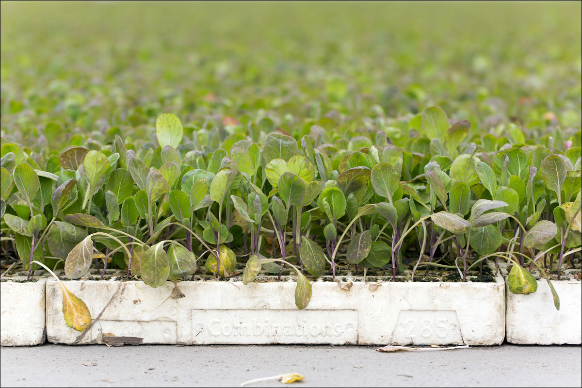 De jonge plantjes van de spruitkool worden gepoot en je ziet de groei van de planten gedurende het seizoen.