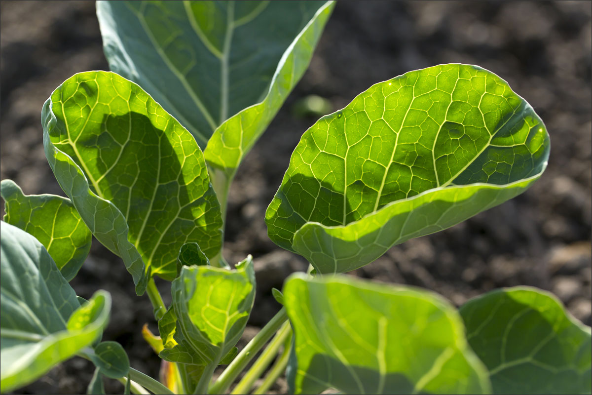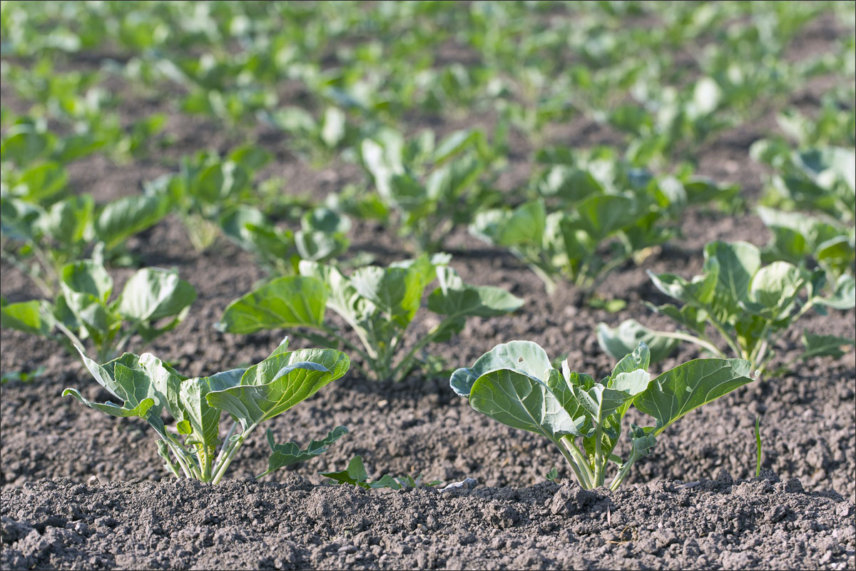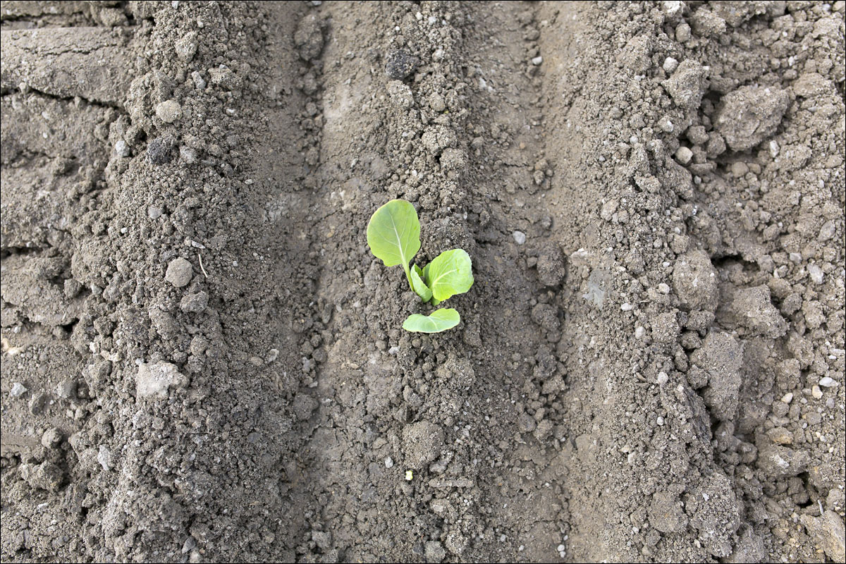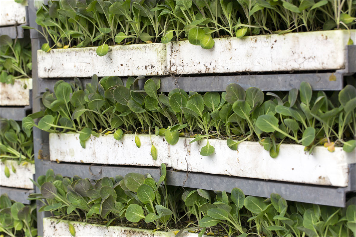 De jonge plantjes van de spruitkool worden gepoot en je ziet de groei van de planten gedurende het seizoen.