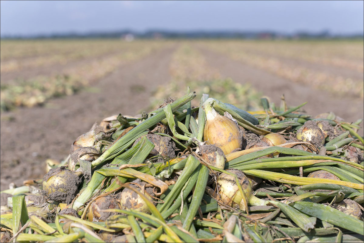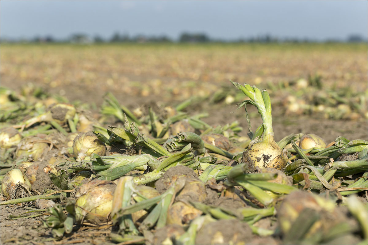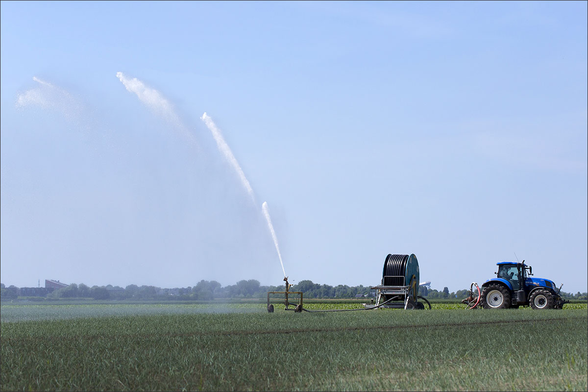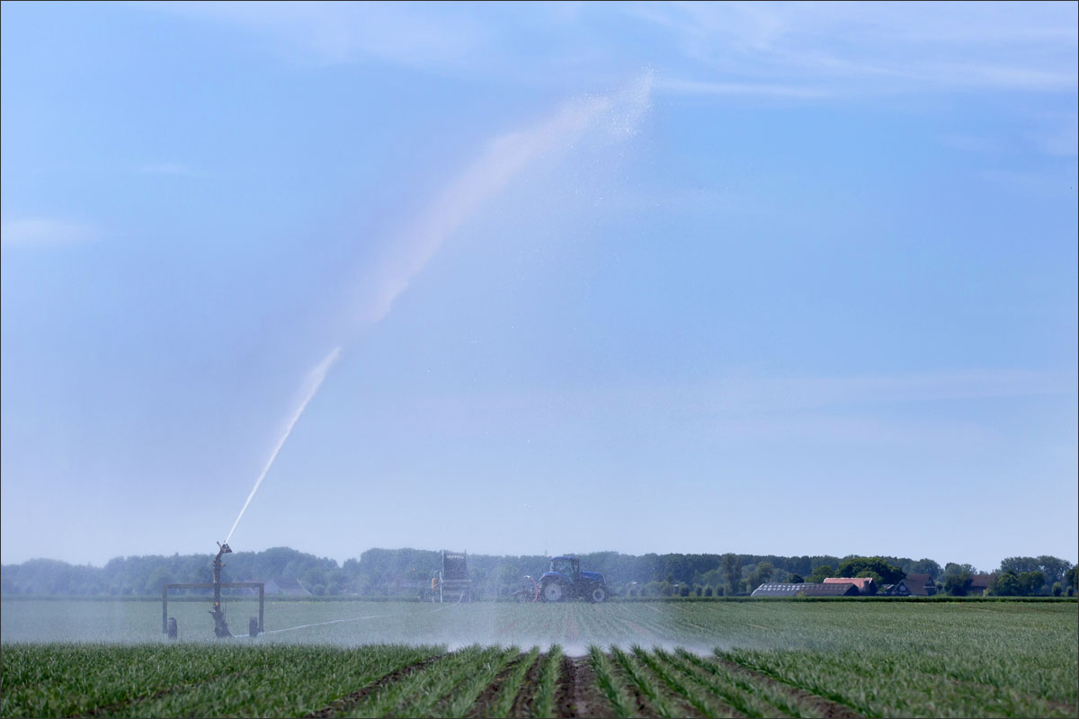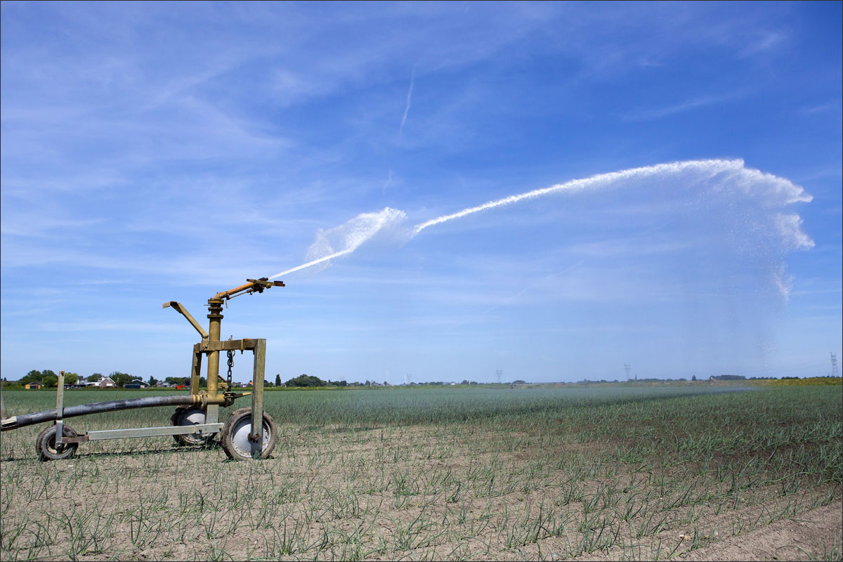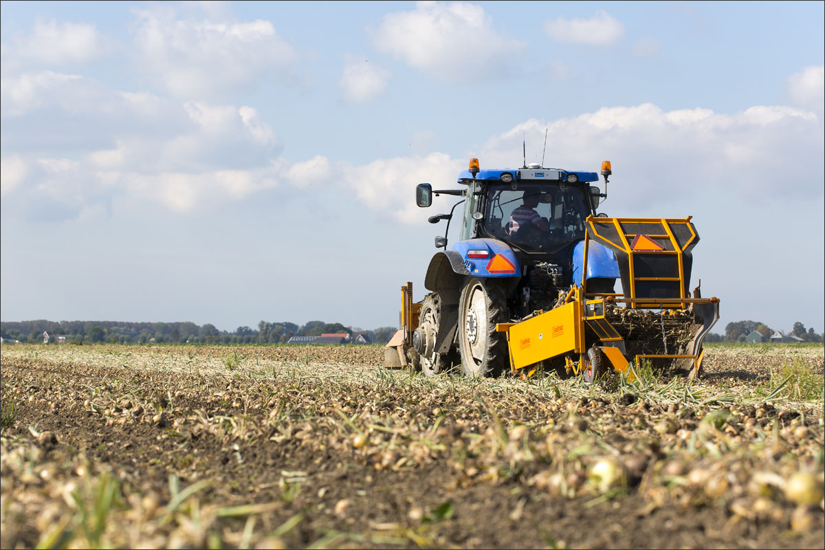 Foto’s van de teelt van uien, het zaaien & beregenen van de akker en het rooien van de uien.