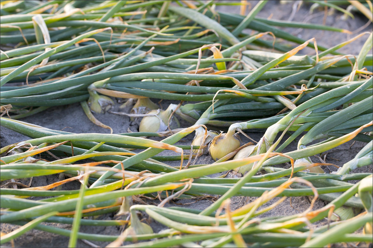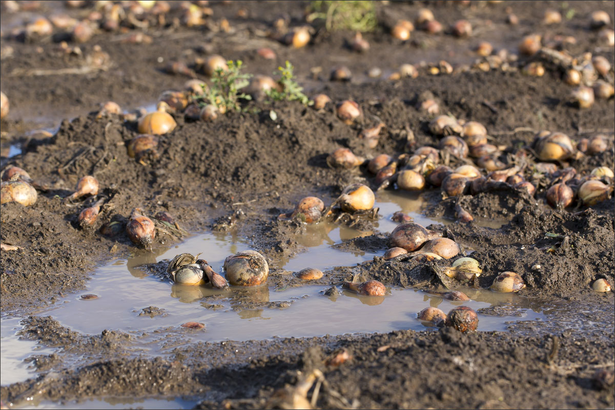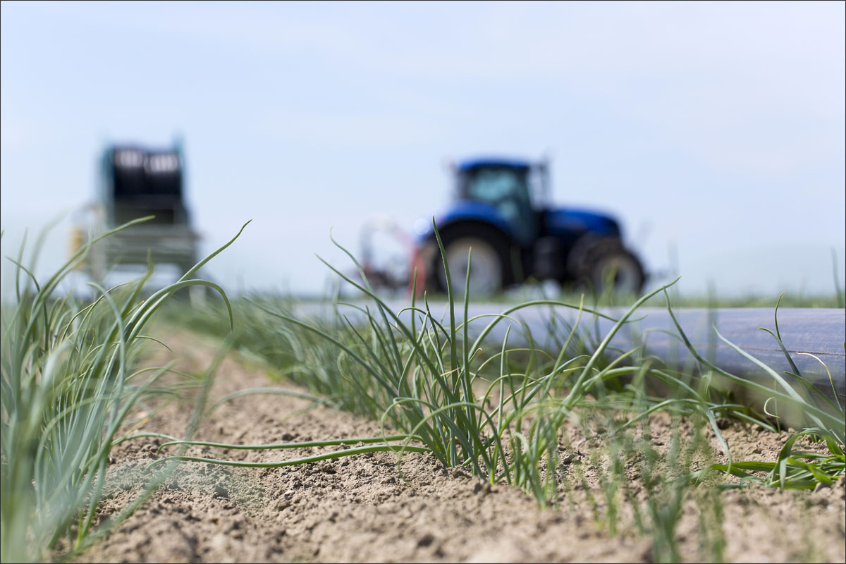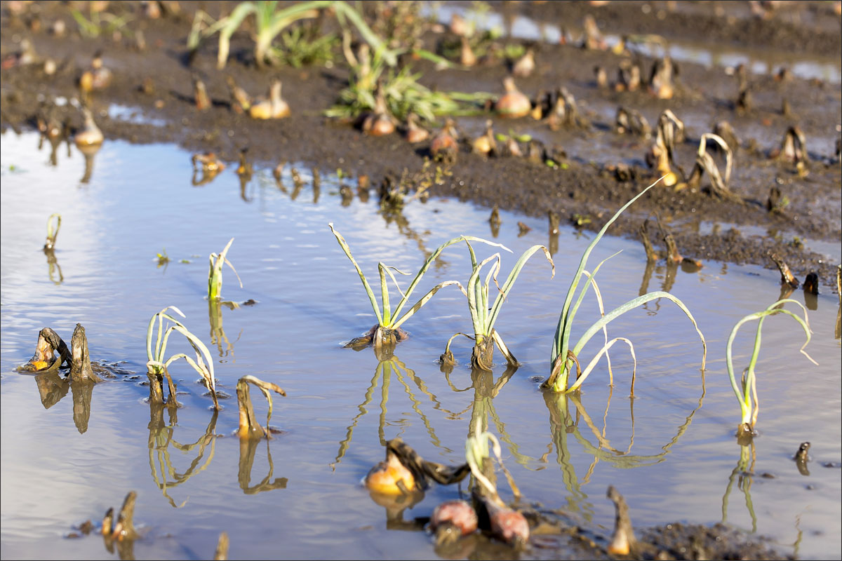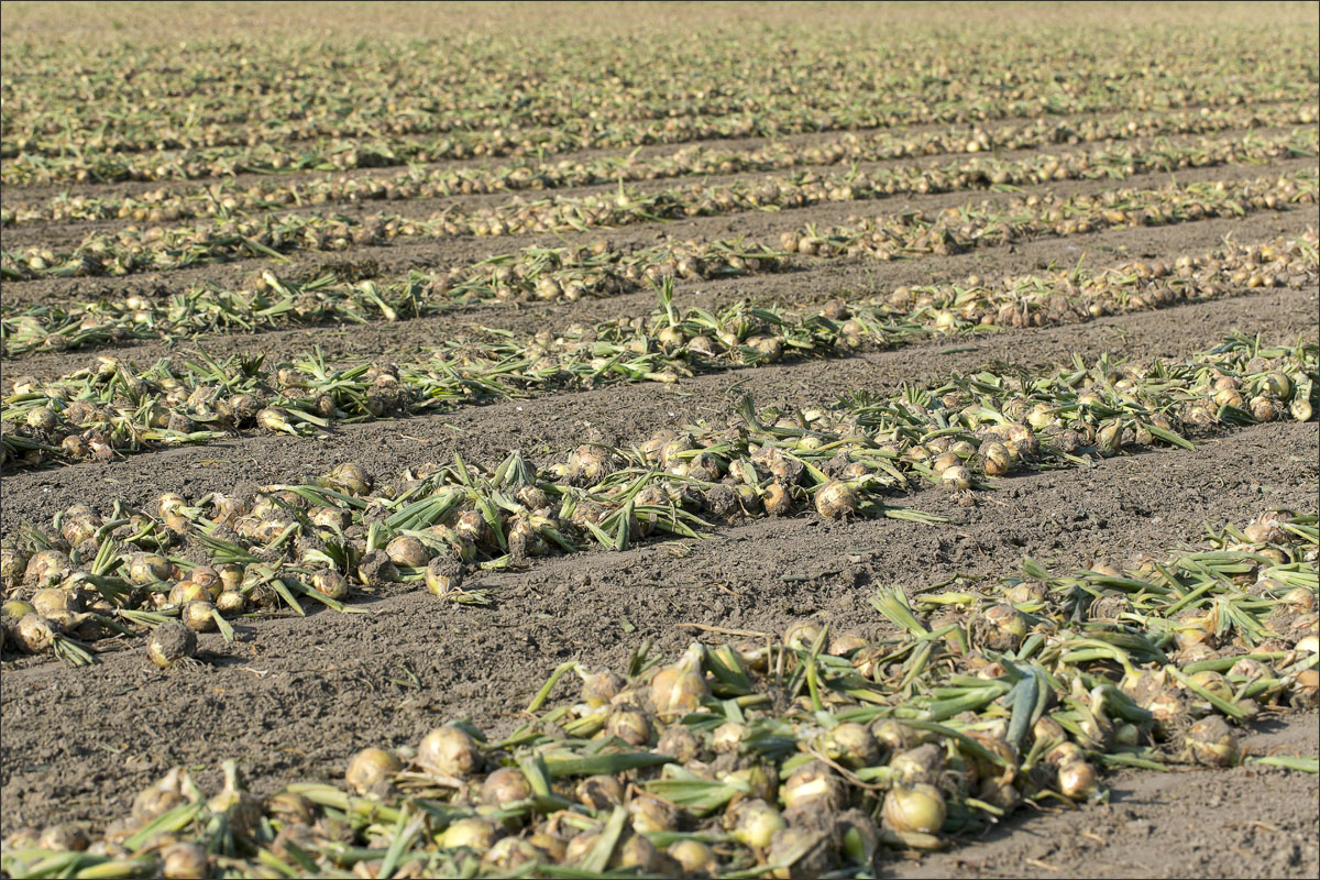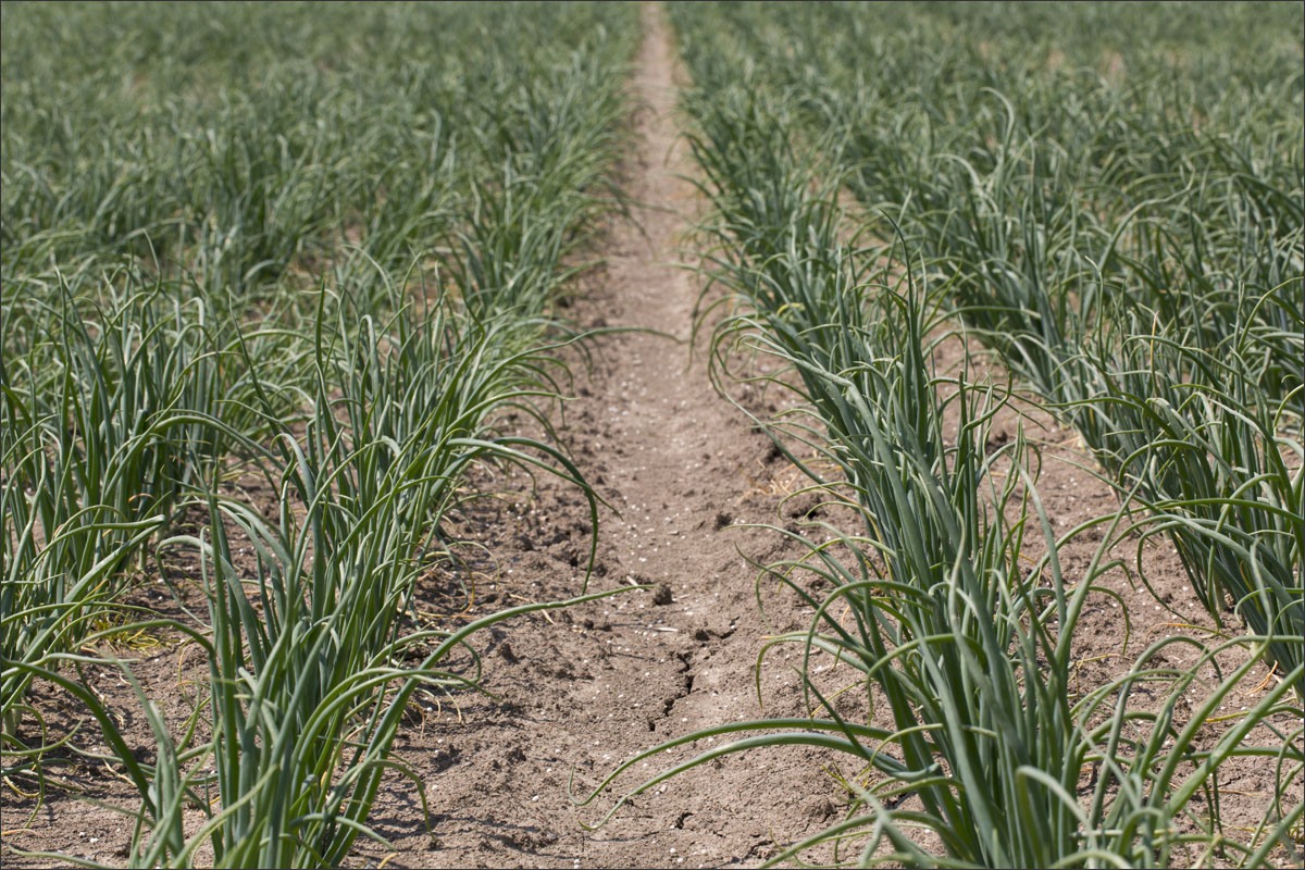 Foto’s van de teelt van uien, het zaaien & beregenen van de akker en het rooien van de uien.