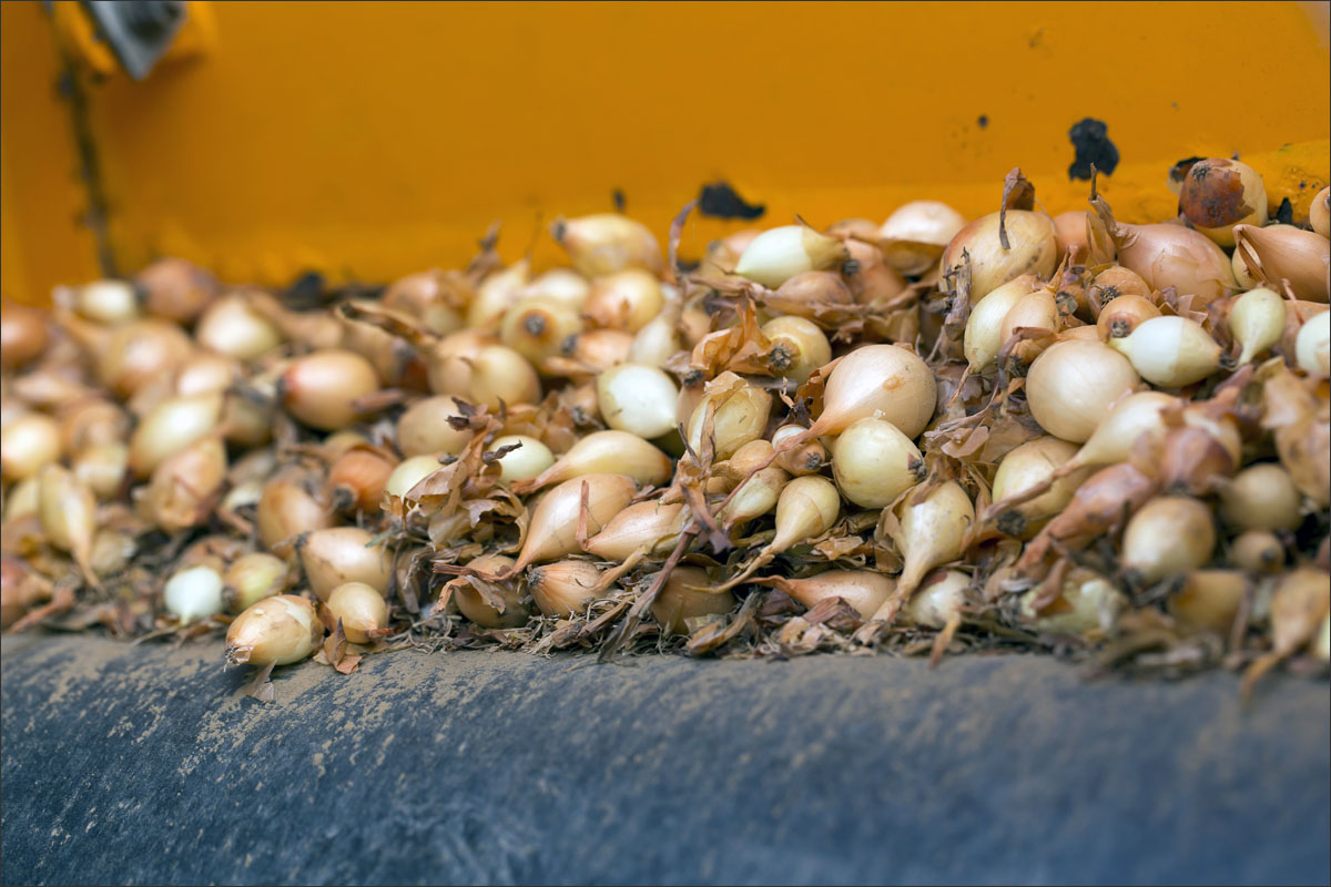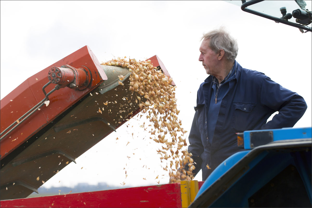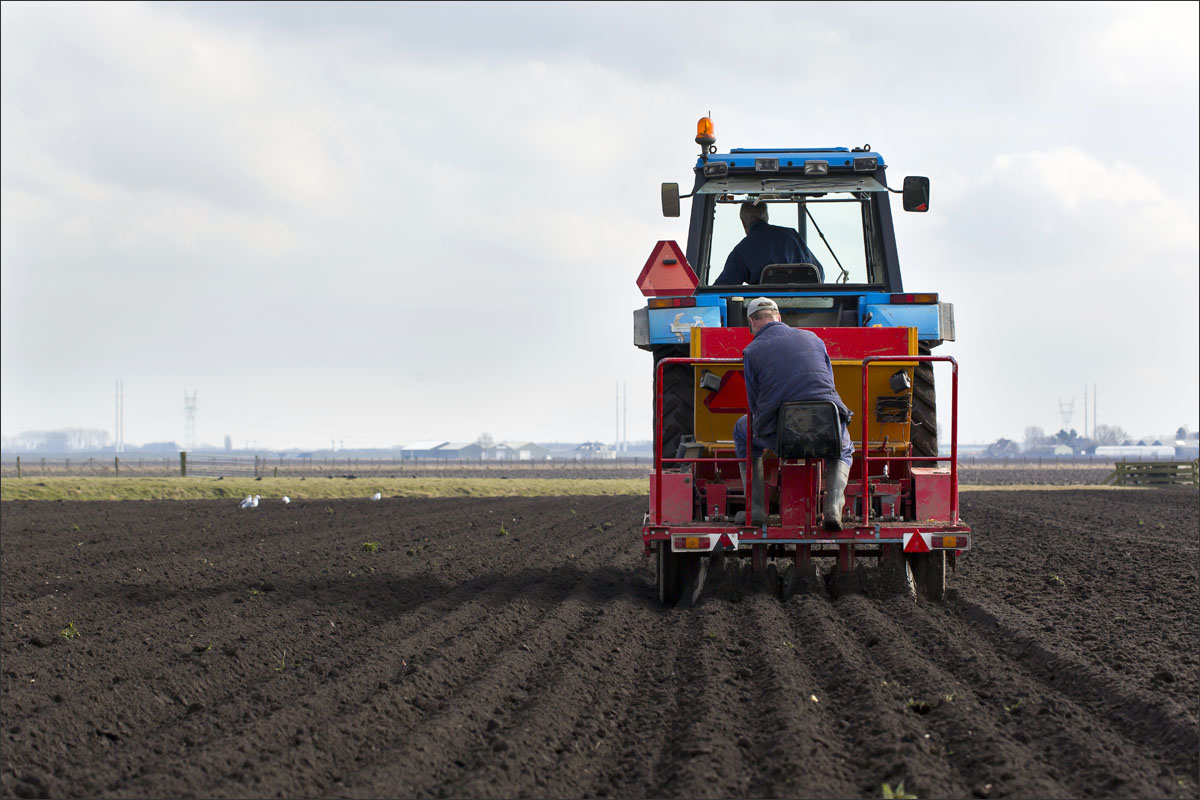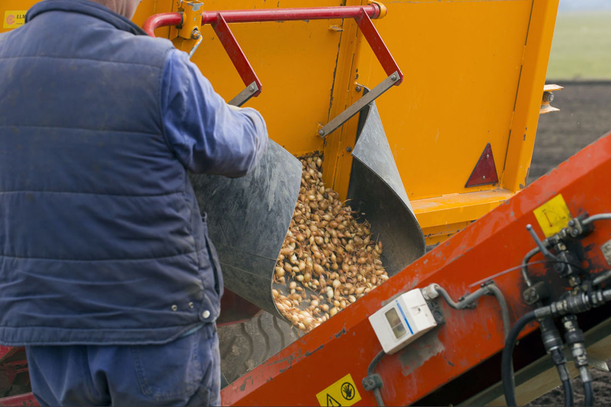 De uien worden geplant (gepoot) op een akker van akkerbouwbedrijf Zonneveld.
