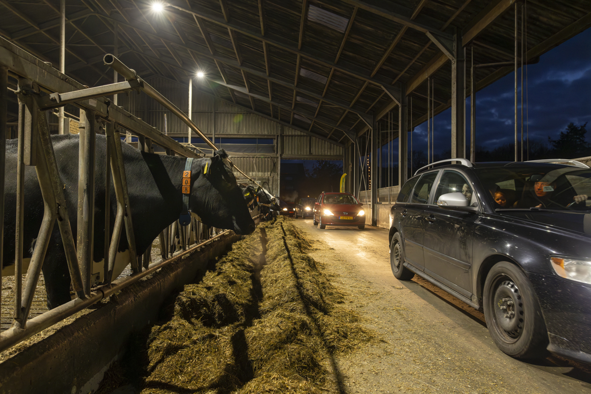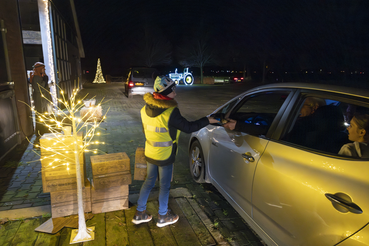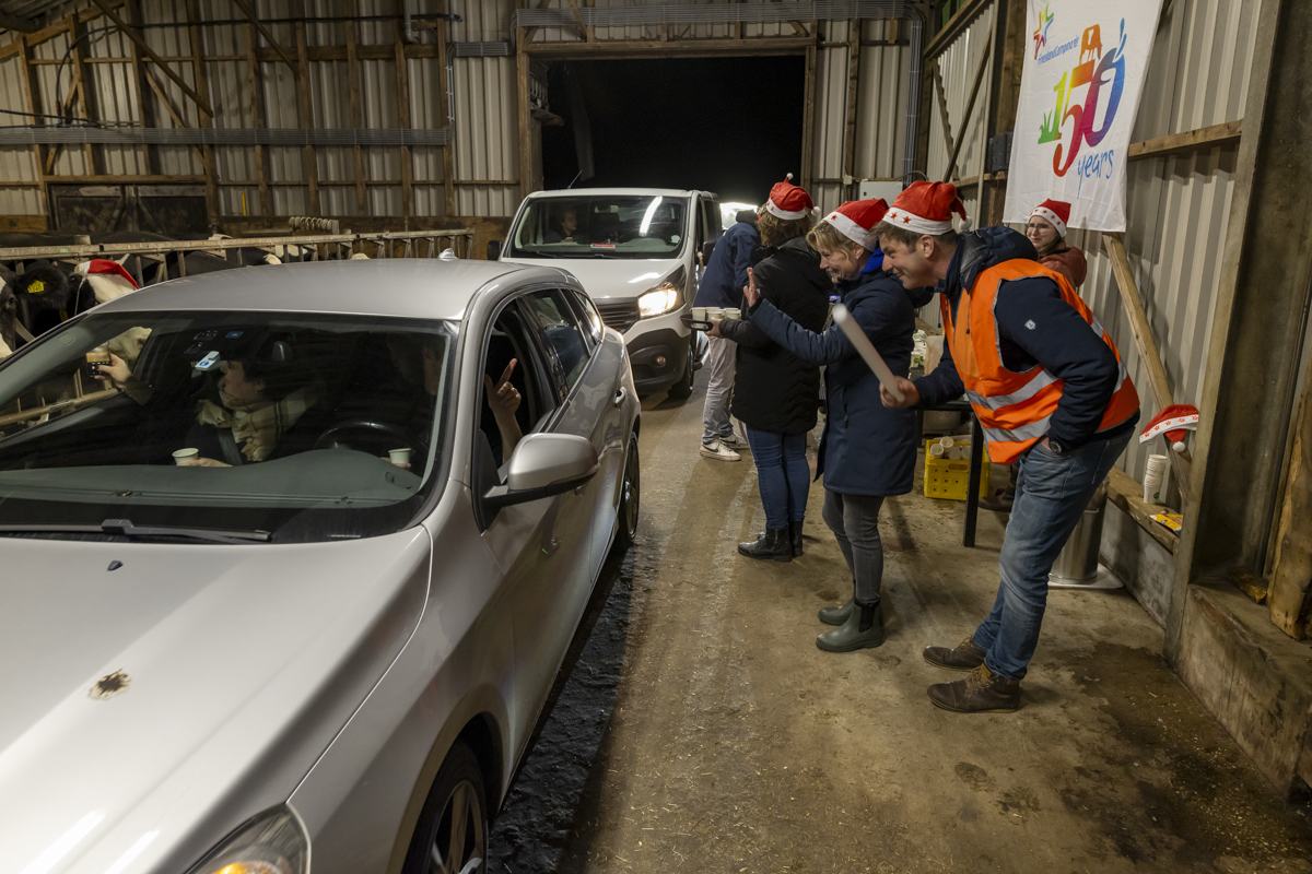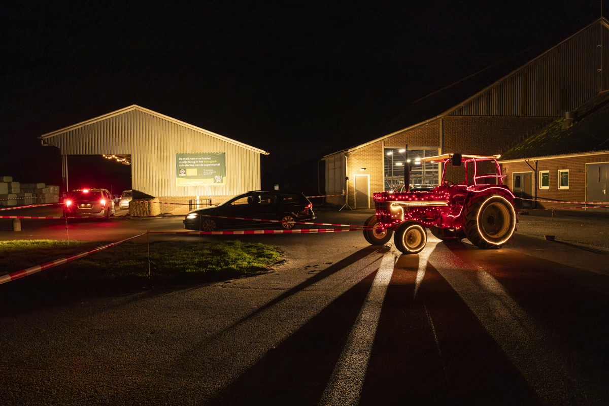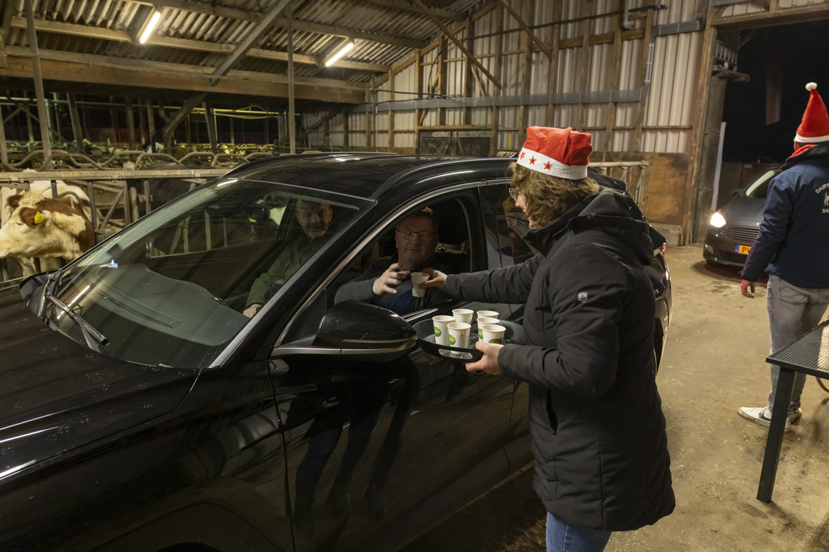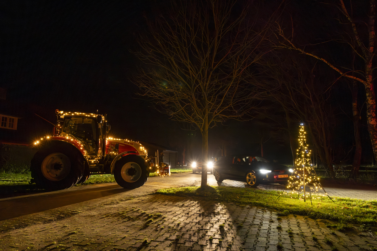 Zo’n 600 auto’s reden over kleine weggetjes en kavelpaden dwars door koeienstallen heen, langs woningen en over boerenerven in kerstsfeer.